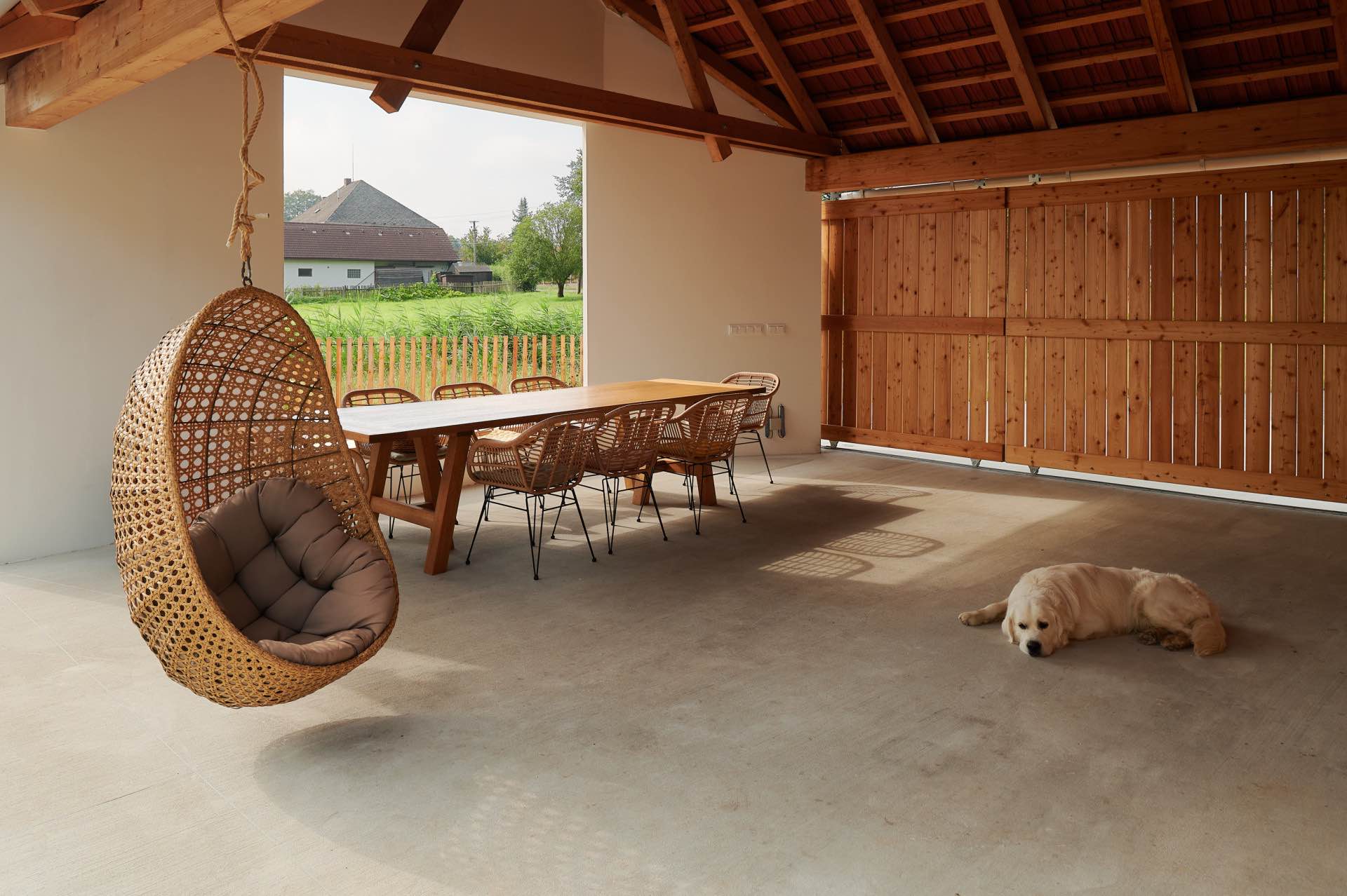 To przykład domu, który nie próbuje dominować krajobrazu, lecz dyskretnie się w niego wpisuje – nowoczesnego w funkcji, ale głęboko zakorzenionego w lokalnej tradycji.