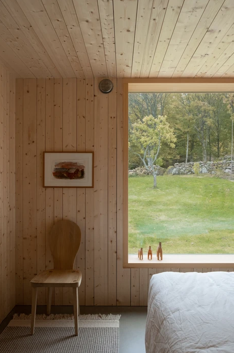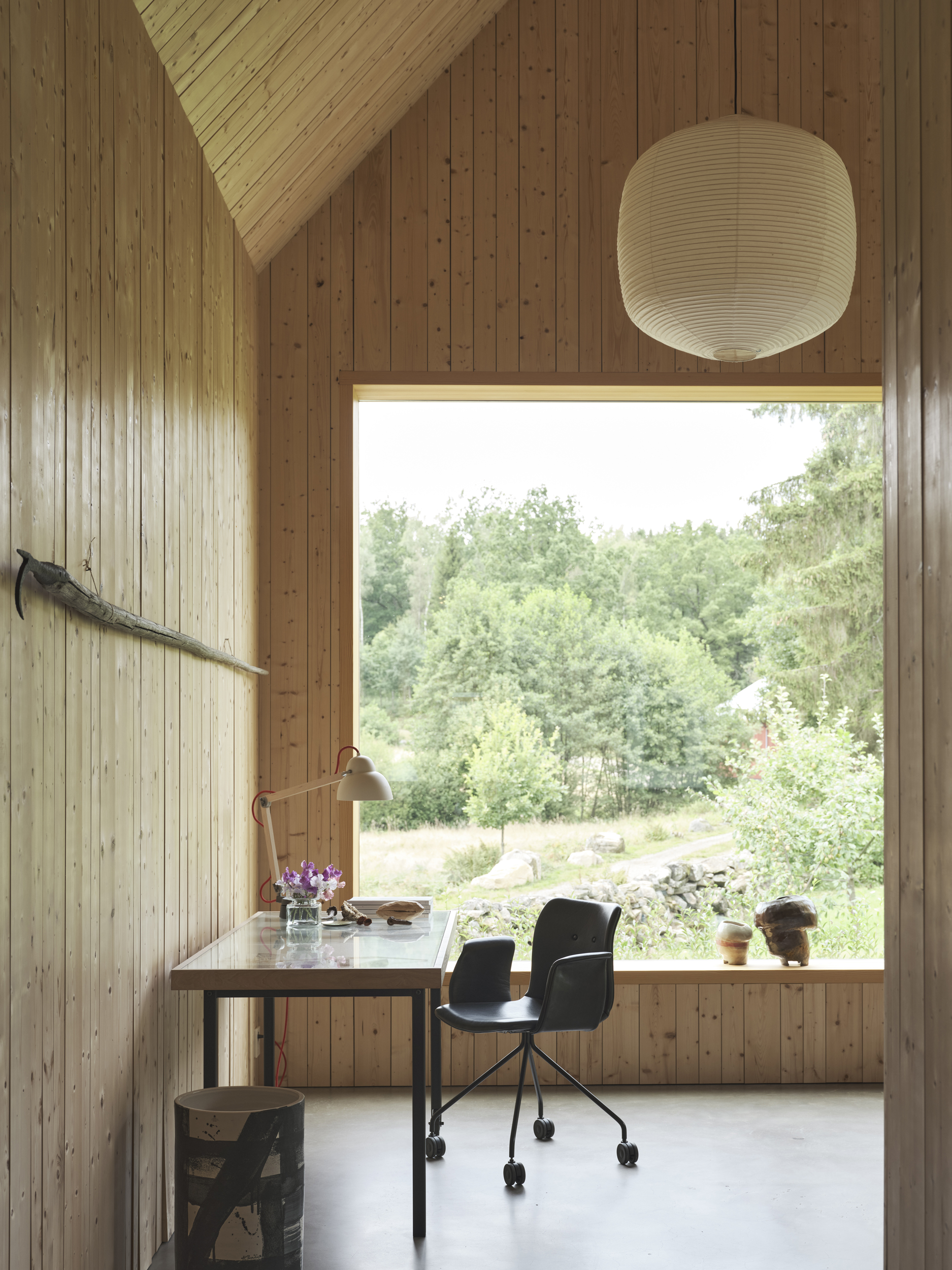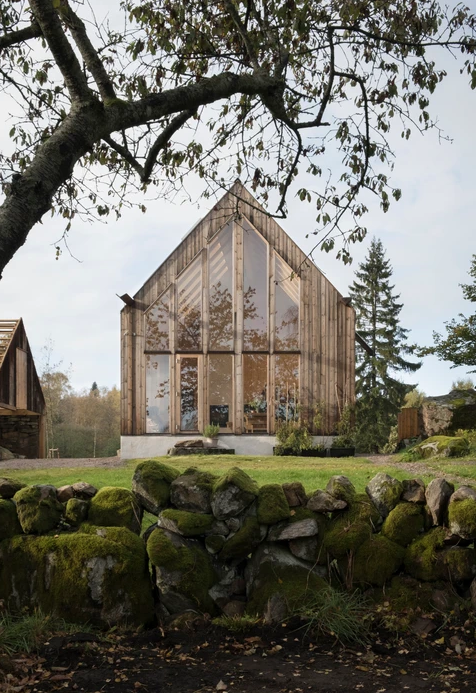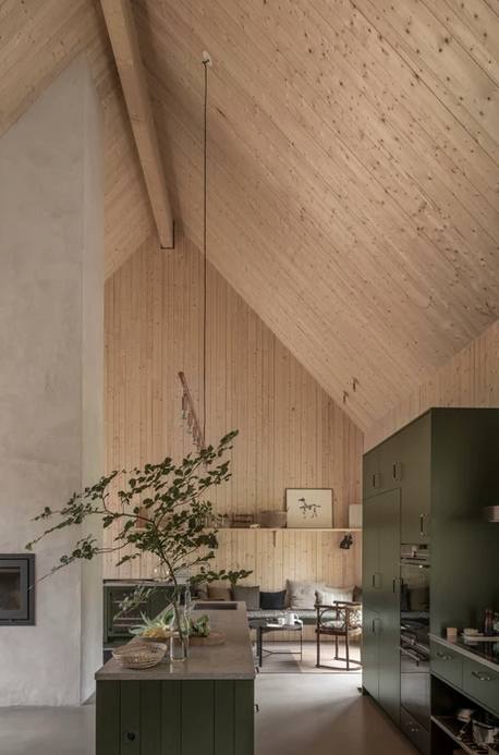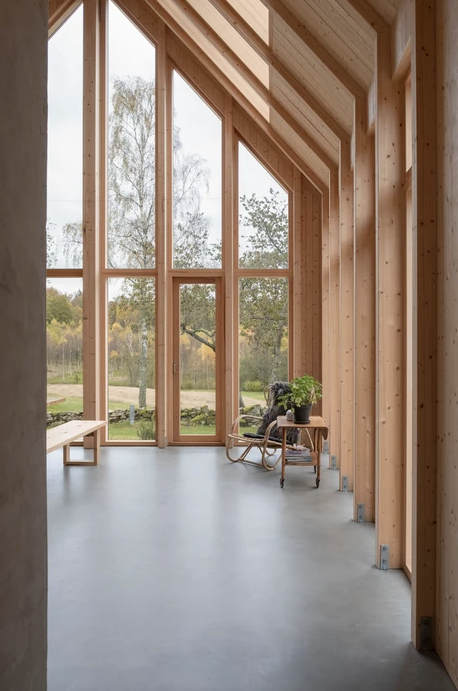 Skalowanie przestrzeni w budynkach pozwala na stworzenie zróżnicowanych doświadczeń. Główna bryła budynku dzieli przestrzenie na otwarte i zamknięte. W szklarni znajduje się przeszklona ściana, która wpuszcza do wnętrza zieleń ogrodu i lasu. Wysokie sufity sprawiają, że pokoje dzienne są przestronne i towarzyskie, a duże okna oferują piękne widoki. „Pomieszczenia w otwartych przestrzeniach nawiązują do lasu – wysokie, pionowe przestrzenie, w których korony drzew tworzą wewnętrzny sufit” – mówi Gipp.