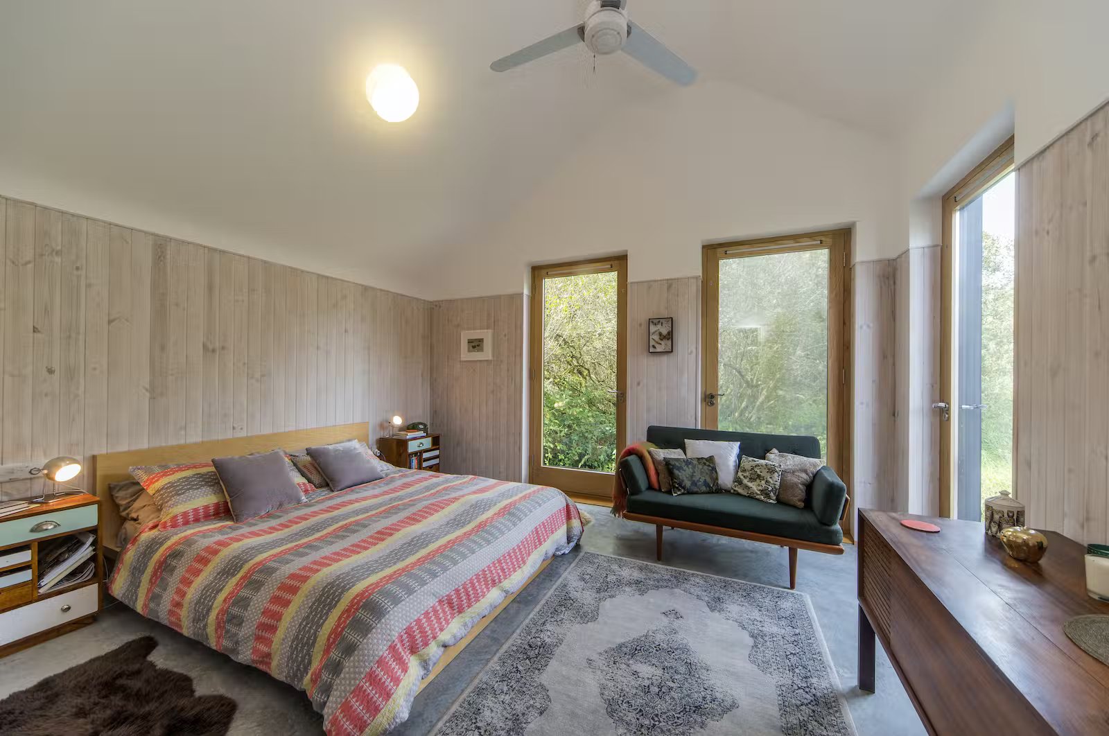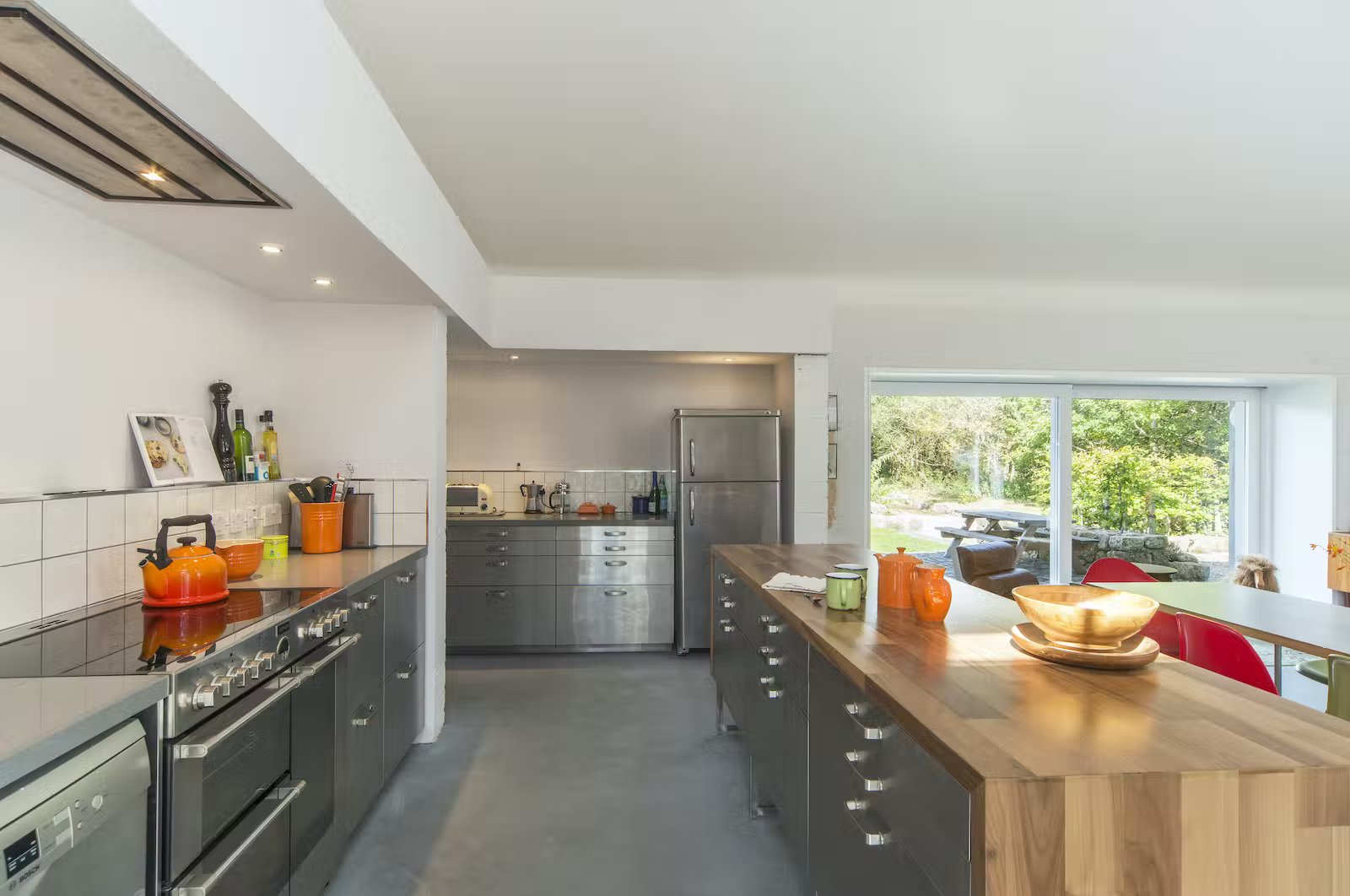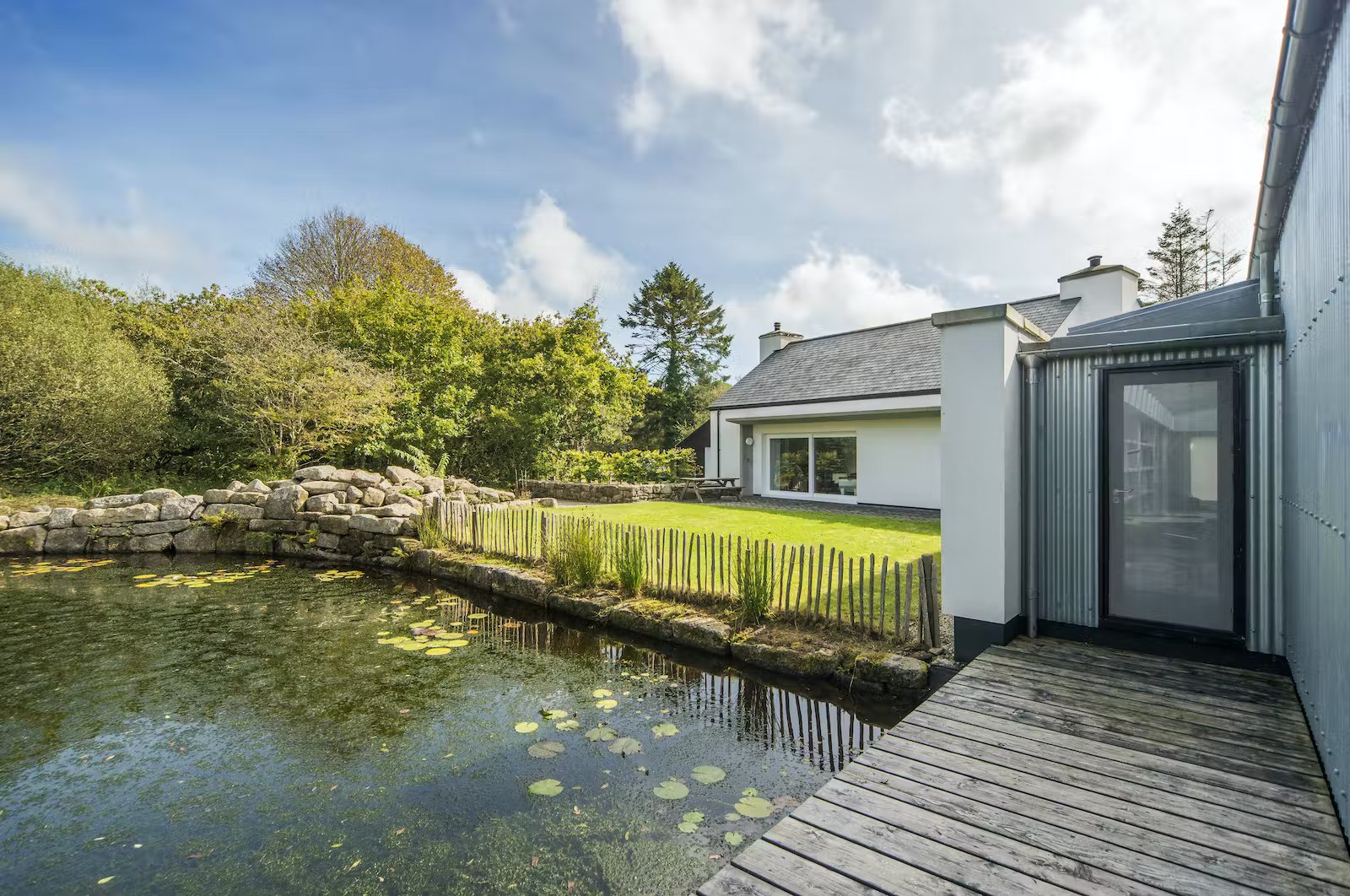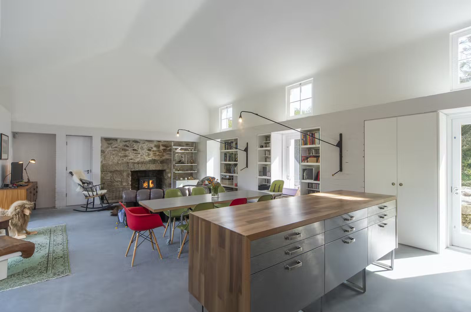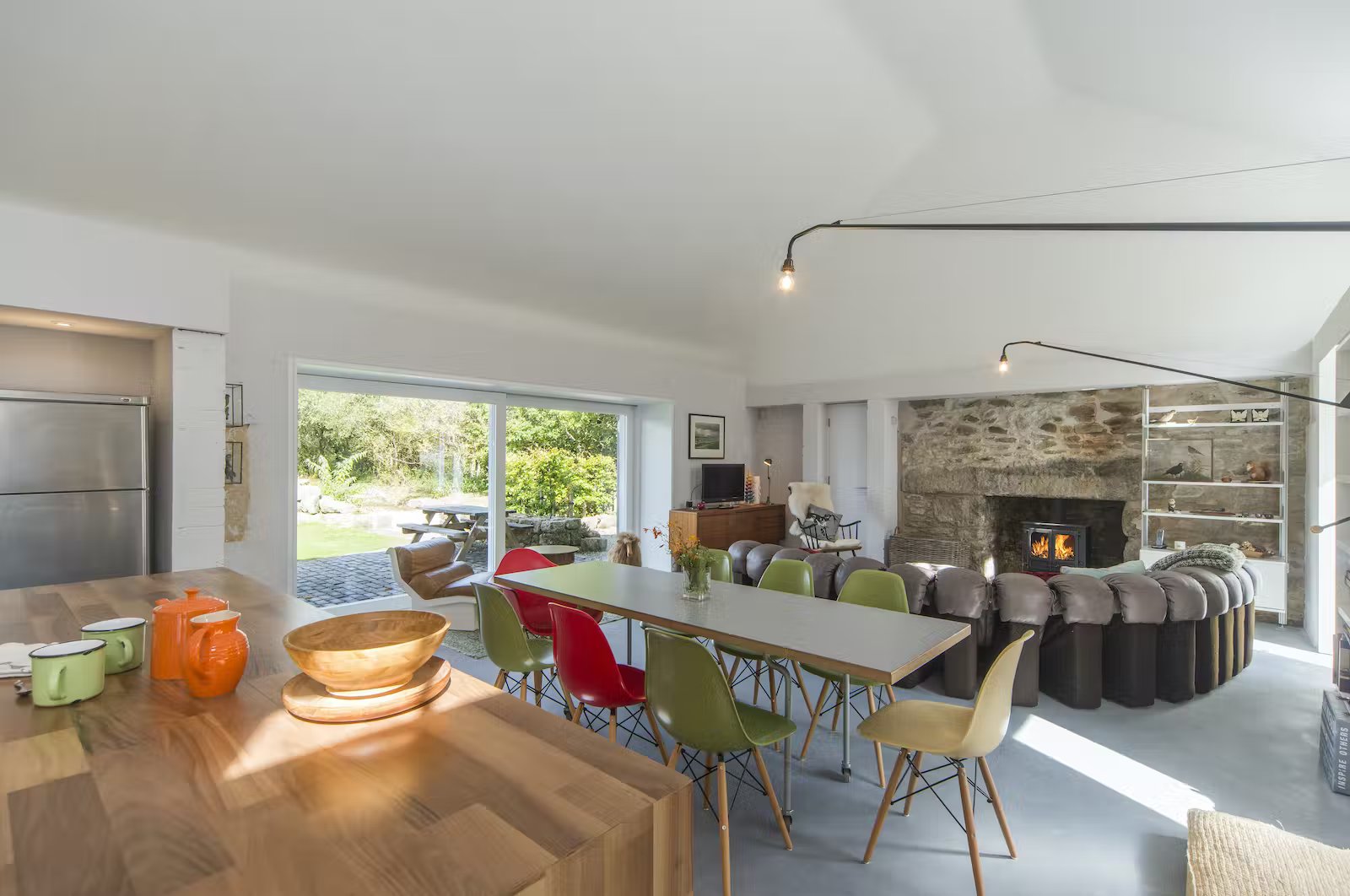 Wnętrza łączą styl vintage z industrialnym klimatem – nowa kuchnia o komercyjnym charakterze została wzbogacona o drewniany blat i akcenty w kolorze głębokiej pomarańczy, które ożywiają przestrzeń. Zachowano również fragmenty oryginalnej struktury – kamienną ścianę szczytową i piec opalany drewnem, które stanowią serce salonu. Metalowe lampy w stylu retro, jasna boazeria i panoramiczne drzwi balkonowe w głównej sypialni sprawiają, że dom jest jednocześnie przytulny, elegancki i w pełni zintegrowany z otaczającym krajobrazem Kornwalii. Rosedale to przykład, jak można połączyć historię, ekologię i współczesny design w jednym ponadczasowym projekcie.
