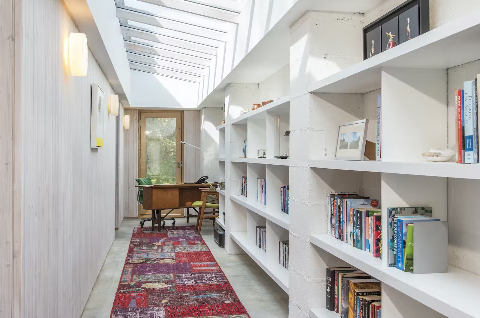 Podczas renowacji postawiono na ekologiczne rozwiązania. W Rosedale zainstalowano gruntową pompę ciepła, systemy fotowoltaiczne oraz solarne systemy grzewcze, co czyni dom w pełni energooszczędnym. W nowej części znalazły się cztery sypialnie, dwie łazienki i pomieszczenie gospodarcze. Dobudówka z asymetrycznym dwuspadowym dachem została zaprojektowana tak, by unosić się nad stawem ogrodowym, a jej forma nawiązuje do trendu, który doskonale opisuje pojęcie nowoczesna stodoła. Przeszklone łączenie między starą a nową częścią tworzy jasne przejście i prowadzi na balkon z widokiem na ogród i las.