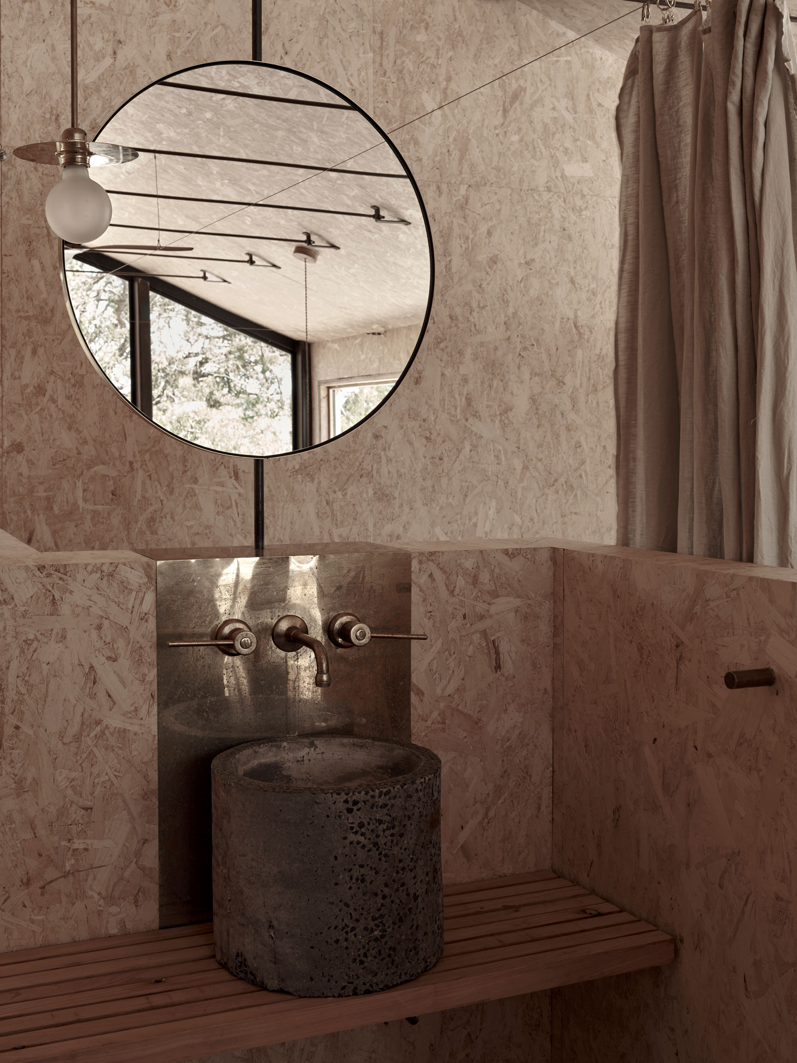 Zastosowane materiały – drewno, stal, beton, len, glina – pozostają w naturalnym, niemal surowym stanie. Ich starzenie się jest częścią zamysłu, podobnie jak ślady czasu widoczne w zachowanych fragmentach dawnych murów i więźby dachowej. Ta szczerość wobec materiału tworzy niezwykłą atmosferę – spokojną, zmysłową i głęboko zakorzenioną w miejscu.