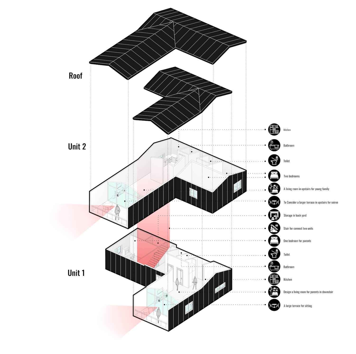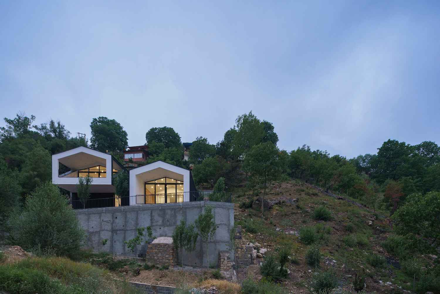 Głównym założeniem było stworzenie komfortowej przestrzeni dla dwóch pokoleń – z oddzielnymi strefami mieszkalnymi, ale z zachowaniem możliwości komunikacji między nimi. Obie bryły, choć wizualnie oddzielone z zewnątrz, są połączone wewnętrznie, co podkreśla rodzinny charakter inwestycji. Ważnym elementem projektu stał się taras widokowy, z którego rozpościera się spektakularny widok na górę Damavand, będącą jednym z najbardziej rozpoznawalnych szczytów Iranu. Projekt wpisuje się w trend zrównoważonego projektowania – dom integruje się z otoczeniem, minimalizując ingerencję w krajobraz, a jego forma odzwierciedla zarówno potrzeby użytkowników, jak i uwarunkowania naturalne.