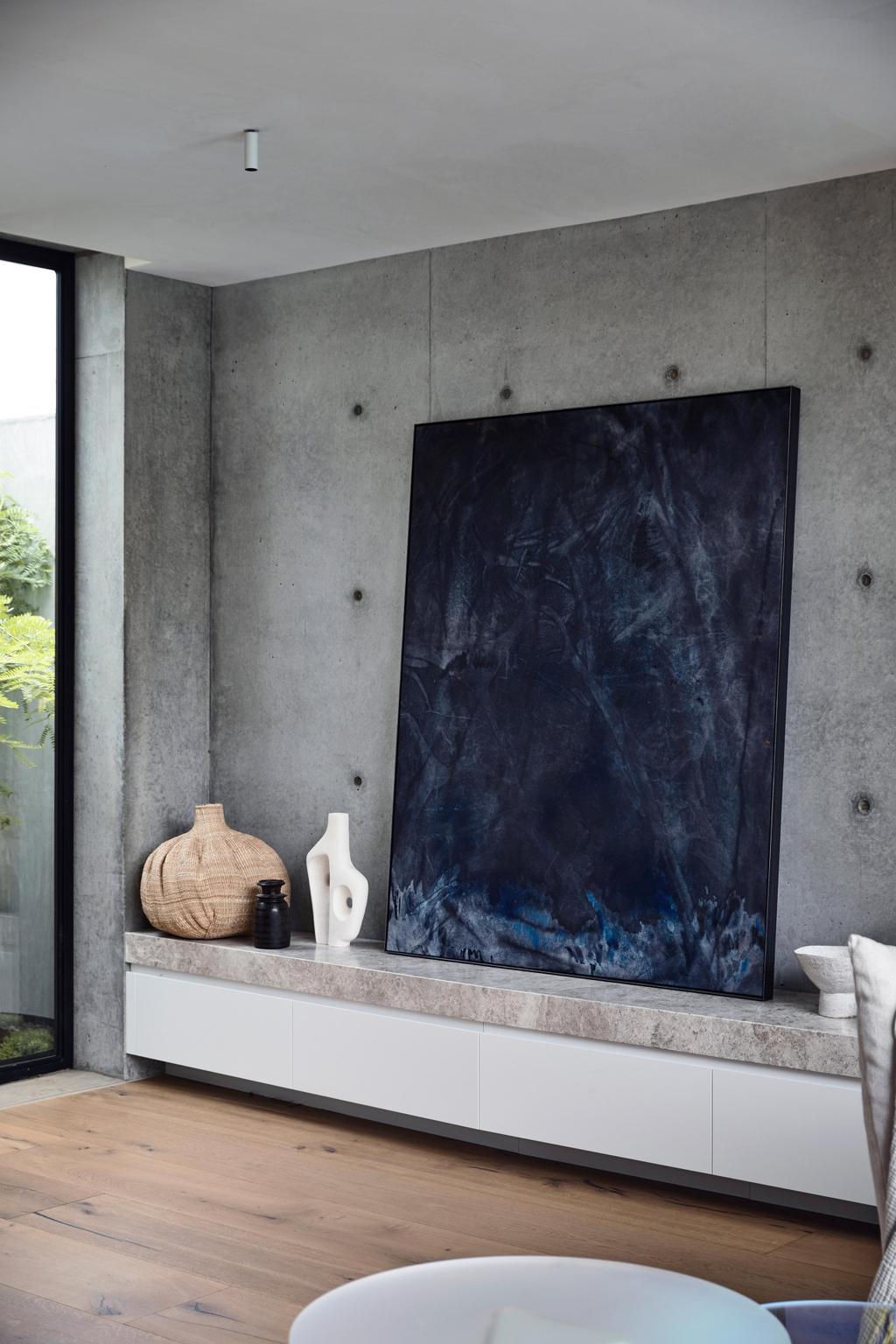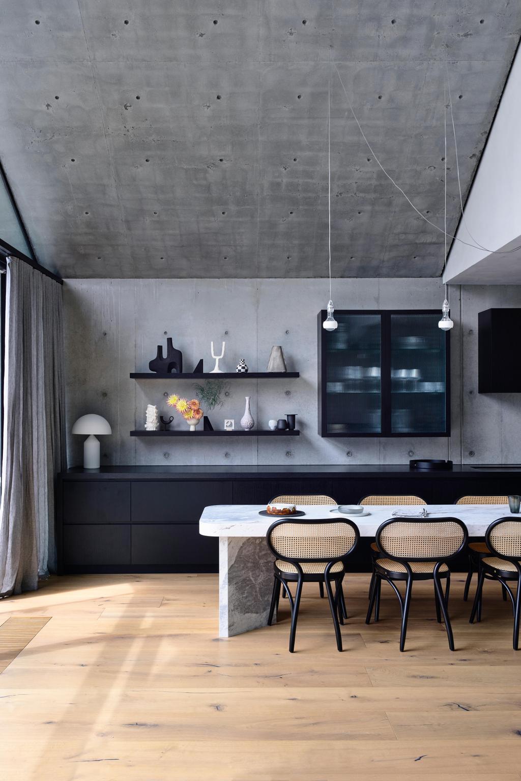 Głównym materiałem konstrukcyjnym nowej części stał się surowy beton, który wprowadza trwałość i wytrzymałość – niezbędne przy trójce dzieci – ale także wizualną miękkość, współgrającą z kobiecą wrażliwością Jane. Centralnym punktem strefy dziennej jest długa wyspa kuchenna, która pełni funkcję wielozadaniowego centrum życia rodzinnego – od posiłków po zabawy dzieci czy pracę zdalną.