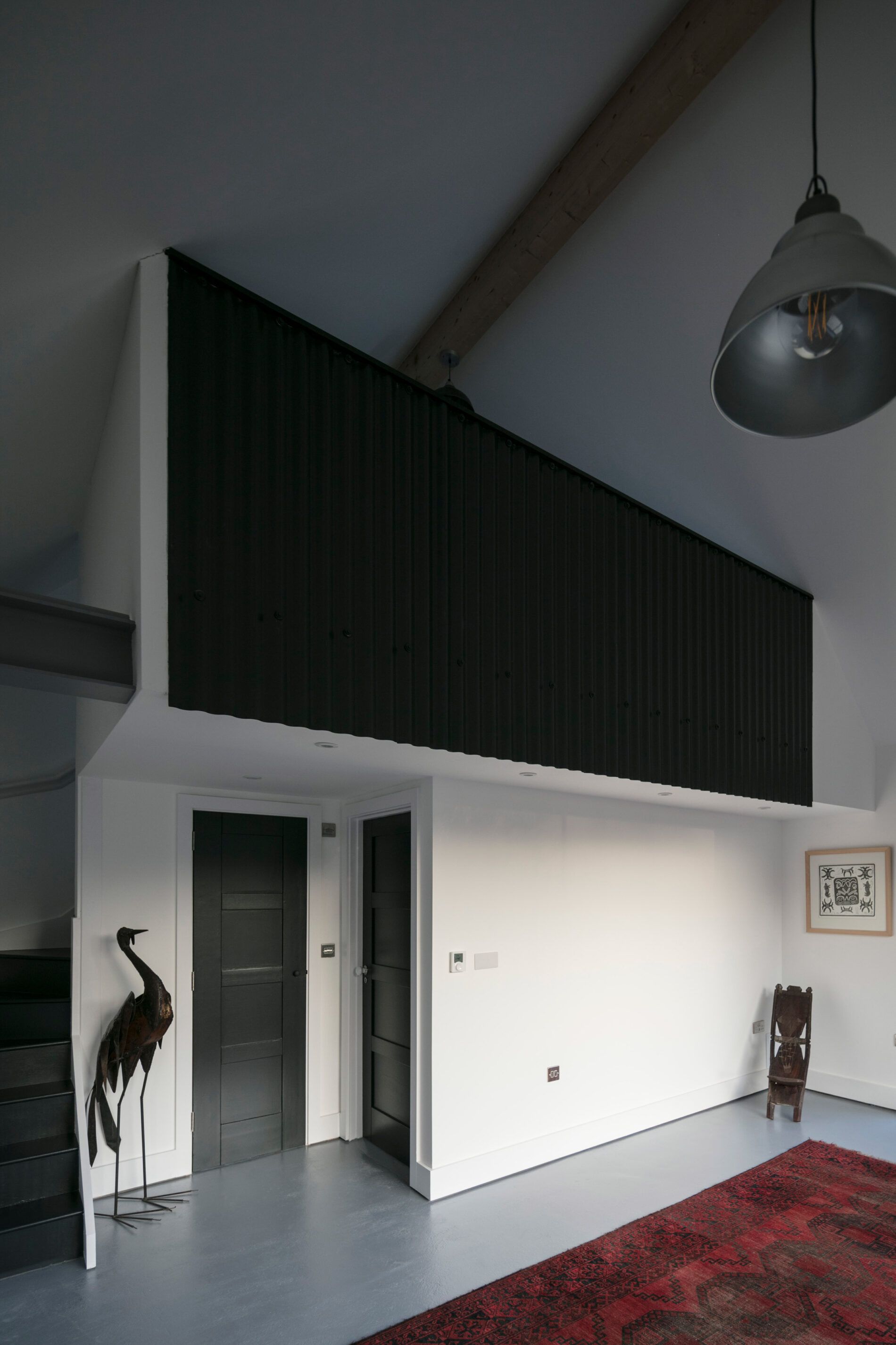 Zastosowanie falistej blachy miało nie tylko walor estetyczny, ale i praktyczny – materiał ten nie wymaga konserwacji przez co najmniej 30 lat i znacząco przyspieszył budowę, umożliwiając jej realizację w zaledwie dwa dni. Nowa przestrzeń to prosta forma z podwójną wysokością i antresolą, której wnętrze zachowuje minimalistyczny, surowy styl inspirowany wiejską architekturą użytkową. Przeszklone przejście z płaskim dachem łączy starą część domu z nową, oferując widoki na ogród i tylne partie posesji. Całość projektu stanowi nowoczesne, funkcjonalne podejście do adaptacji i rozbudowy zabudowań wiejskich, wpisując się w trend łączenia tradycji z nowoczesnością w harmonii z krajobrazem.