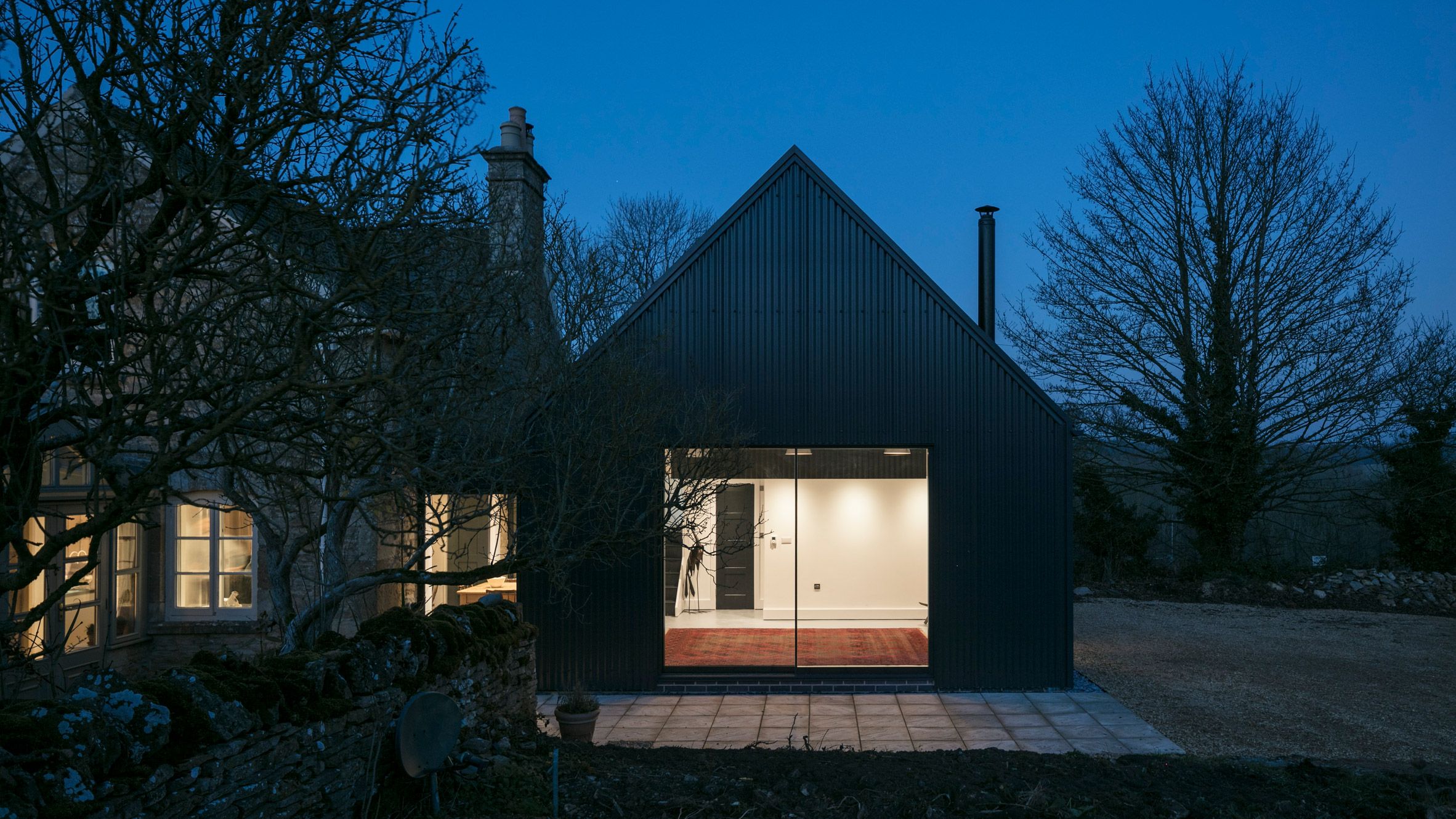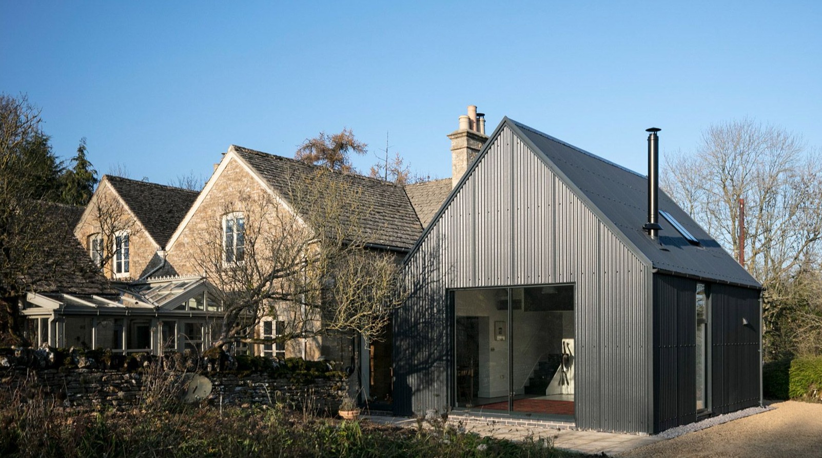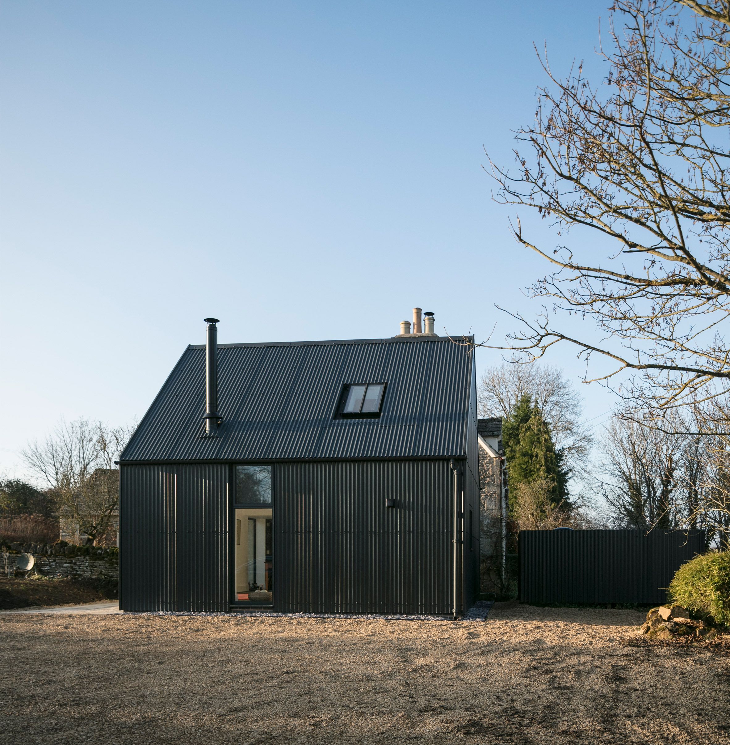 Nowa część domu została cofnięta względem oryginalnej bryły, by symbolicznie oddać pierwszeństwo pierwotnemu, kamiennemu budynkowi. Ciemnoszary kolor elewacji z metalu celowo dobrano, by minimalizować wizualny wpływ na otaczający krajobraz wiejski i podkreślić szacunek wobec lokalnej architektury. Duże przeszklenia otwierają dom na rozległe widoki, w tym na teren z wybiegiem dla koni, który właściciele zakupili kilka lat wcześniej. Wcześniej trudno było go dostrzec z wnętrza domu, jednak dzięki nowemu układowi przestrzennemu codzienne życie domowników zyskało zupełnie nową jakość – bliskość z naturą stała się namacalna i integralna.