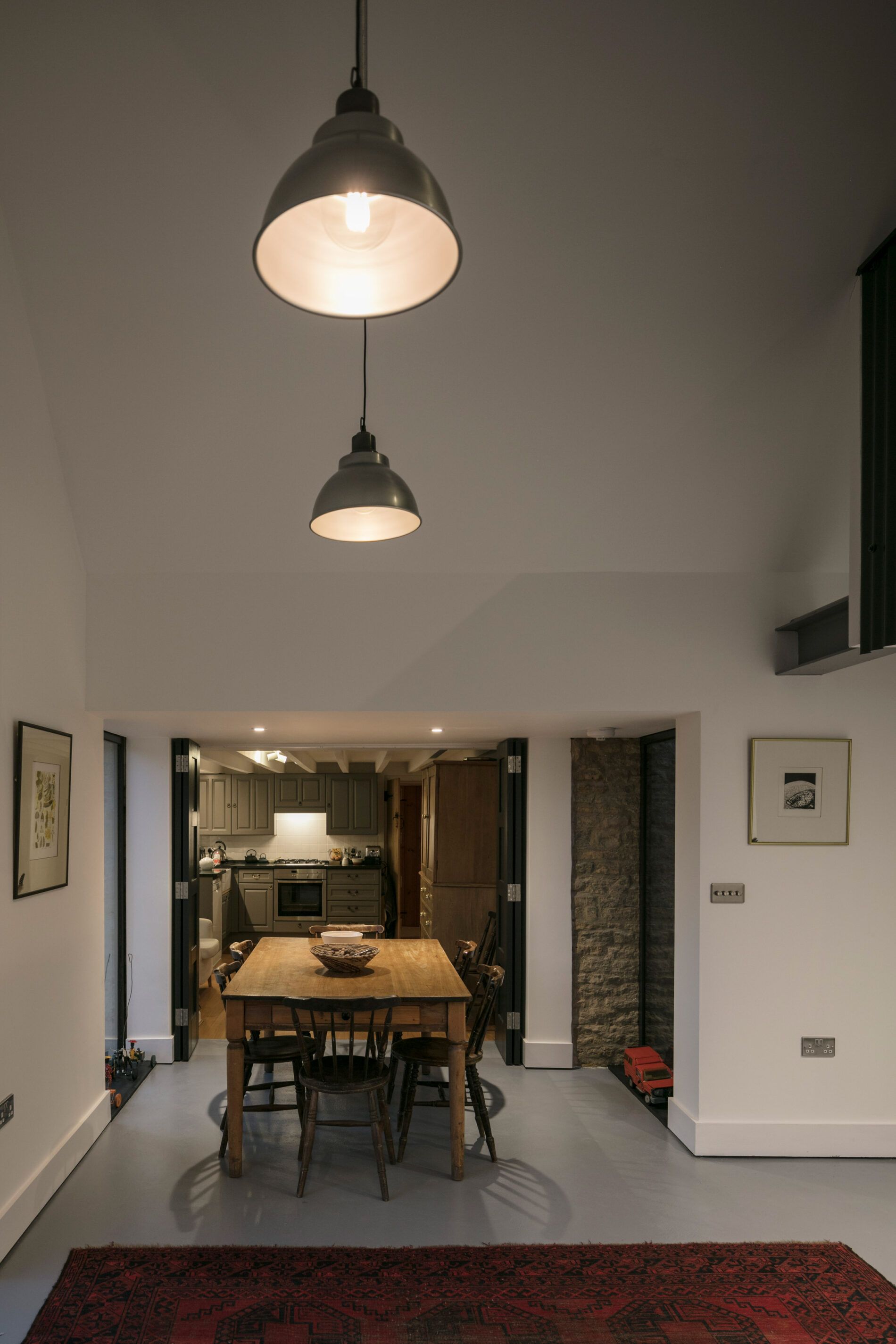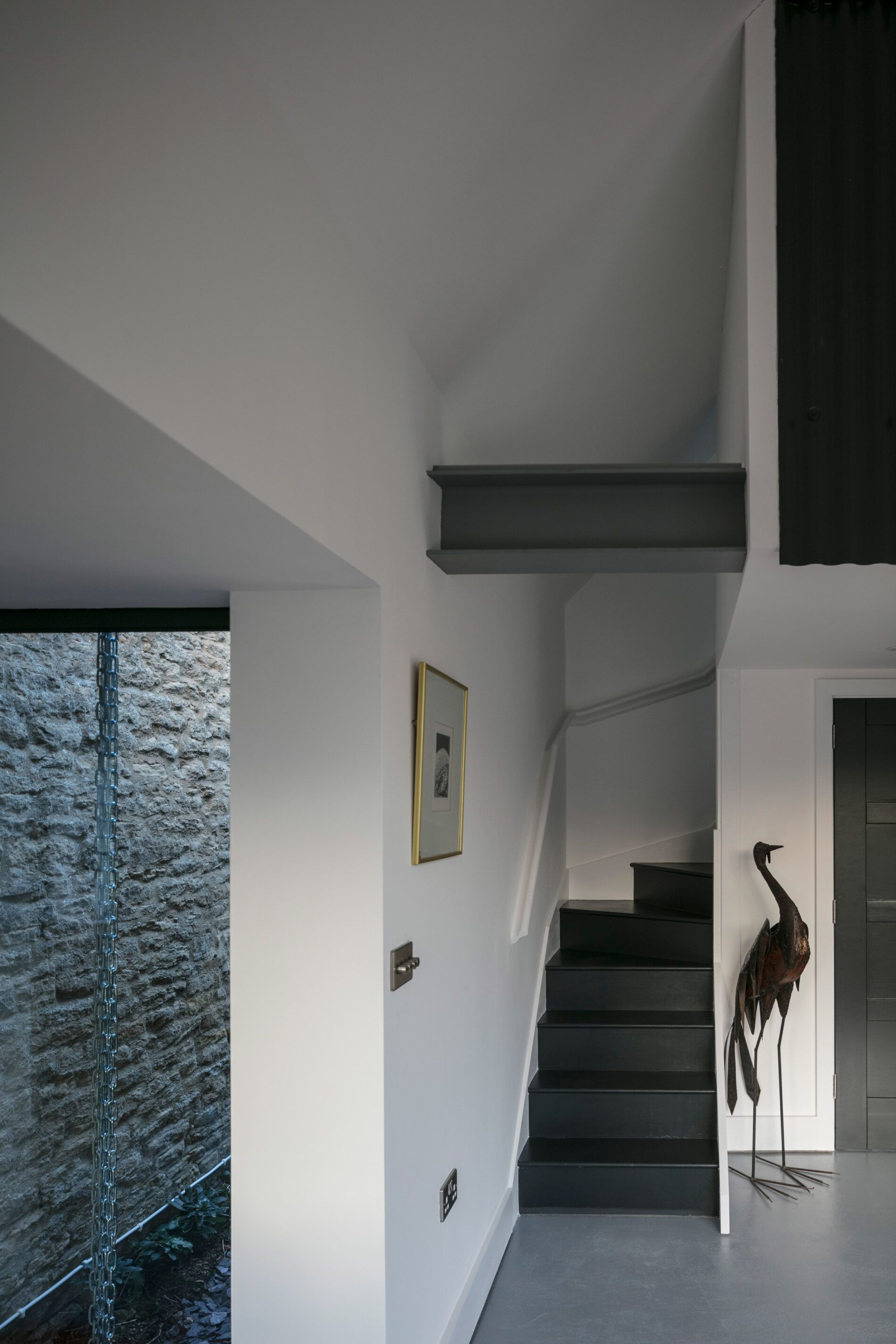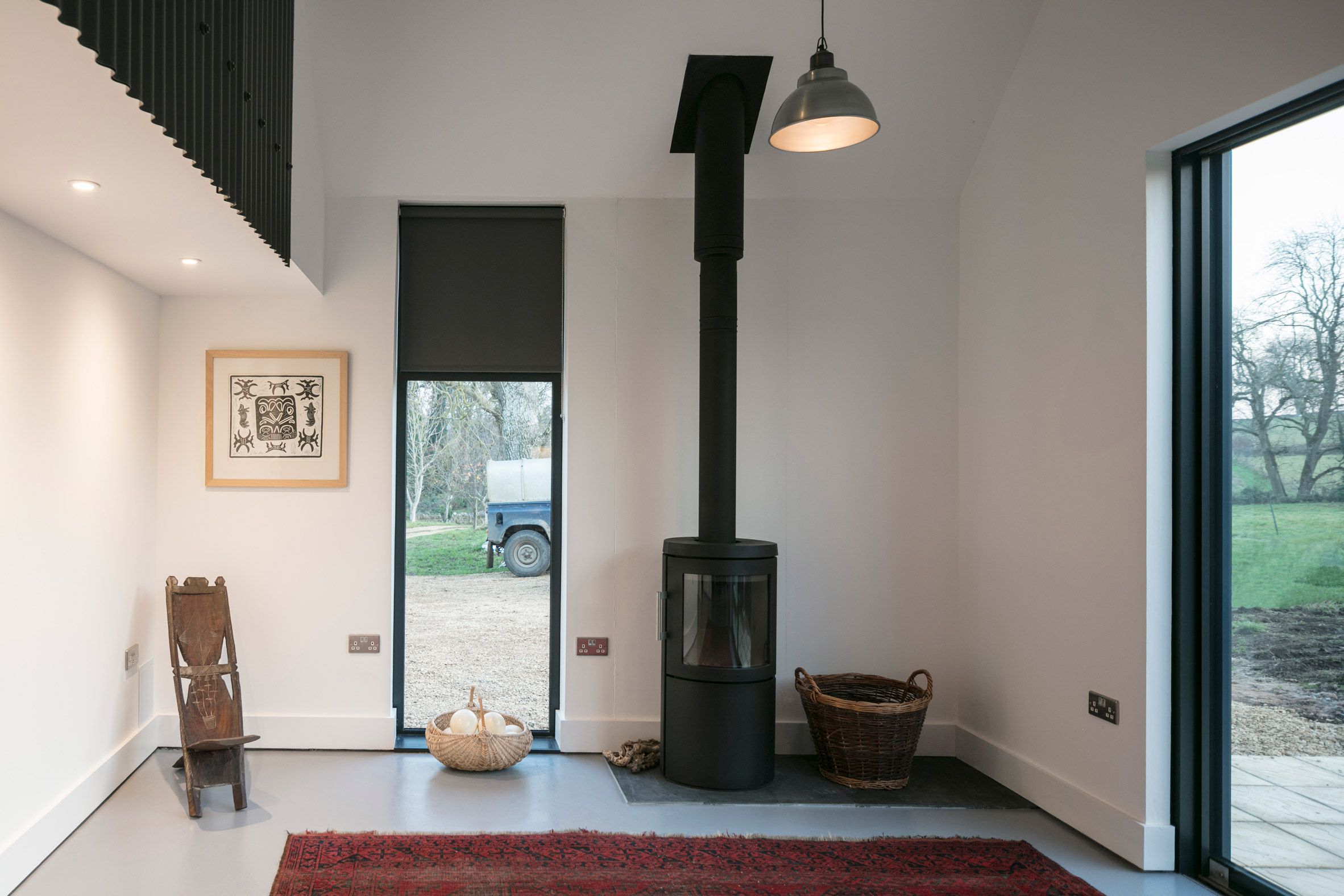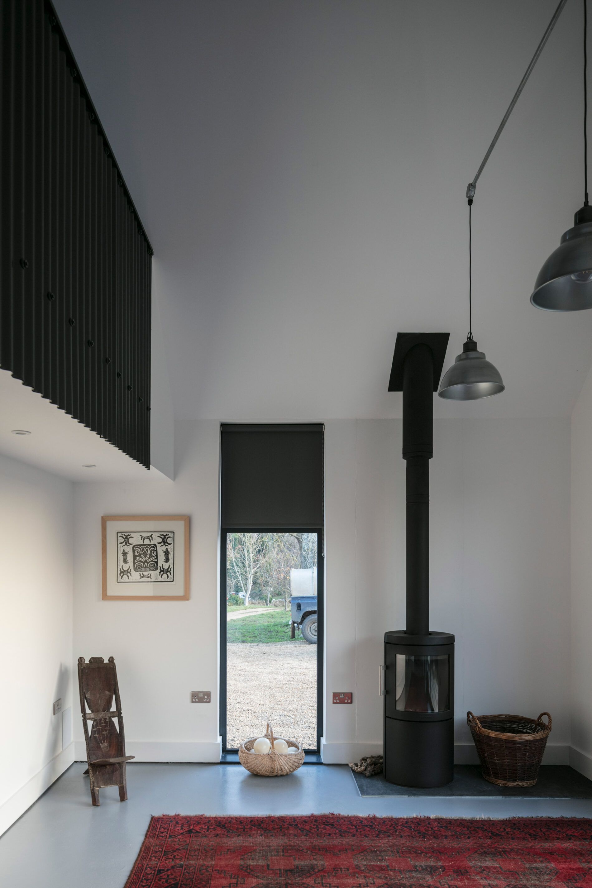 Nowa część domu została cofnięta względem oryginalnej bryły, by symbolicznie oddać pierwszeństwo pierwotnemu, kamiennemu budynkowi. Ciemnoszary kolor elewacji z metalu celowo dobrano, by minimalizować wizualny wpływ na otaczający krajobraz wiejski i podkreślić szacunek wobec lokalnej architektury. Duże przeszklenia otwierają dom na rozległe widoki, w tym na teren z wybiegiem dla koni, który właściciele zakupili kilka lat wcześniej. Wcześniej trudno było go dostrzec z wnętrza domu, jednak dzięki nowemu układowi przestrzennemu codzienne życie domowników zyskało zupełnie nową jakość – bliskość z naturą stała się namacalna i integralna.