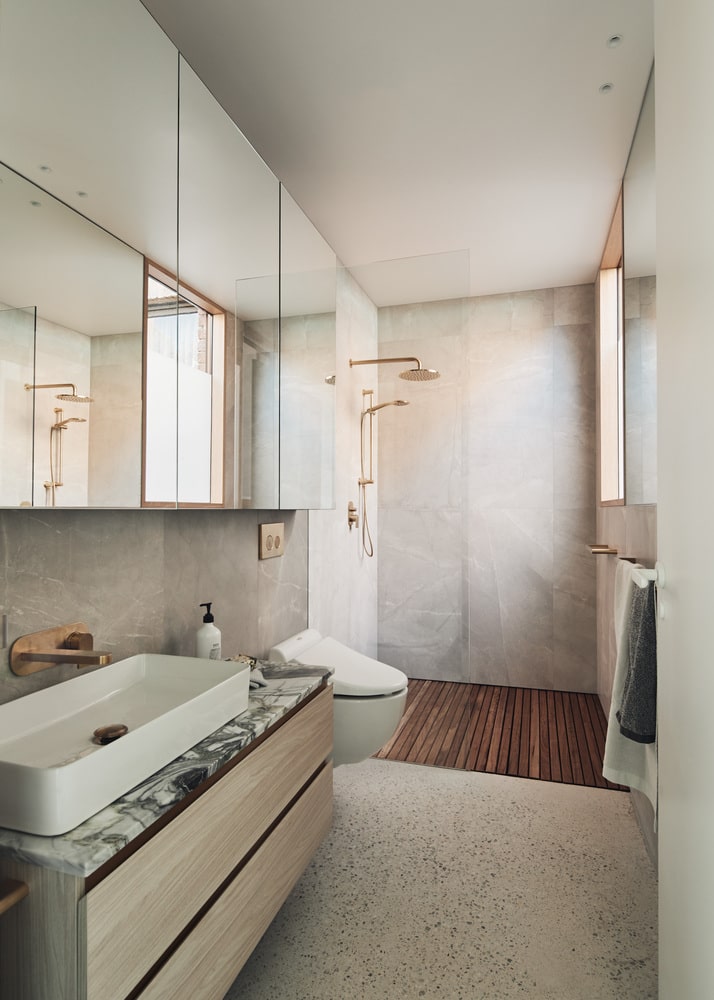 Wnętrze Lantern House urządzono w duchu naturalnego minimalizmu – dominują tu neutralne kolory, ciepłe drewno, kamień i szlachetne faktury, które wspólnie tworzą atmosferę dziennego spa. Otwartość, światło i relacja z ogrodem wpisują się w stylistykę, jaką reprezentuje nowoczesna stodoła – architektura łącząca tradycyjną formę z nowoczesnym podejściem do przestrzeni, materiałów i komfortu użytkowania.