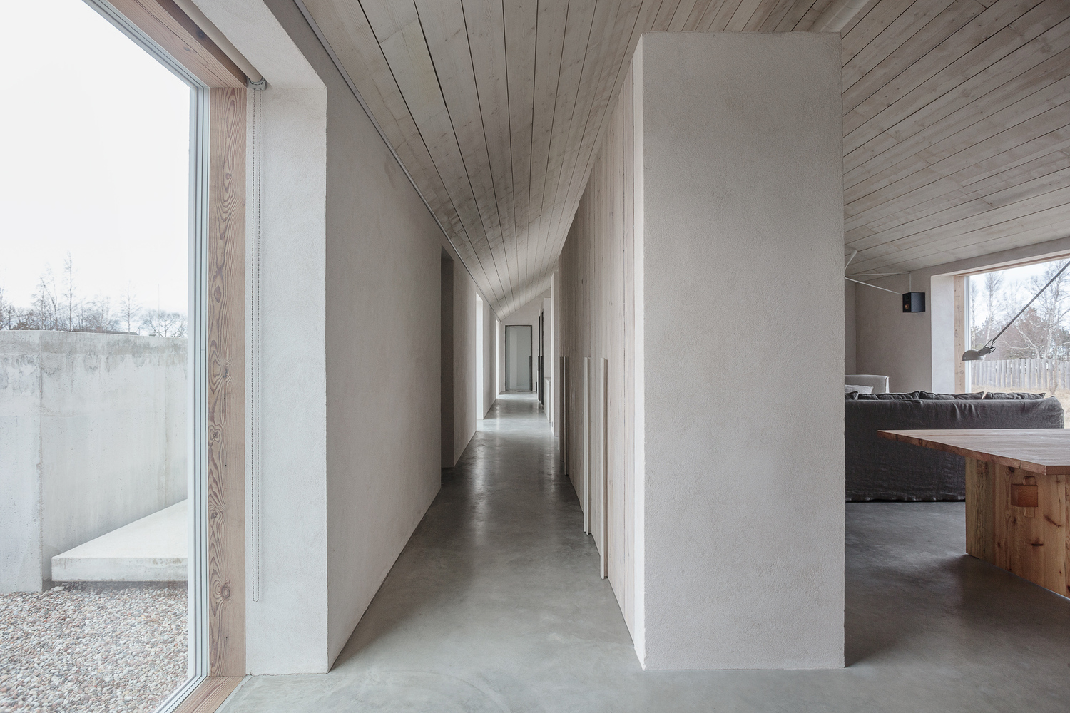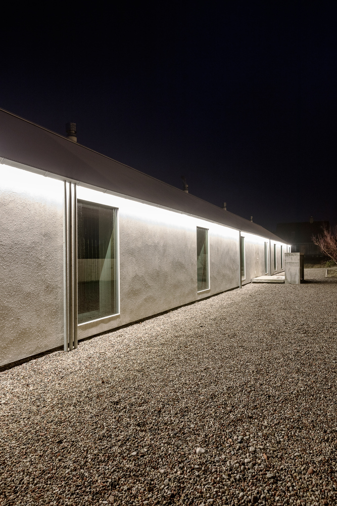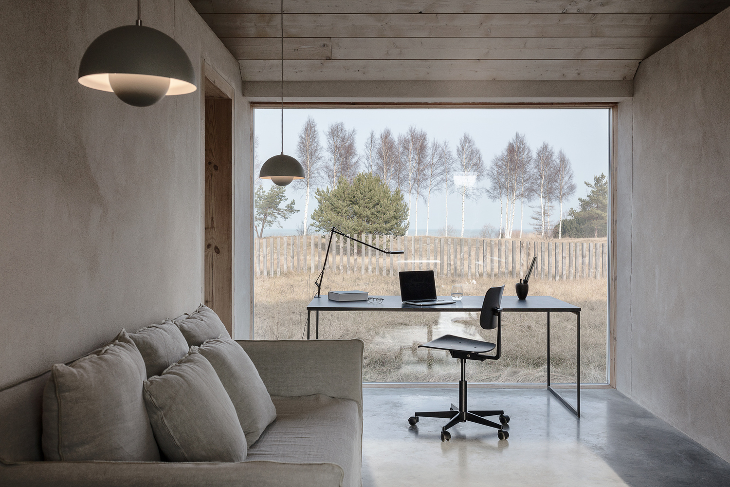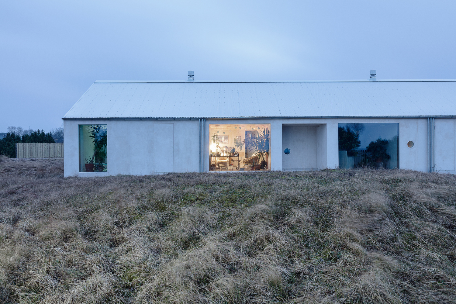 Wnętrze domu charakteryzuje się otwartą przestrzenią biegnącą przez całą długość budynku, tworząc wrażenie przestronności i intymności. Przeszklone drzwi prowadzą na ogród, zapewniając płynne połączenie z naturą. Dom zbudowany jest z betonu komórkowego, który zapewnia odporność na silne wiatry charakterystyczne dla tego regionu, a także pozwala na minimalną ingerencję w strukturalną izolację. Całość projektu przypomina tradycyjne domy rybackie z okolicy, ale z nowoczesnym podejściem do konstrukcji i designu.