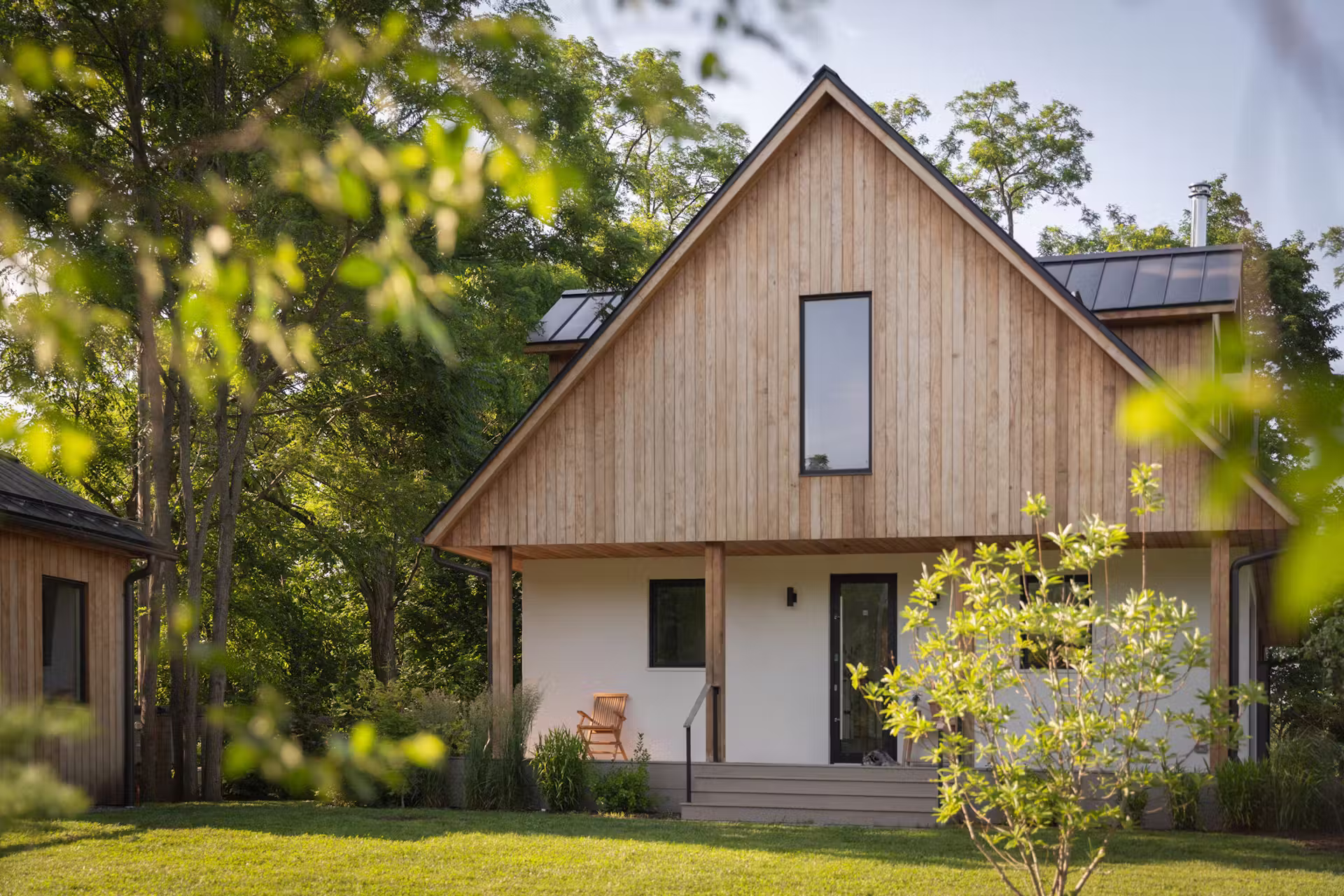 Elewację wykonano z trwałego, fabrycznie przygotowanego drewna oraz jasnego tynku, którego czystość kontrastuje z naturalnym starzeniem się okładzin drewnianych. Ten dialog pomiędzy tym, co niezmienne, a tym, co podlega upływowi czasu, stał się jednym z kluczowych elementów estetyki domu. Krajobraz zaprojektowano w sposób możliwie naturalny – z trawami i dzikimi kwiatami – aby architektura nie dominowała nad otoczeniem.