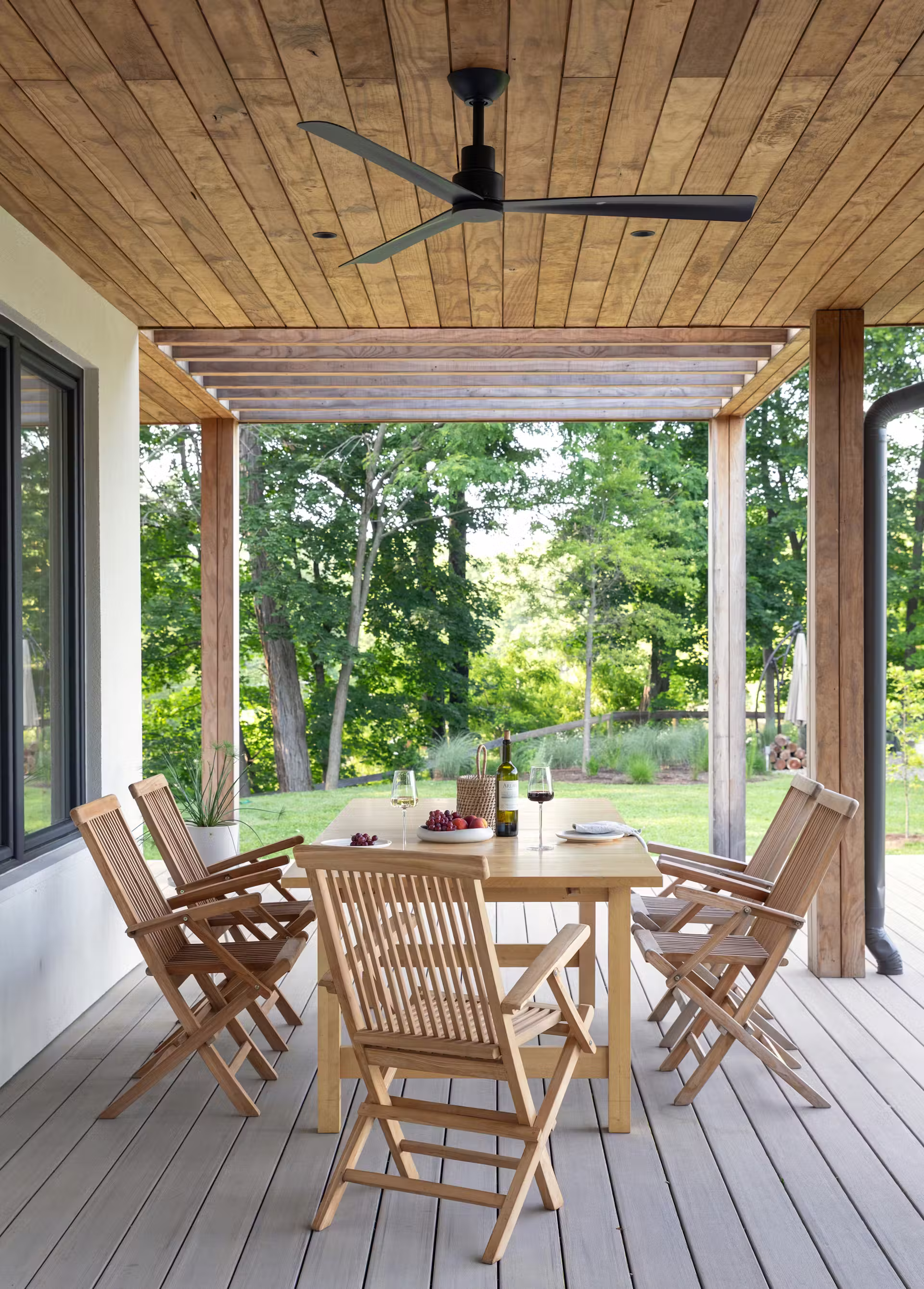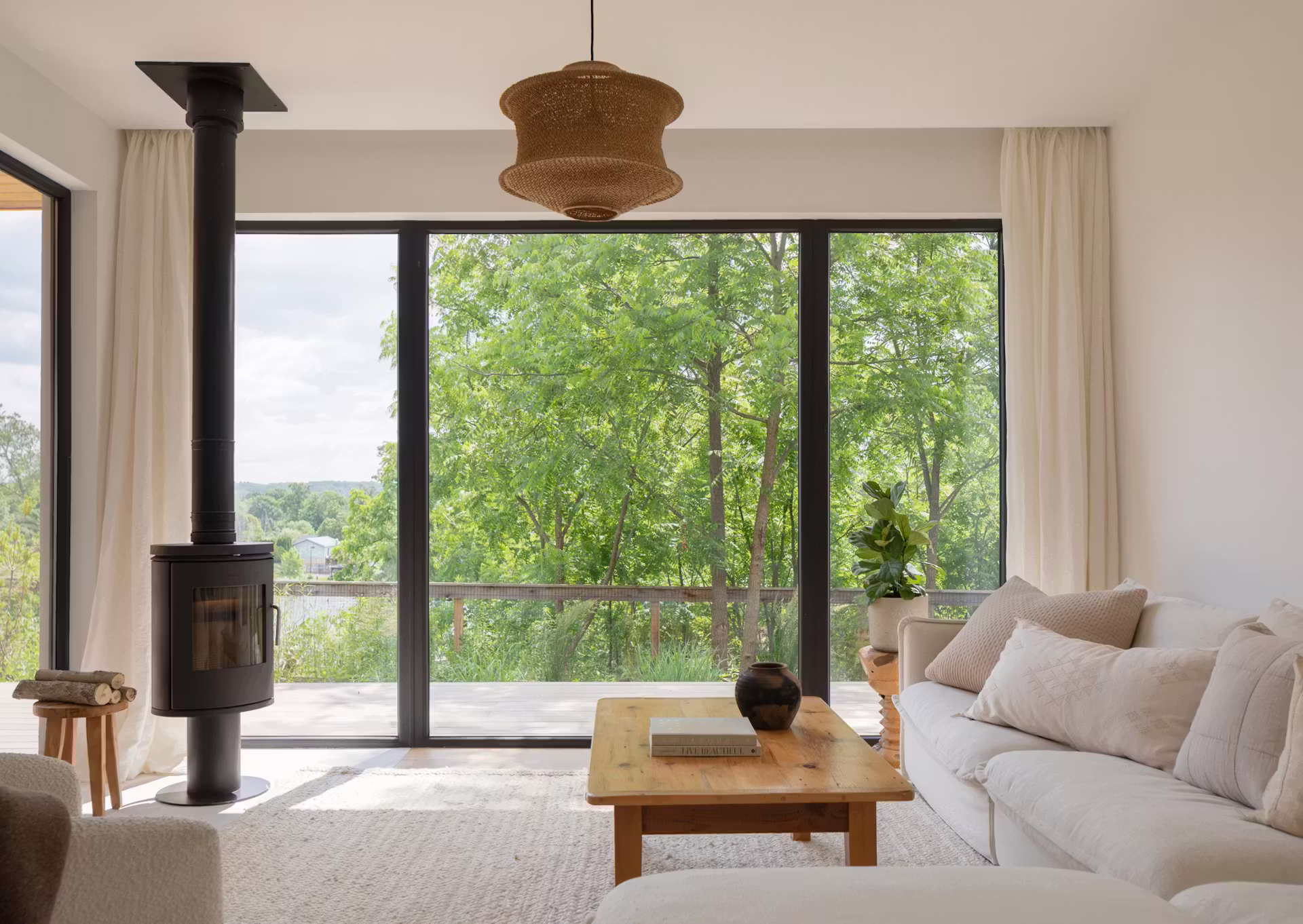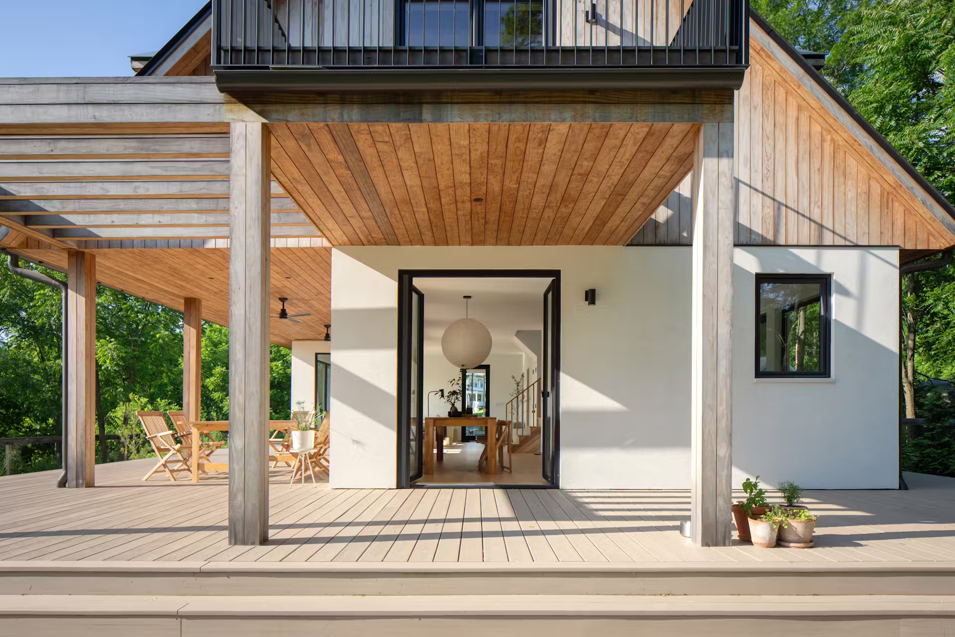 Dom zaprojektowano tak, aby niemal każde pomieszczenie mogło otworzyć się na zewnątrz. Duże przeszklenia i głęboki okap sprawiają, że granica między wnętrzem a tarasem zaciera się, a życie naturalnie przenosi się na zewnątrz. Widok na rzekę, strumień i dziką roślinność towarzyszy codziennym czynnościom, wzmacniając poczucie intymności i wyciszenia.