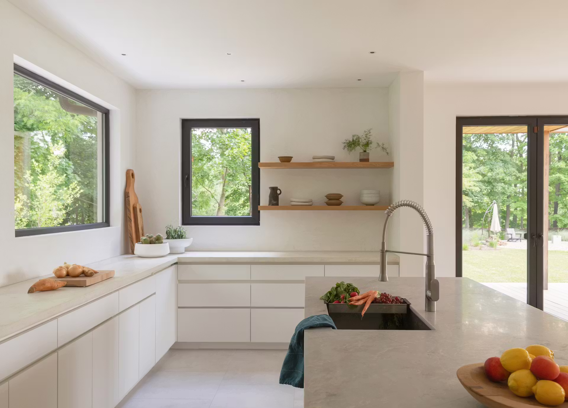 Znaczną część materiałów sprowadzono z Polski, skąd pochodzi rodzina Moniki. Okna, zabudowy stolarskie, kamienne elementy elewacji oraz część wyposażenia wnętrz zostały starannie dobrane, by połączyć europejską jakość z amerykańskim krajobrazem. We wnętrzach zastosowano m.in. mikrocement w łazienkach i na backsplashu kuchni, który nadaje przestrzeni spójny, minimalistyczny, a jednocześnie ciepły charakter.