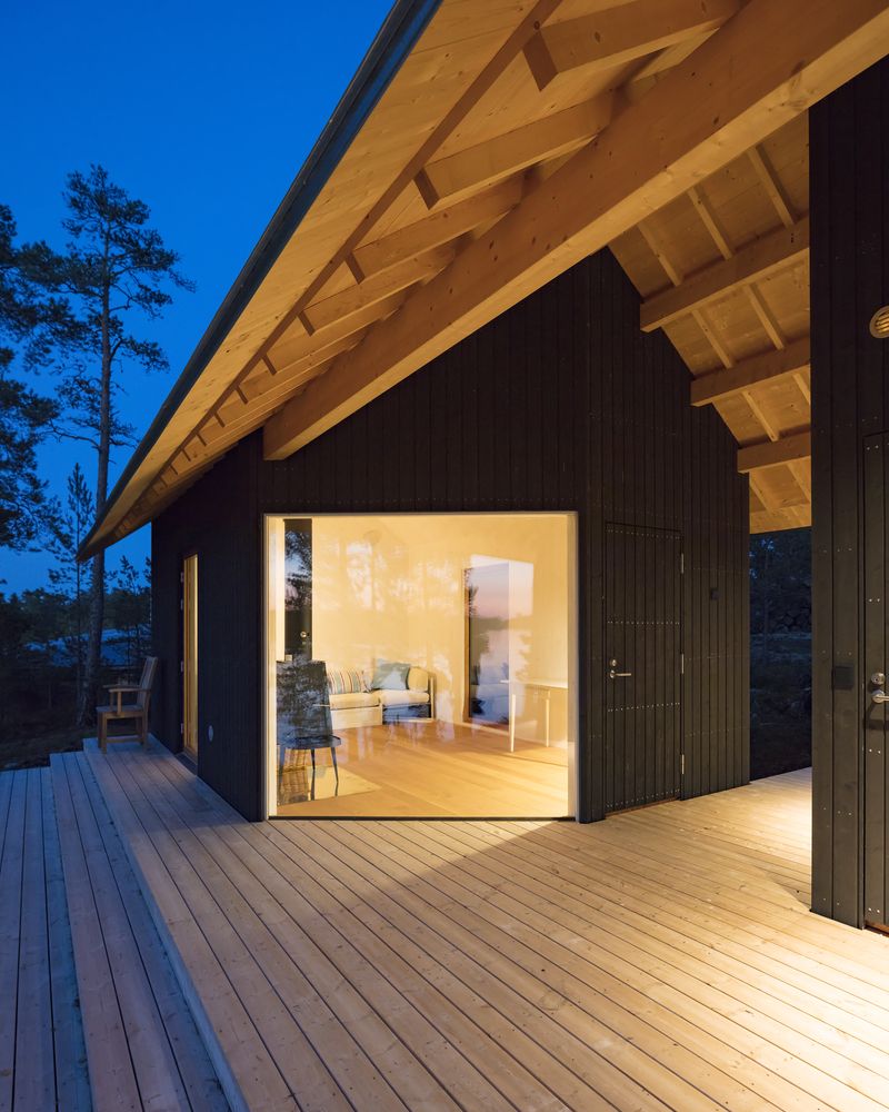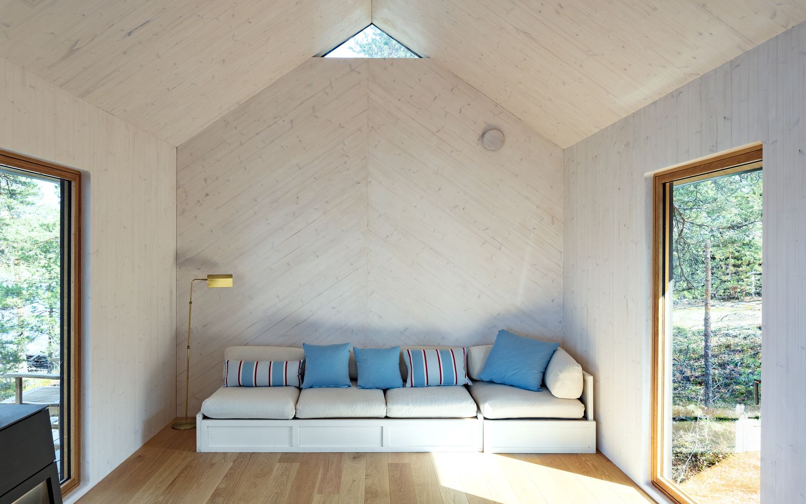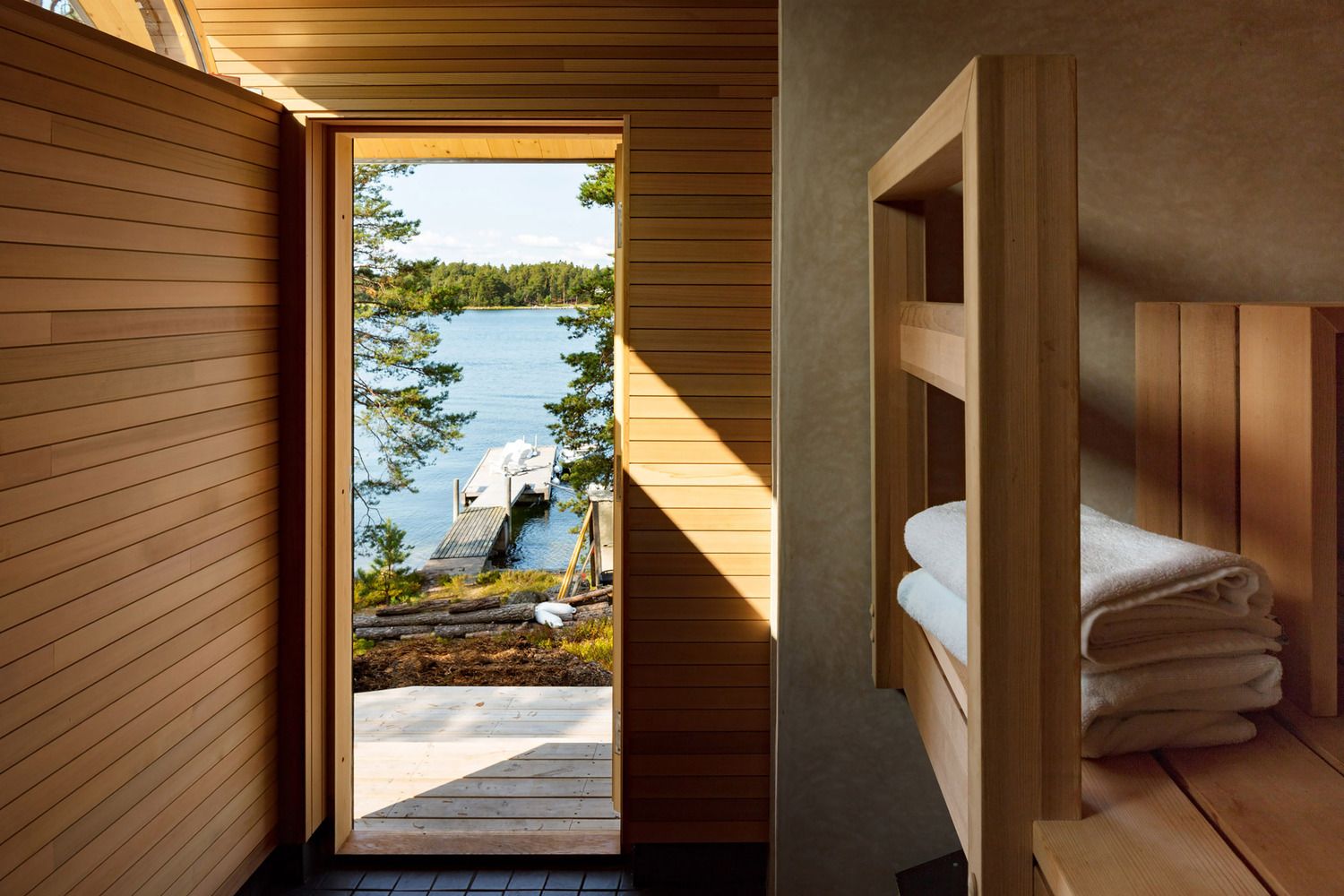 Sauna obłożona cedrowym drewnem oferuje widok na pomost i wodę, a charakterystyczne, zakrzywione u góry okno pozwala obserwować zachody słońca. Pokój gościnny również otwiera się na pejzaż dzięki prostemu wycięciu w elewacji. Cały budynek wykonano z drewna klejonego warstwowo, a zewnętrzne ściany wykończono świerkiem malowanym tradycyjną czarną farbą Falu. Ocynkowany dach z czasem także zostanie pomalowany na czarno, dzięki czemu obiekt jeszcze mocniej wtopi się w surowy, nordycki krajobraz fińskiego archipelagu.