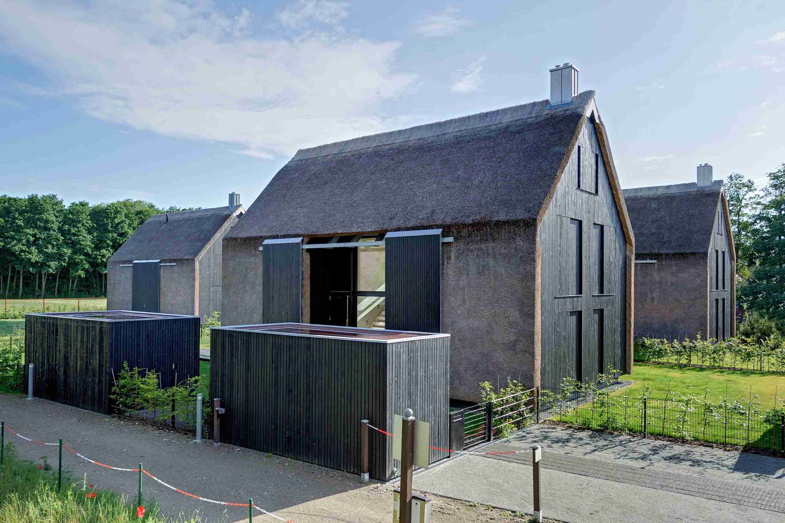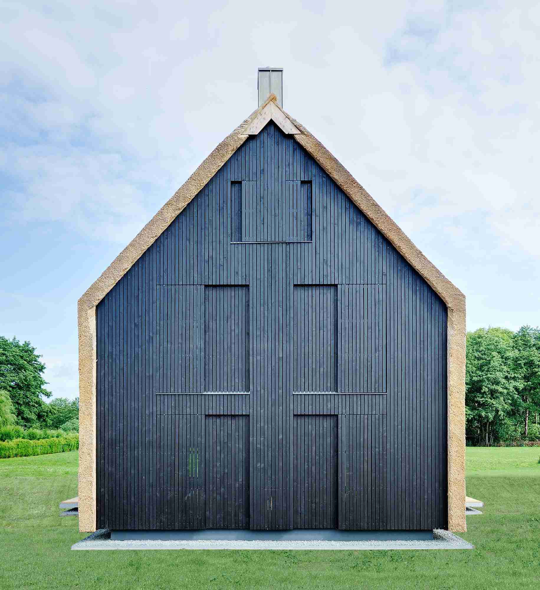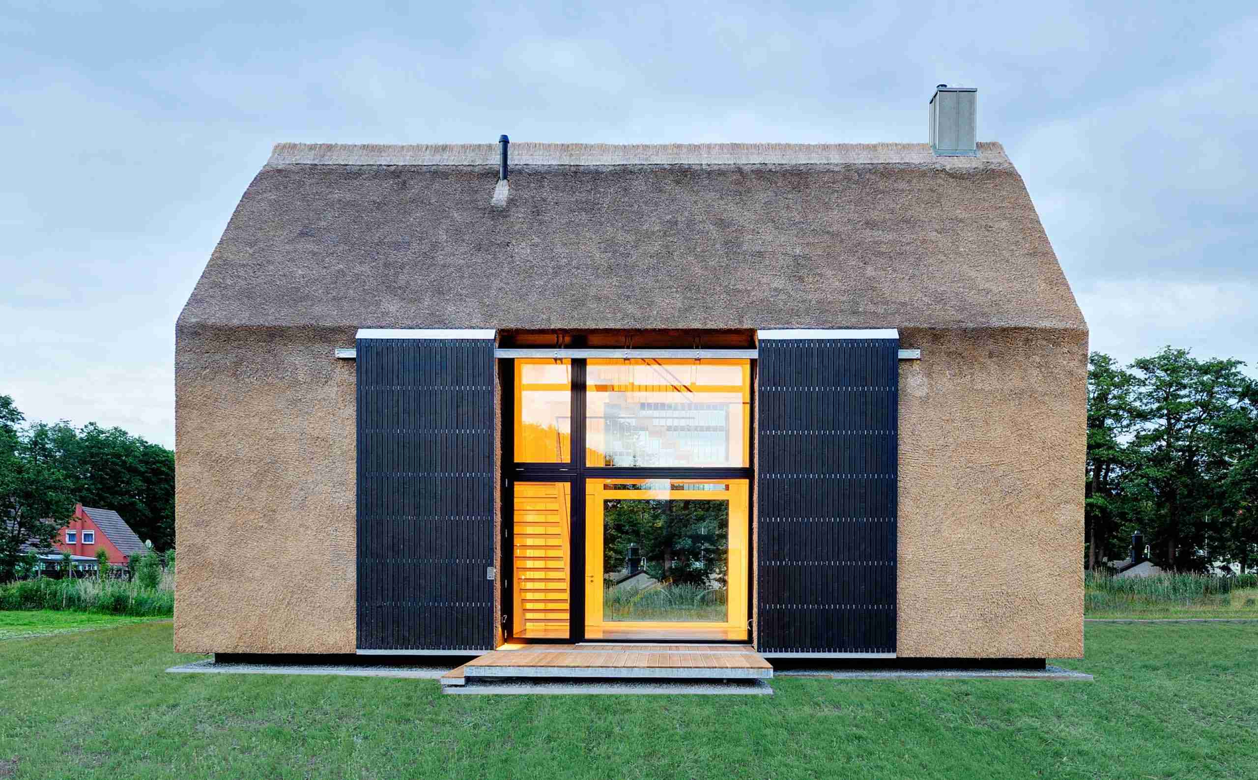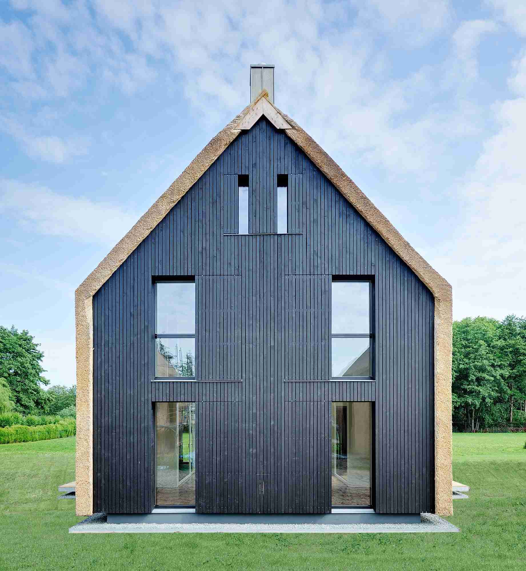 Zgodnie z miejscowym planem zagospodarowania, architekci stworzyli trzy dwupiętrowe domy z charakterystycznymi dachami dwuspadowymi, ustawione szczytami do ulicy. Dwa z nich stoją obok siebie, a trzeci – w drugim rzędzie między nimi, tworząc harmonijny układ przestrzenny. Od południa zabudowa jest bardziej zamknięta, natomiast od wschodu i zachodu duże przeszklenia otwierają wnętrza na ogrody i wypełniają je naturalnym światłem. Dachy pokryto trzciną, co podkreśla nadmorski charakter budynków i ich ekologiczny wymiar. Aby zachować wymagane odległości między domami, zrezygnowano z nawisu dachu – dzięki temu trzcinowe połacie schodzą płynnie aż do ziemi. Elewacje północne i południowe wykończono czarnymi listwami świerkowymi, a drewniane okiennice przesuwne pozwalają na całkowite zamknięcie okien i zachowanie prywatności.