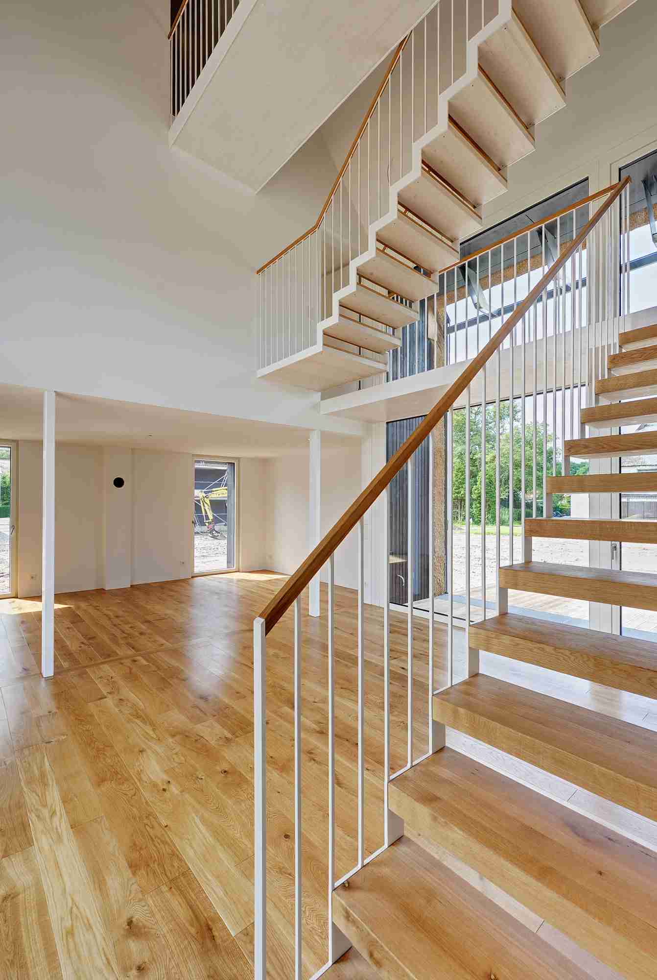 Wnętrza domów w Scheunen Trio zaprojektowano z myślą o komfortowym wypoczynku i energooszczędności. Centralnym punktem każdego domu jest przedpokój pełniący rolę salonu, jadalni i przestrzeni spotkań, otwierający się na ogród z obu stron. Otwarte schody prowadzą na piętro, gdzie znajdują się sypialnie z prywatnymi łazienkami i garderobami, a na poddaszu – dodatkowe pokoje. Do budowy wykorzystano naturalne i ekologiczne materiały, które gwarantują trwałość i minimalny wpływ na środowisko. Projekt łączy w sobie tradycję i nowoczesność, tworząc wyjątkową interpretację idei nowoczesnej stodoły nad Bałtykiem.