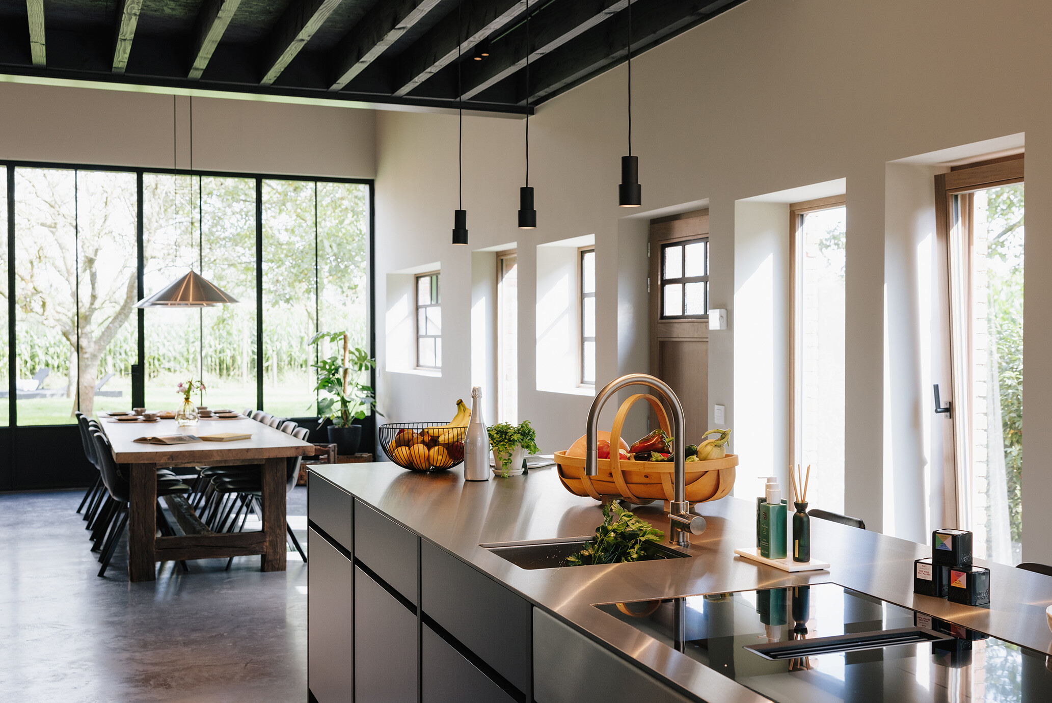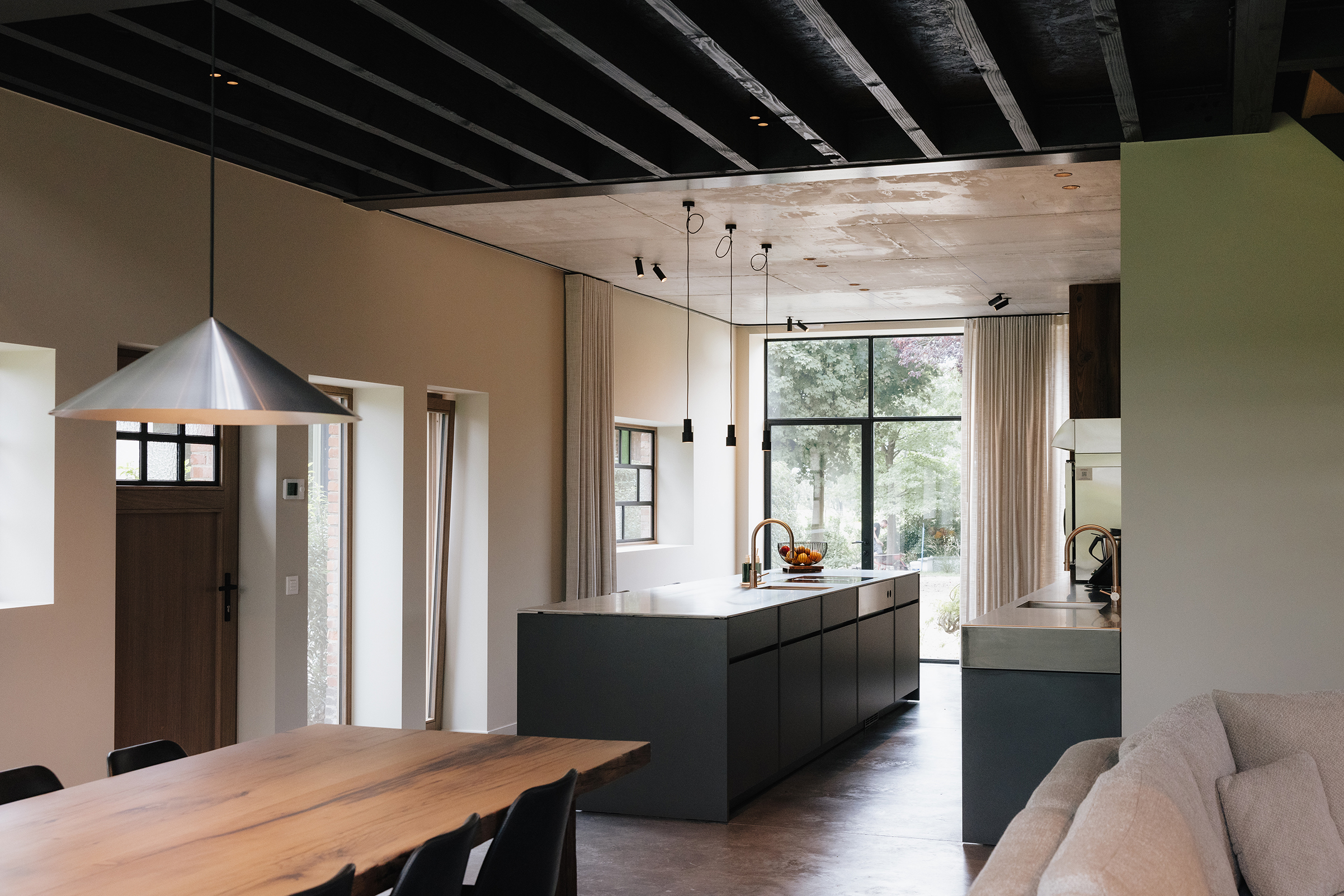 Projekt stanowi interesujące połączenie dwóch światów – wiejskiej prostoty i miejskiego komfortu. W miejscu dawnej bramy gospodarczej pojawiło się duże okno, które wprowadza światło do centralnej strefy dziennej z kuchnią i długim stołem do wspólnych spotkań.