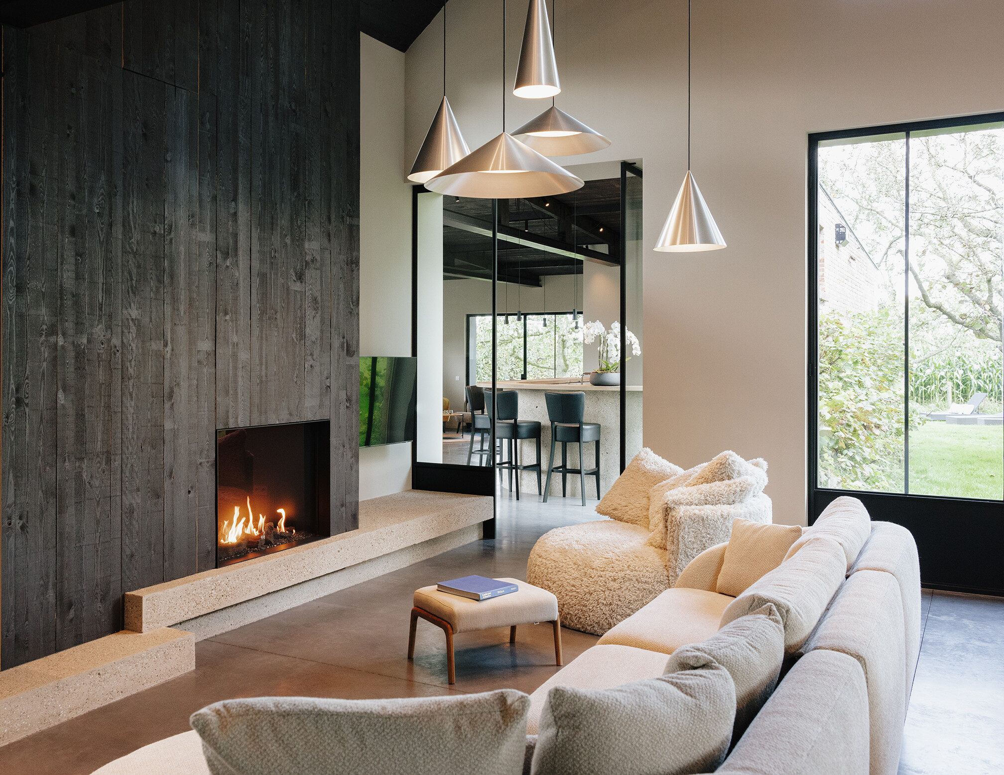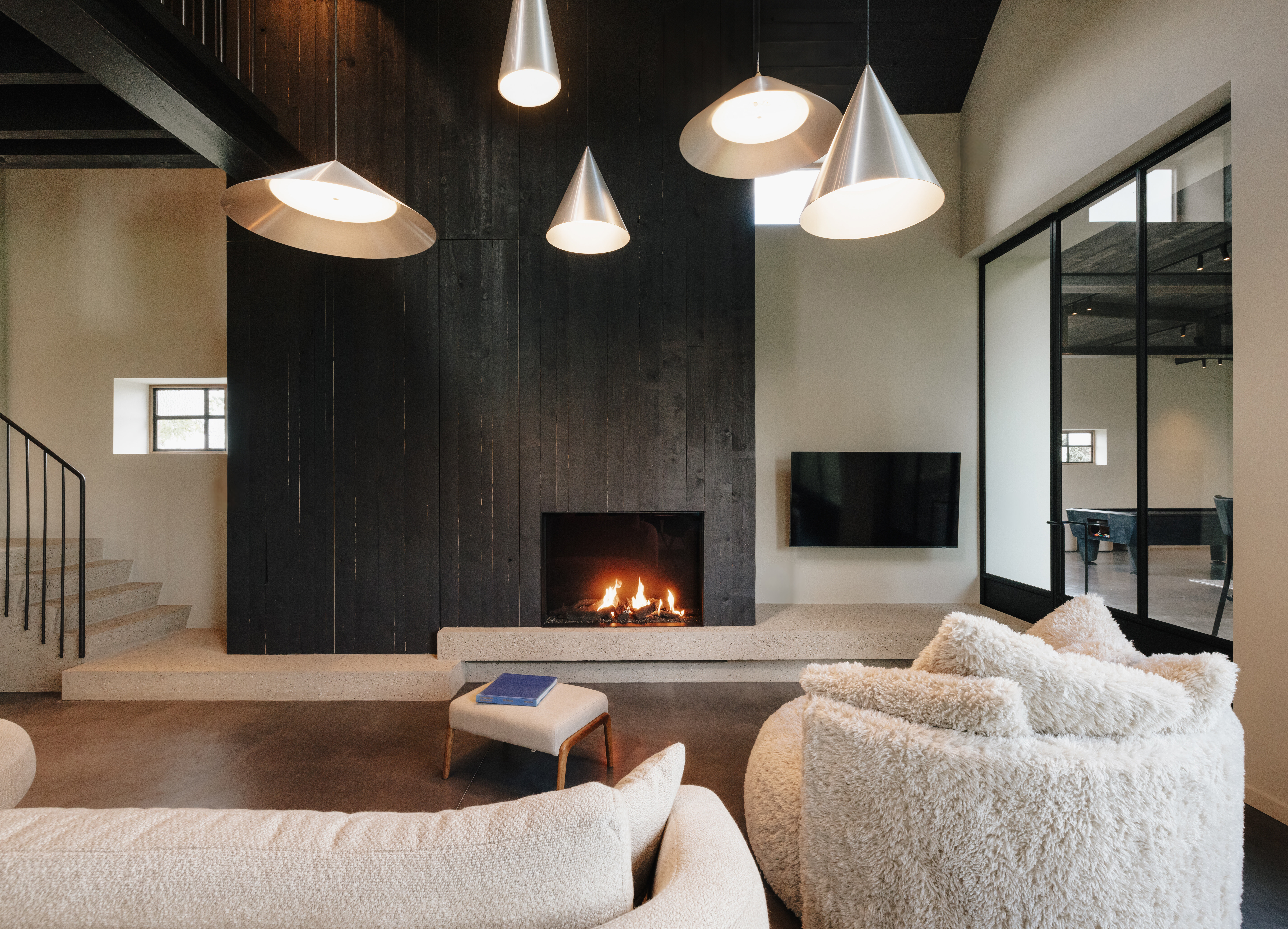 Wnętrze rozwija się dalej w kierunku salonu o podwyższonej wysokości, gdzie pojawiają się elementy takie jak kominek, drewniane okładziny oraz industrialne akcenty – m.in. stalowe detale i sufitowe konstrukcje. Całość uzupełnia przestrzeń rekreacyjna z barem i stołem bilardowym, podkreślająca loftowy charakter domu.