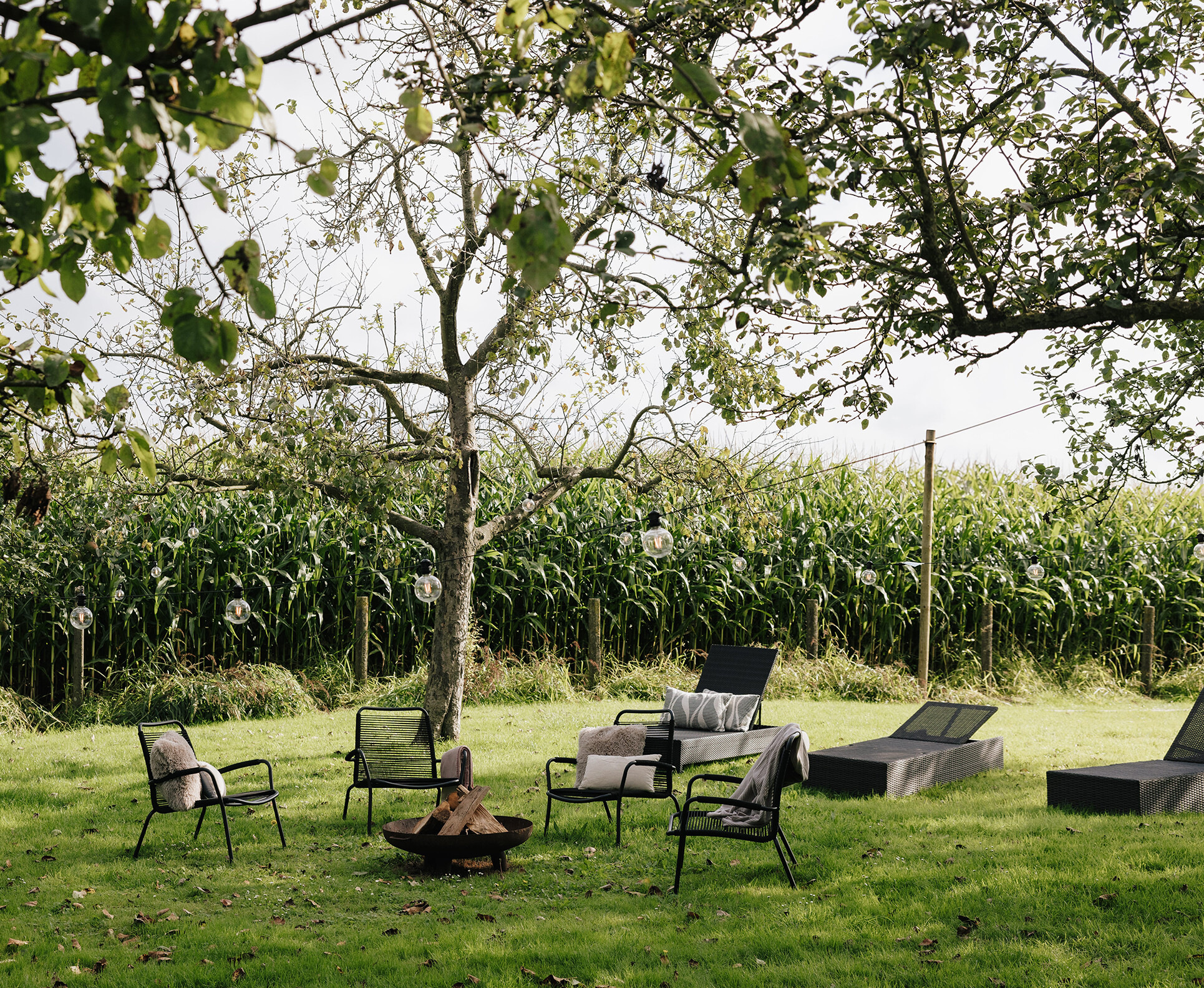 Otoczenie budynku stanowi naturalny ogród z sadami i różnymi strefami wypoczynku, które pozwalają korzystać z ciszy i krajobrazu. W sezonie letnim wysokie pola kukurydzy niemal całkowicie ukrywają dom, tworząc kameralną, odizolowaną przestrzeń.