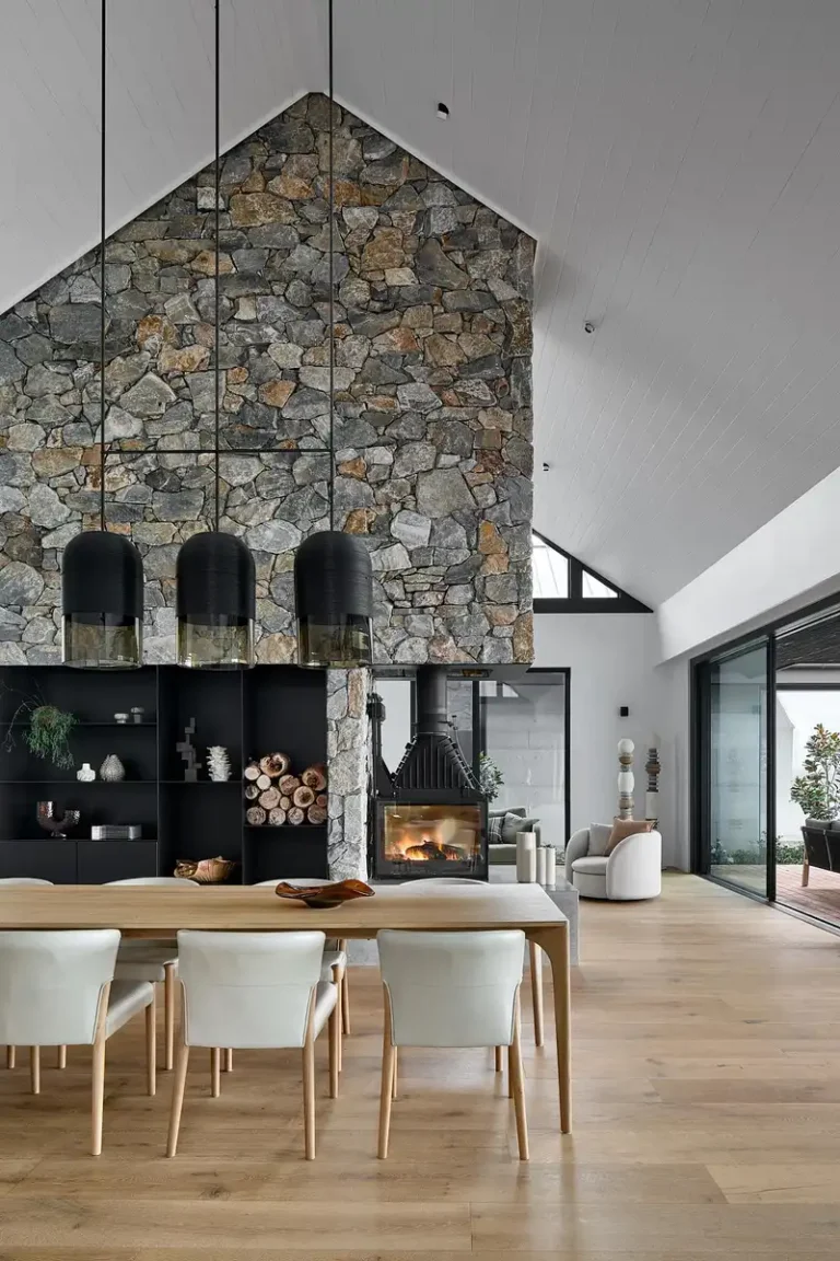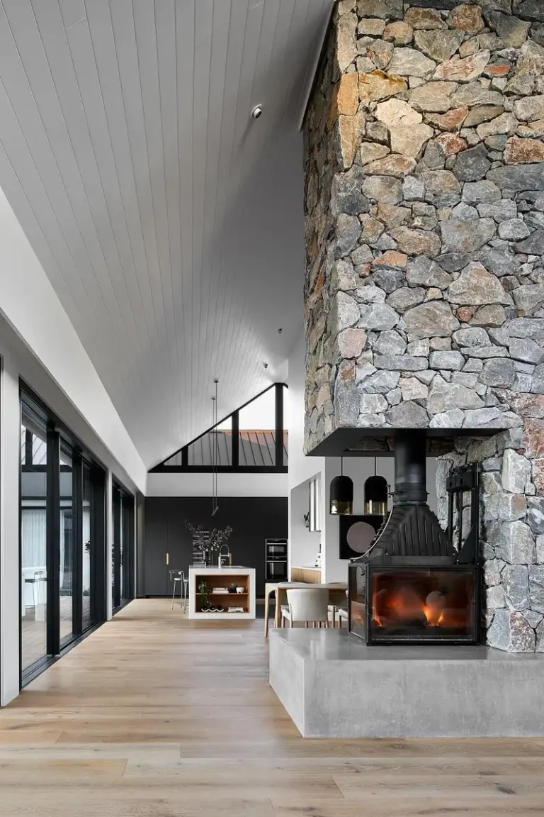 Uzupełnieniem są kamienne okładziny oraz termicznie modyfikowane drewno cambara ash, użyte na elewacjach. Materiały te nie tylko wpisują się w krajobraz, ale również podkreślają monolityczny, niemal archetypiczny charakter domu. Wnętrza zyskały dodatkową dominantę w postaci kamiennego trzonu kominowego z trójstronnym kominkiem, który staje się miejscem wspólnym – współczesnym odpowiednikiem ogniska.