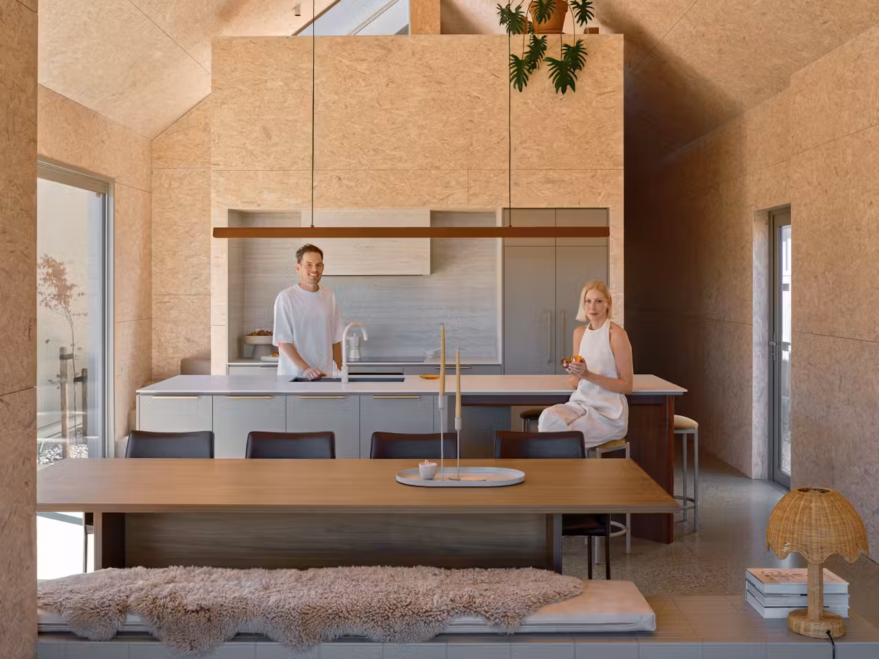Wnętrze domu to połączenie ciepłych odcieni orzecha, polerowanych betonowych podłóg i ręcznie wykonanych japońskich płytek, co tworzy atmosferę przytulności i naturalnej elegancji. Paleta kolorystyczna bazuje na odcieniach charakterystycznych dla Central Otago – od głębokich brązów, przez rdzawą czerwień, po szarości, burgund i zielenie, które zmieniają się wraz ze światłem, odzwierciedlając barwy otaczających gór.