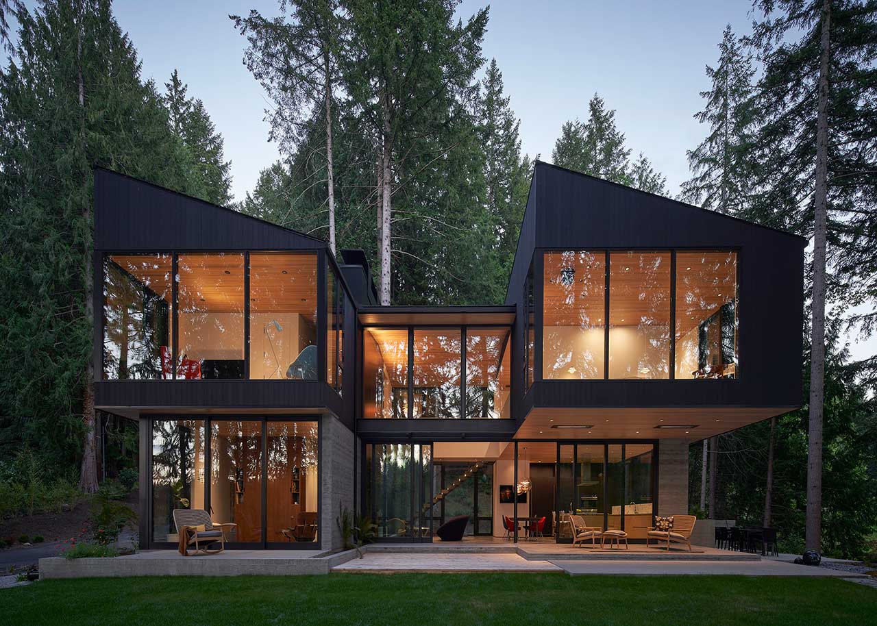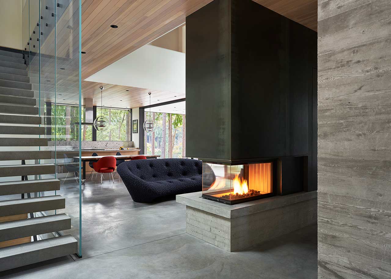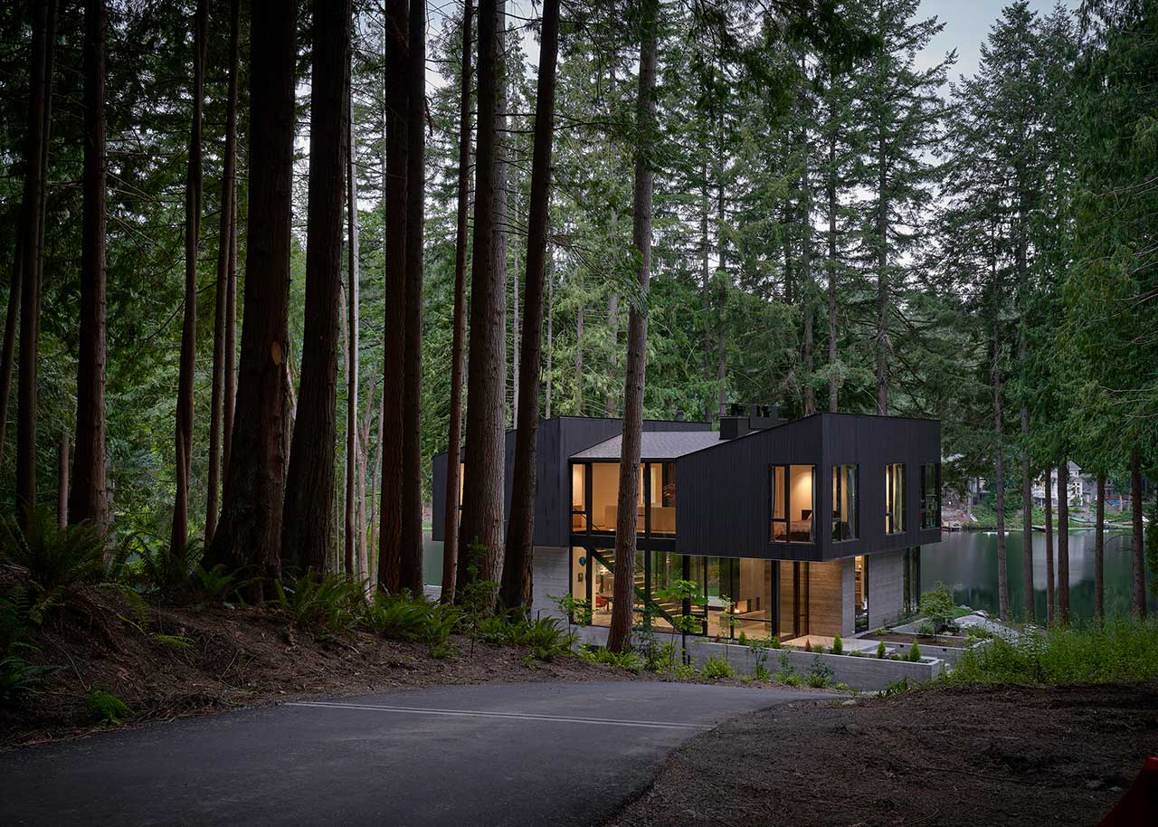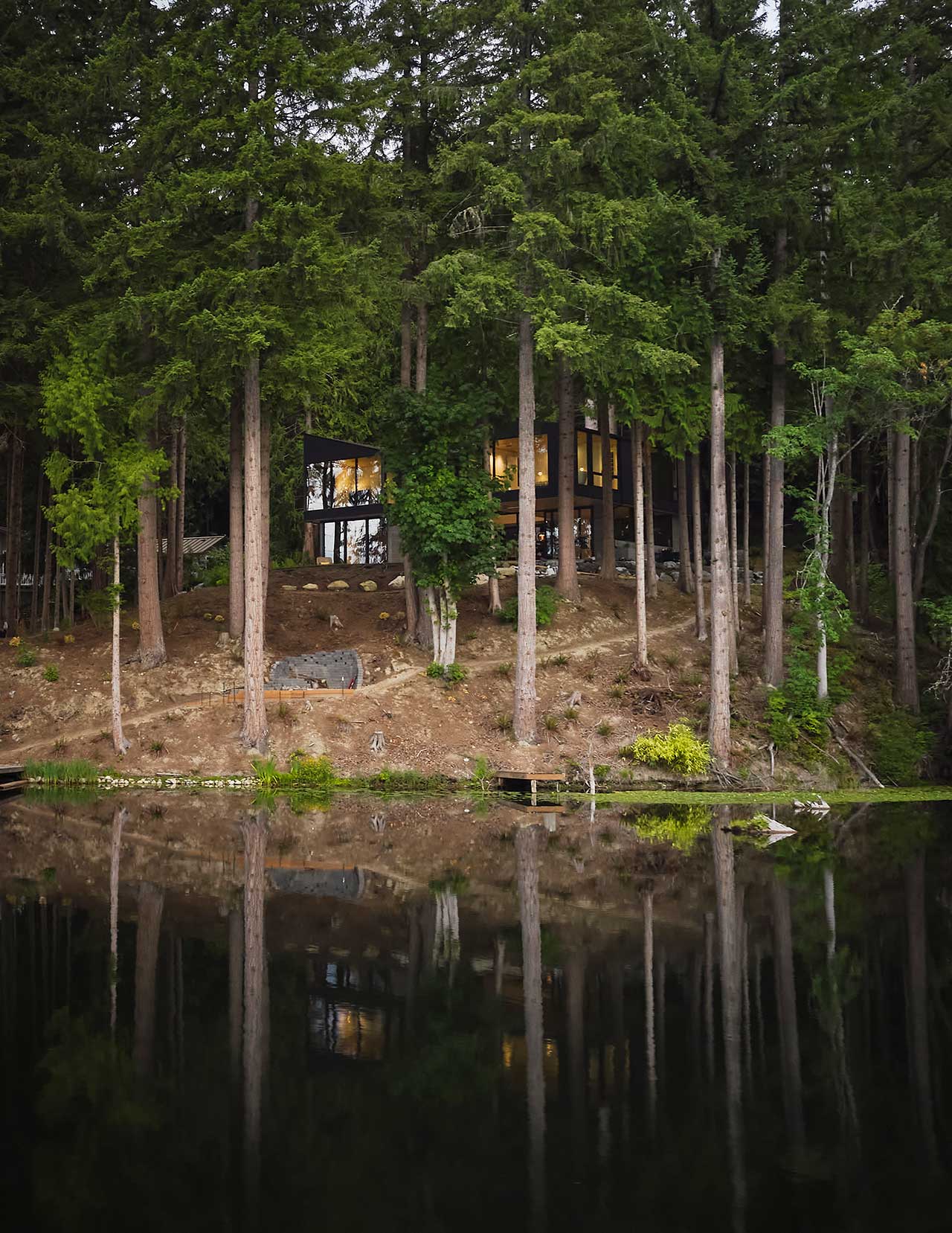 Dom powstał jako odpowiedź na unikalną lokalizację – wśród drzew, z widokiem na jezioro i pozostałości po dawnych polach kempingowych. Architekci zaprojektowali konstrukcję, która wtapia się w otaczającą naturę, wykorzystując beton, drewno i szkło w sposób nienaruszający krajobrazu. Dolna kondygnacja wykończona betonem mieści kuchnię, przestrzeń biurową oraz pokój gościnny, tworząc solidną bazę, która doskonale komponuje się z leśnym otoczeniem.