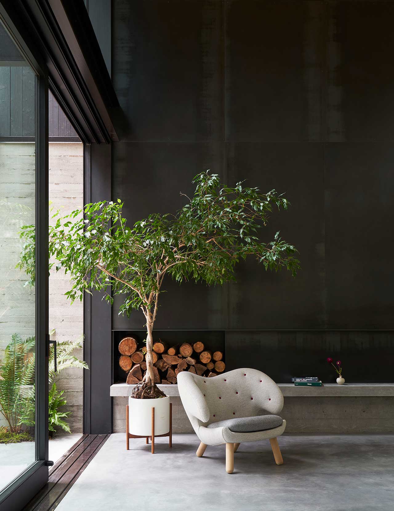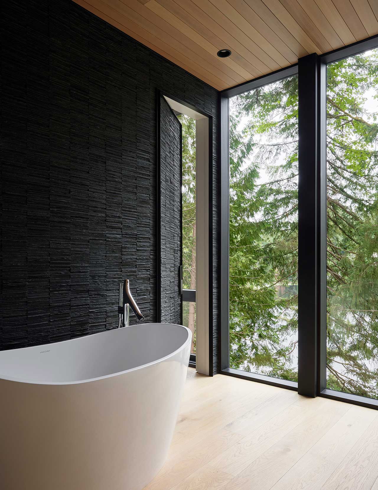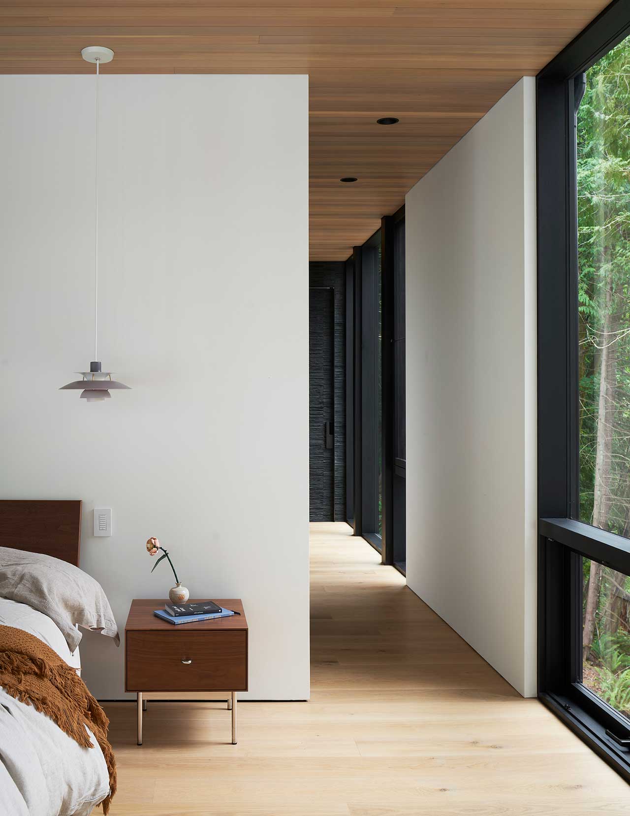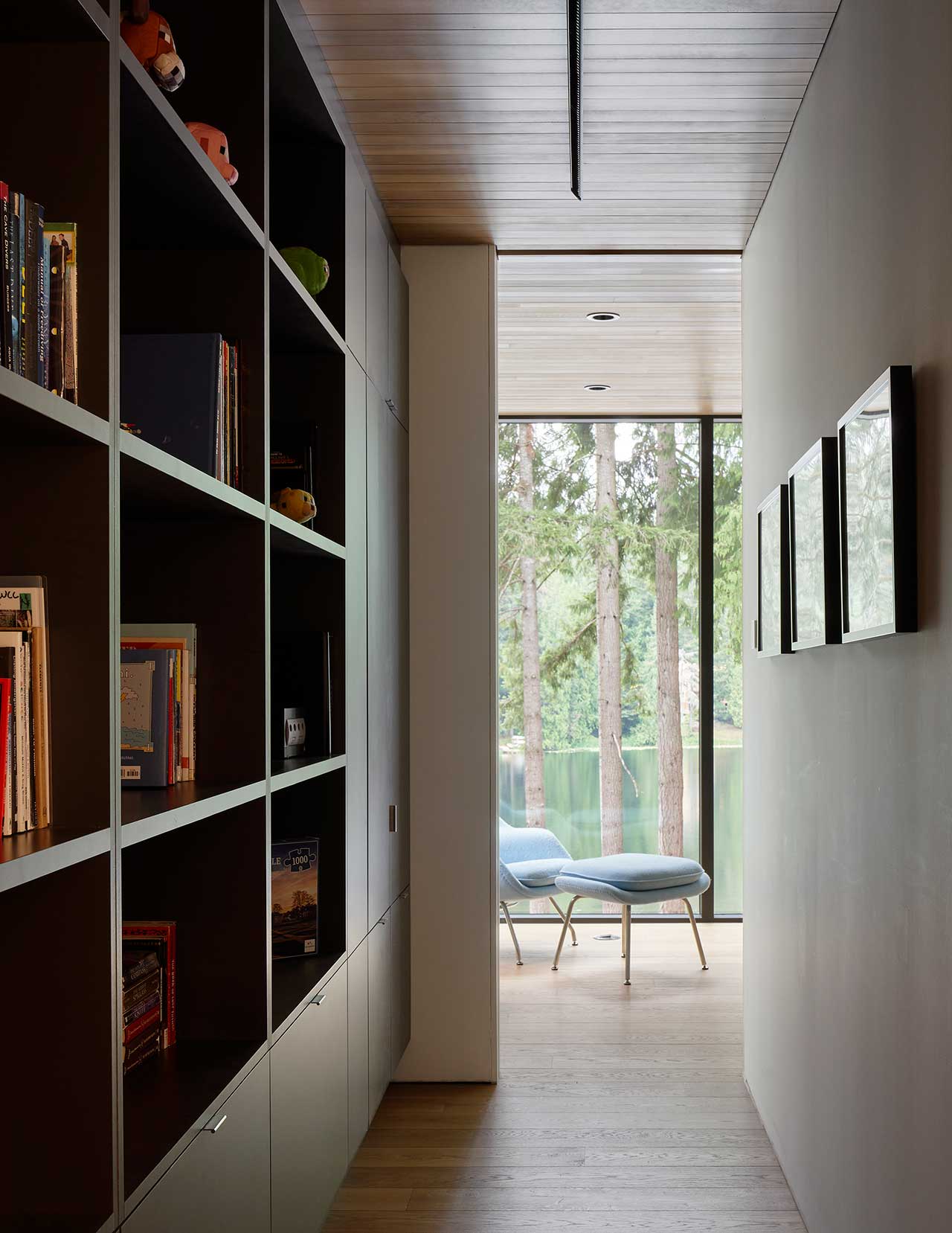 Dom powstał jako odpowiedź na unikalną lokalizację – wśród drzew, z widokiem na jezioro i pozostałości po dawnych polach kempingowych. Architekci zaprojektowali konstrukcję, która wtapia się w otaczającą naturę, wykorzystując beton, drewno i szkło w sposób nienaruszający krajobrazu. Dolna kondygnacja wykończona betonem mieści kuchnię, przestrzeń biurową oraz pokój gościnny, tworząc solidną bazę, która doskonale komponuje się z leśnym otoczeniem.