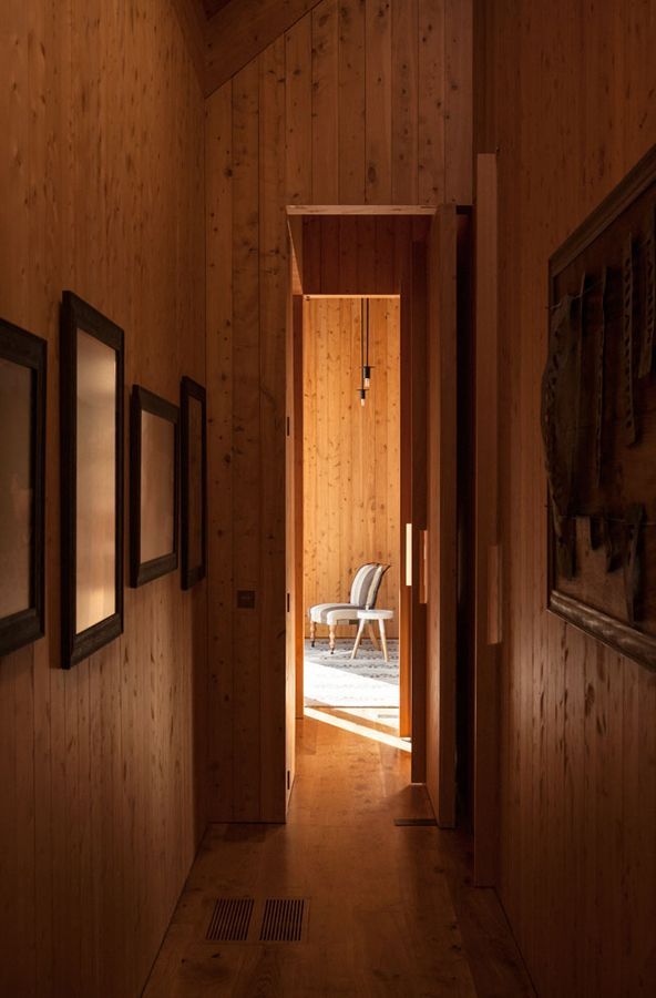 Stalowe okucia, czarne geometryczne akcenty w połączeniu z bielą, stal nierdzewna oraz surowe żarówki podkreślają minimalistyczną estetykę. Konstrukcja domu została wykonana z drewna macrocarpa, które nadaje mu niepowtarzalny charakter i pozwala pięknie się starzeć z czasem.