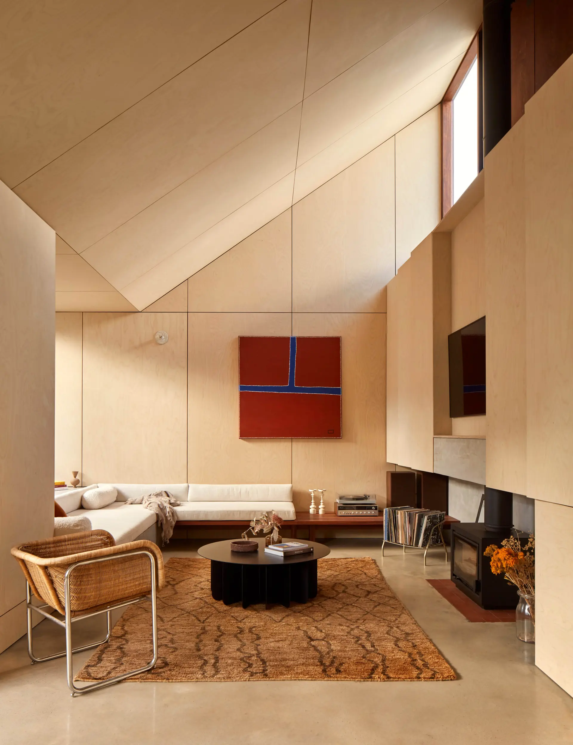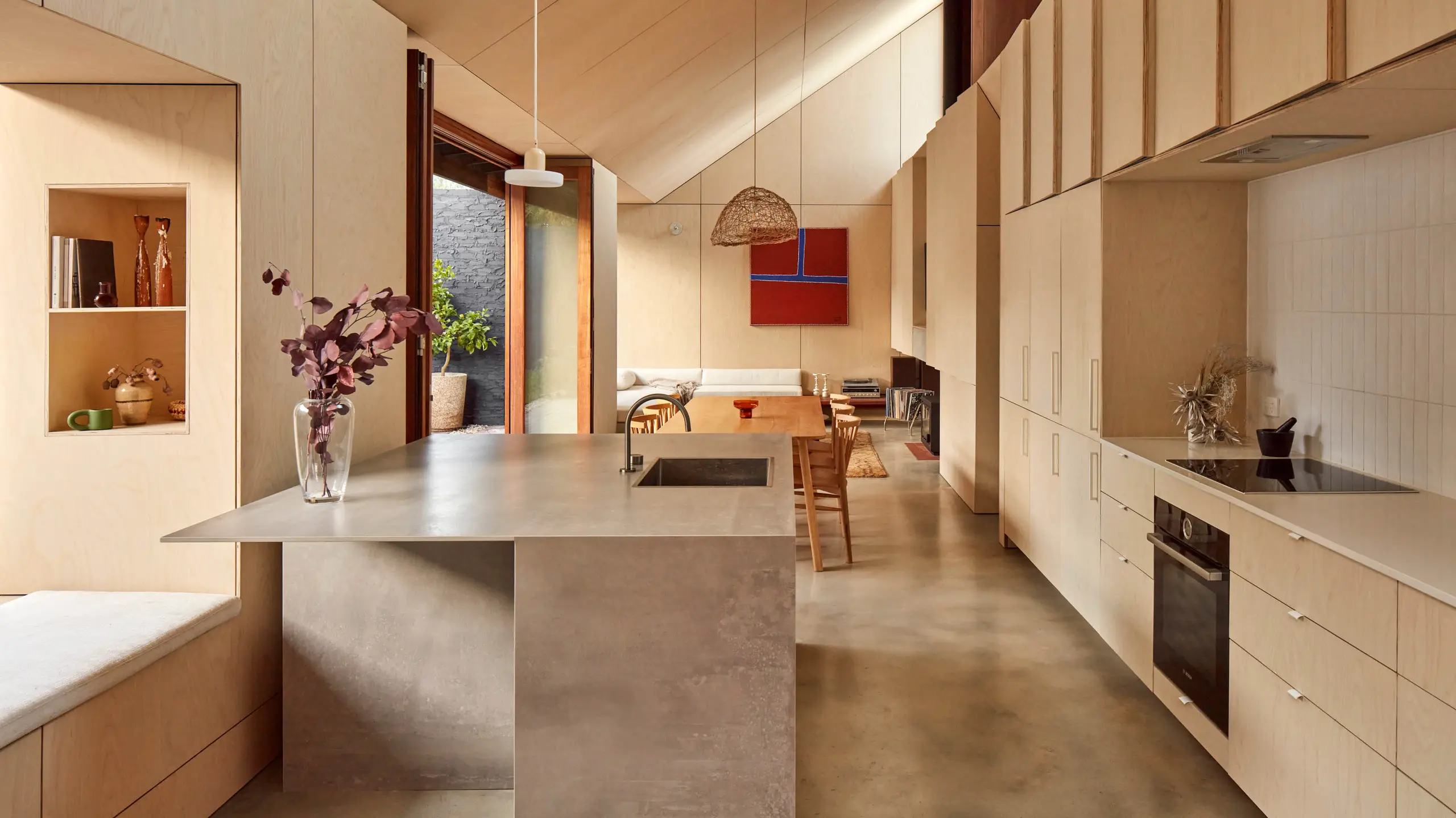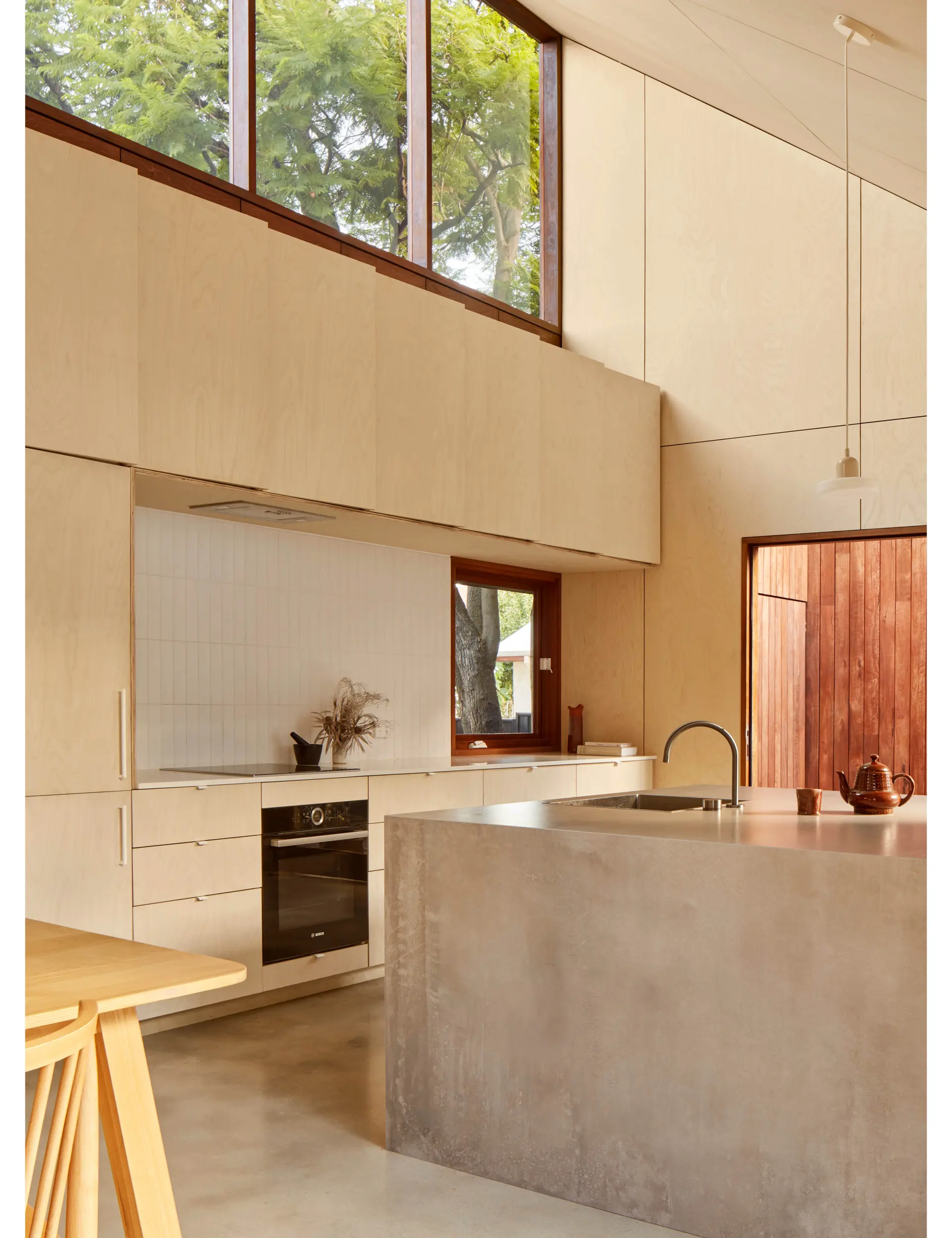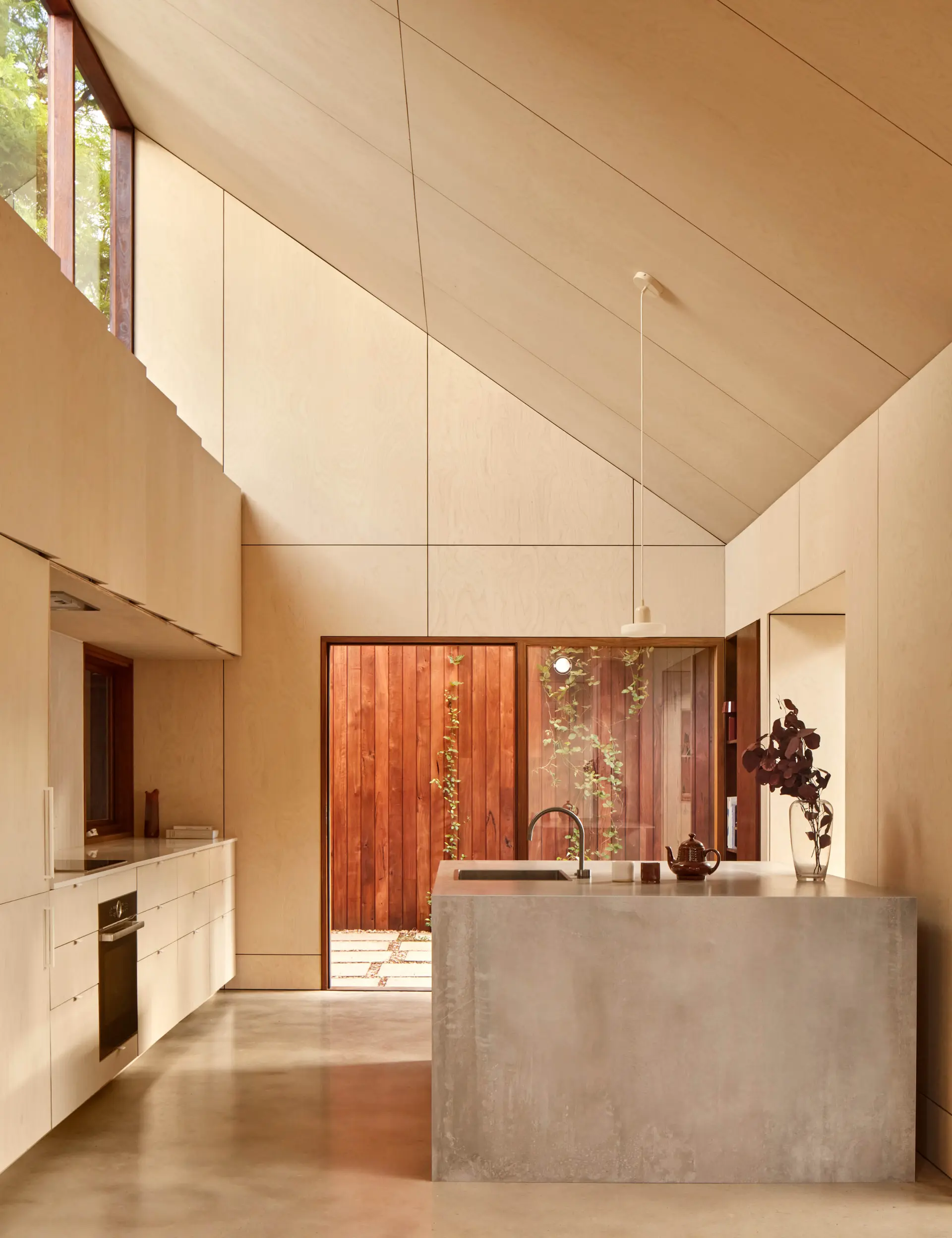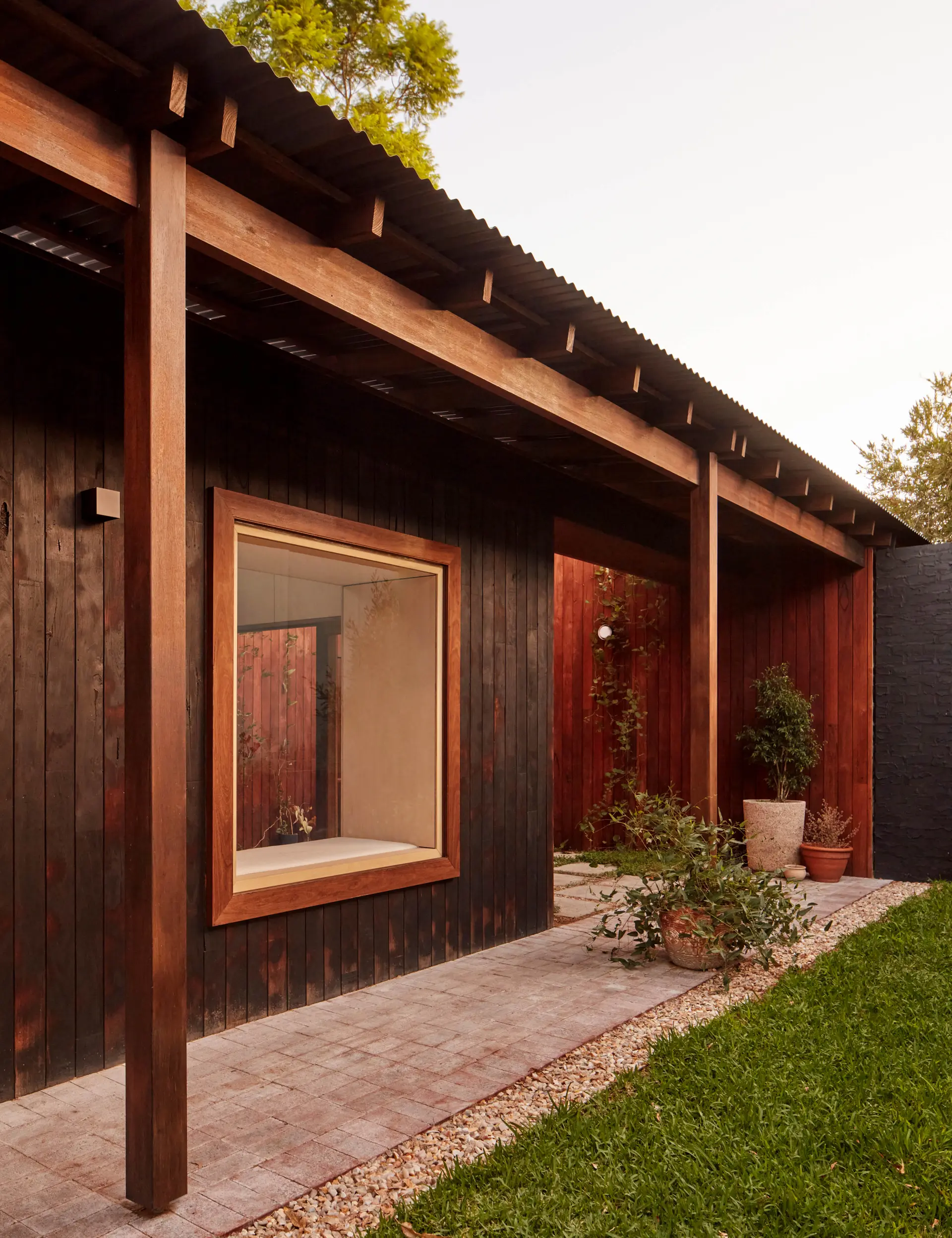 „Shadow House”, jak nazwano nową część domu, opiera swoją atmosferę na wyrafinowanej, zróżnicowanej palecie drewna — w każdej przestrzeni innej, ale razem tworzącej spójną, taktylną kompozycję. Na zewnątrz zastosowano opalane shou sugi ban wykonane z odzyskanego drewna jarrah. W atrium użyto surowego jarrah w naturalnym ciepłym odcieniu, studio wykończono sklejką bejcowaną na orzech, a nową strefę mieszkalną rozświetla jasna sklejka z akacji birch. To subtelne różnice materiałowe, które budują zmieniające się nastroje — od jasnych i lekkich po przytulne i wyciszone.