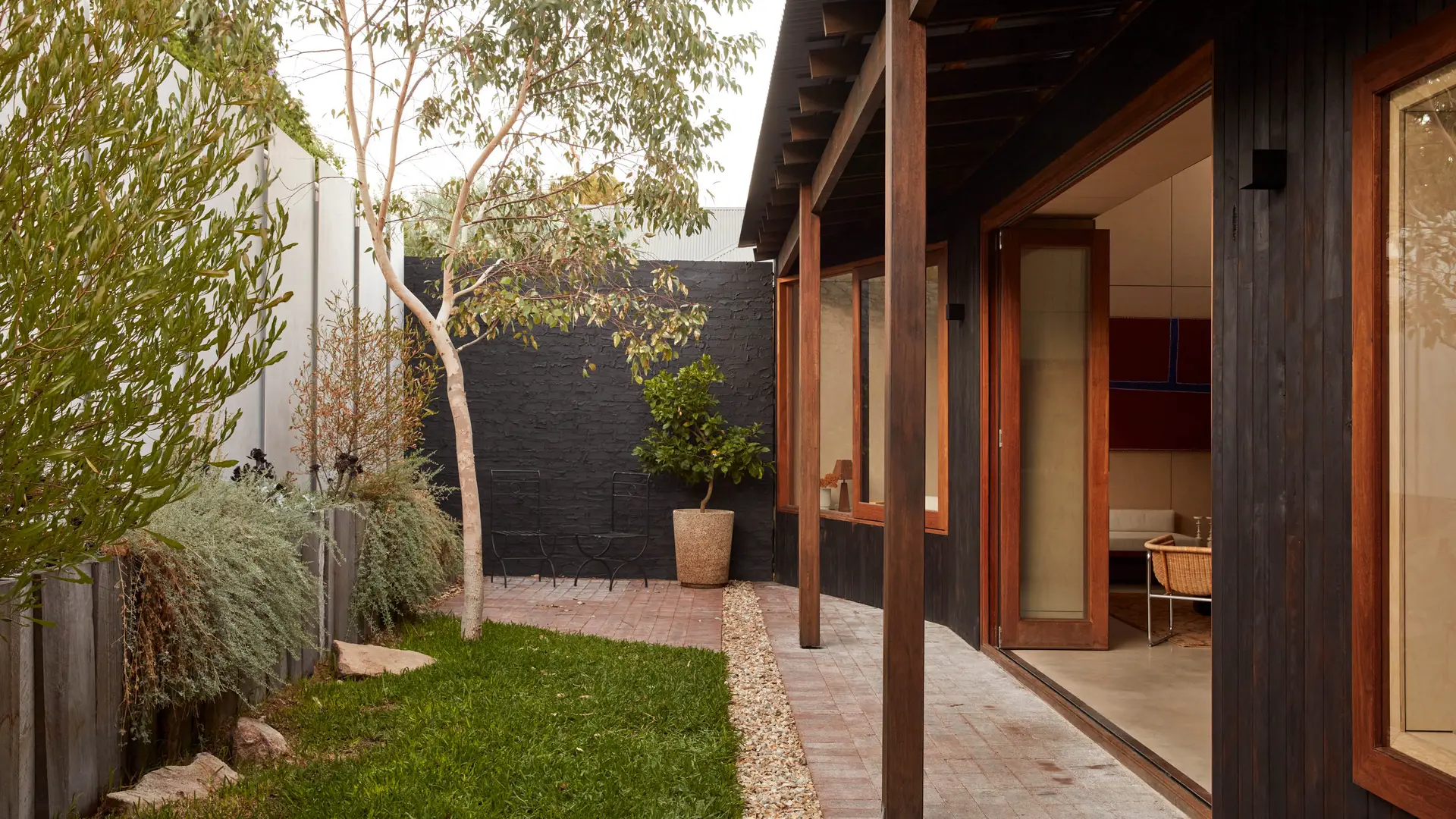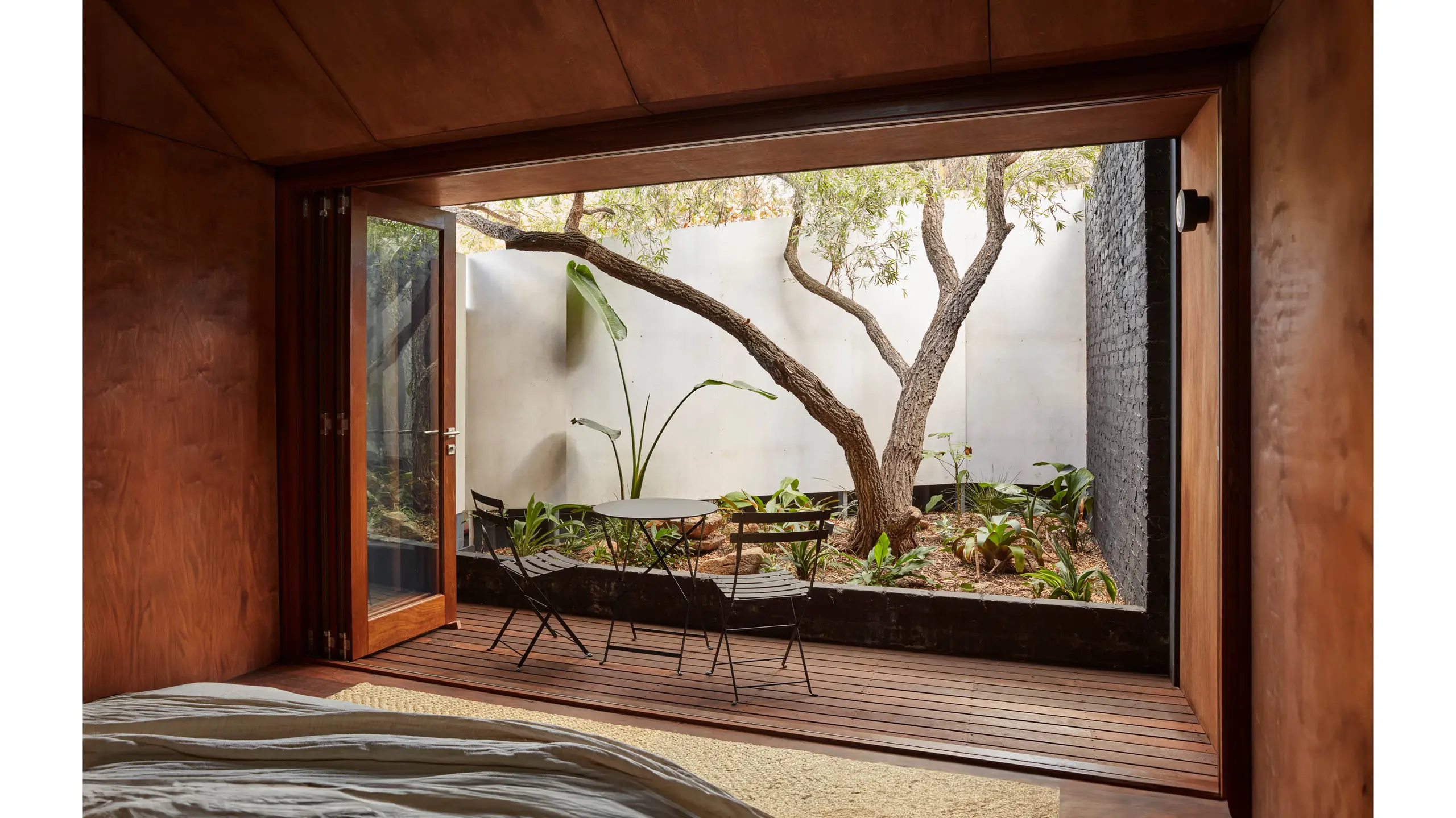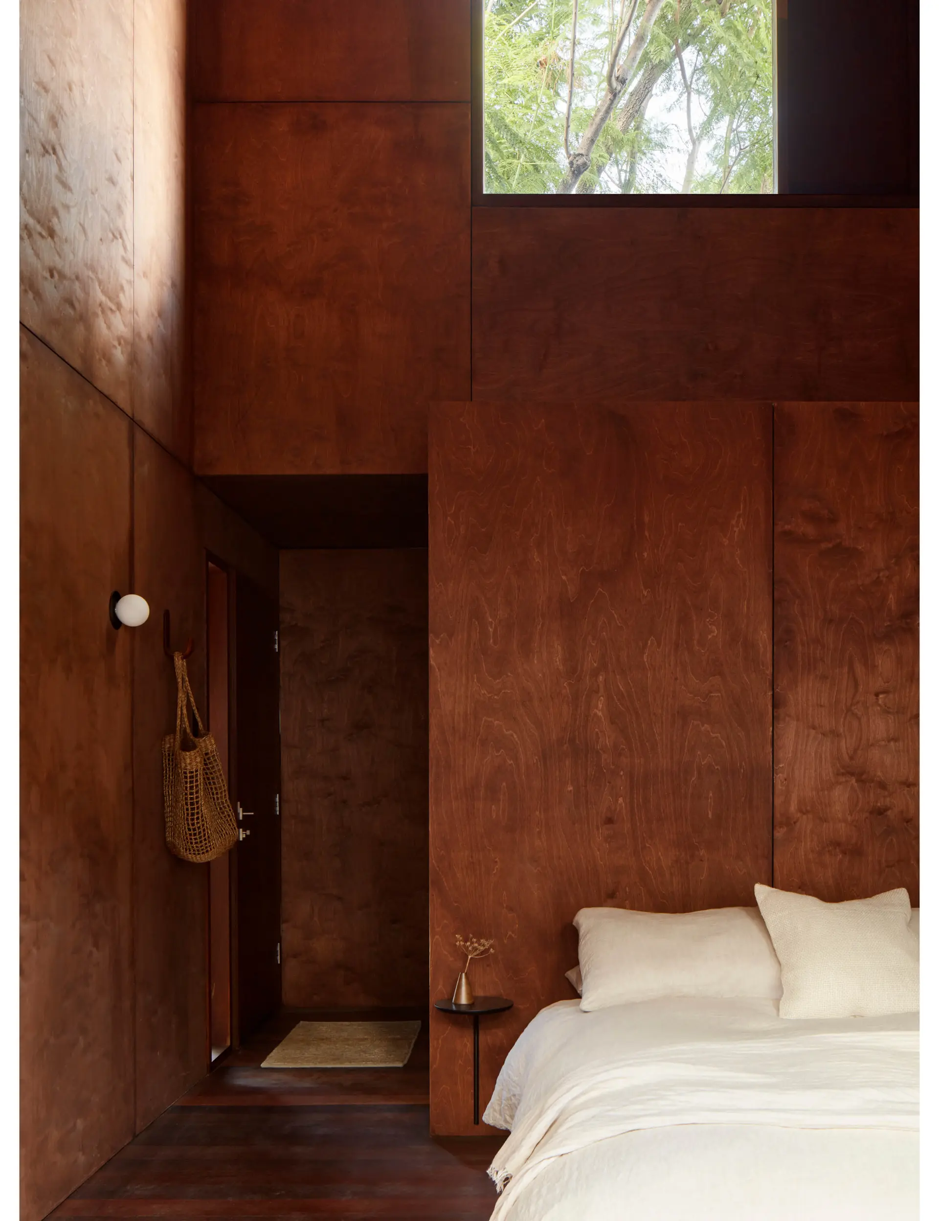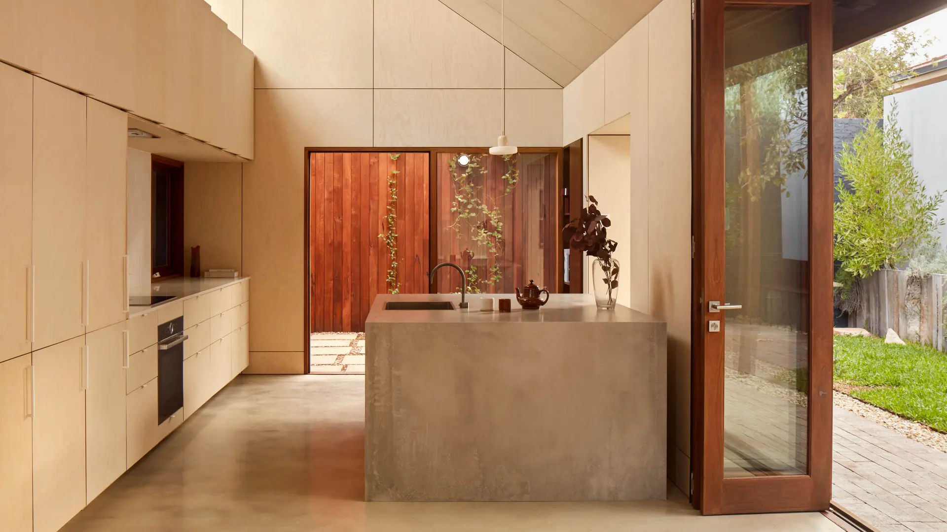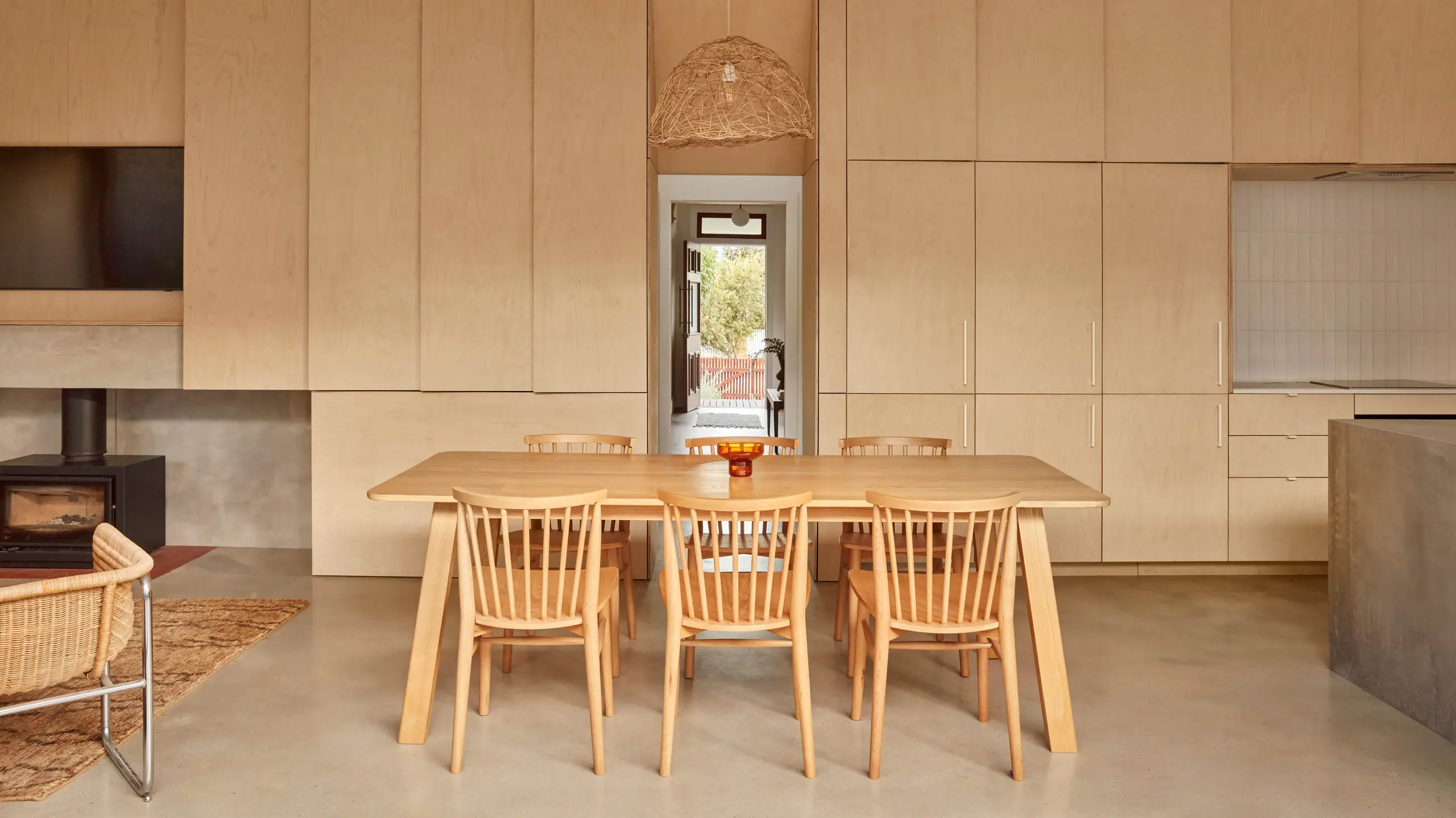 „Shadow House”, jak nazwano nową część domu, opiera swoją atmosferę na wyrafinowanej, zróżnicowanej palecie drewna — w każdej przestrzeni innej, ale razem tworzącej spójną, taktylną kompozycję. Na zewnątrz zastosowano opalane shou sugi ban wykonane z odzyskanego drewna jarrah. W atrium użyto surowego jarrah w naturalnym ciepłym odcieniu, studio wykończono sklejką bejcowaną na orzech, a nową strefę mieszkalną rozświetla jasna sklejka z akacji birch. To subtelne różnice materiałowe, które budują zmieniające się nastroje — od jasnych i lekkich po przytulne i wyciszone.
