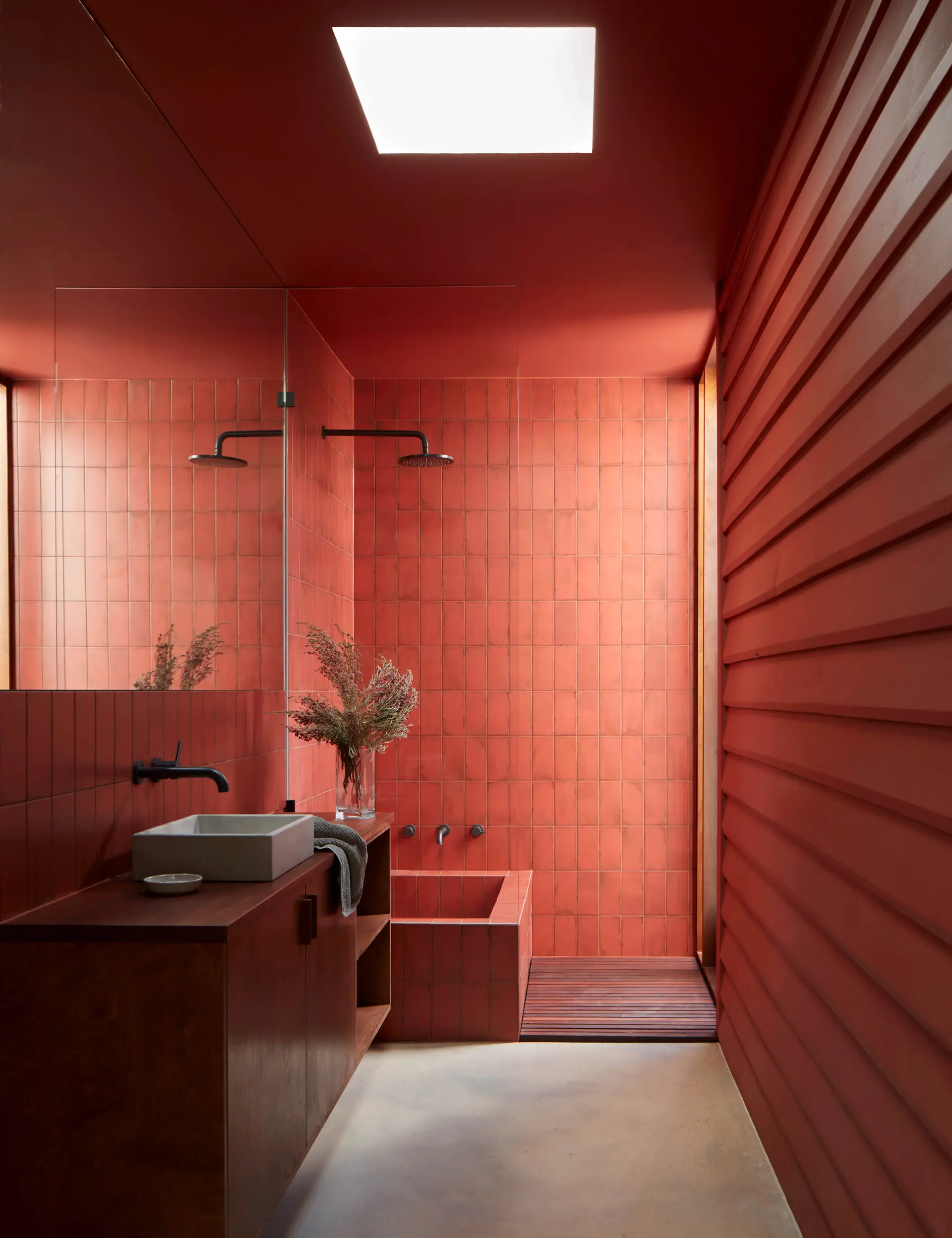 Wyrazista czerwono-brązowa barwa jarrah powraca również w nowej łazience, gdzie zestawiono ją z intensywną ochrową ceramiką. Przestrzenie przenika naturalne światło, odbijając się od drewna i tworząc dynamiczną grę cieni — efekt, który architekci wskazują jako jeden z największych sukcesów koncepcji.