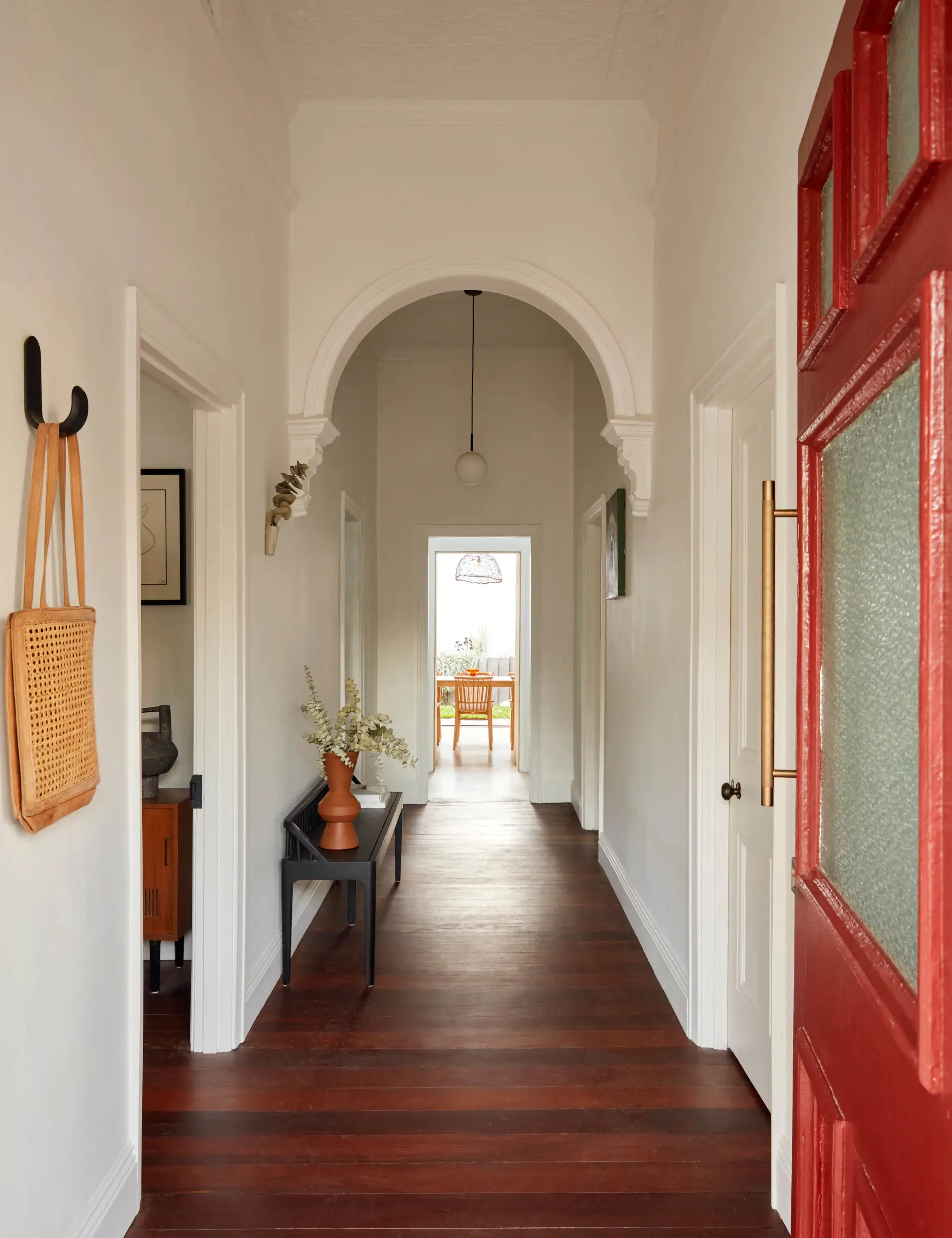 Zespół architektów rozpoczął od gruntownej restauracji oryginalnego 62-metrowego domu, zachowując całą jego strukturę. Przeprojektowano układ pokoi, by zmieścić prywatną łazienkę i garderobę, a historyczną materię odnowiono z pełnym poszanowaniem jej charakteru. Z tylnej części działki usunięto dobudówkę z azbestu, robiąc miejsce na nowy, 98-metrowy pawilon mieszczący salon, kuchnię i jadalnię. Ta przestrzeń została celowo ułożona na osi południowy zachód–północny wschód, co pozwala uchwycić zmieniające się światło przez cały dzień.