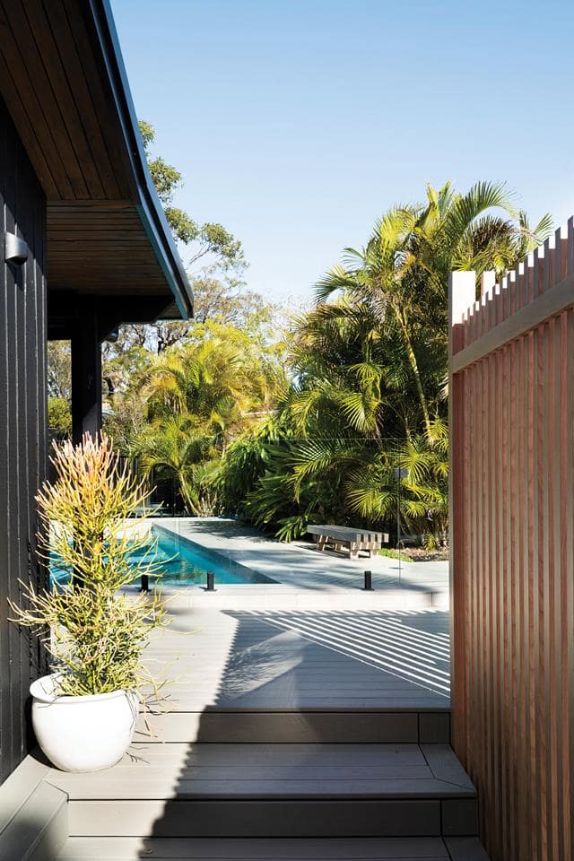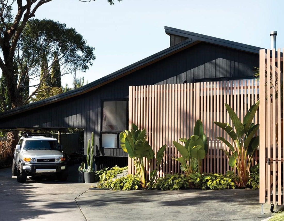 Renowacja objęła wymianę dachu na stalowy, odświeżenie drewnianej elewacji i montaż nowego ogrodzenia. Projekt zakładał maksymalne wykorzystanie światła dziennego oraz logiczny układ pomieszczeń. Zewnętrzna część domu zyskała zupełnie nowy wymiar dzięki spektakularnej metamorfozie ogrodu i basenu. Otoczony szarymi płytkami tarasowymi i kompozytowymi deskami, duży basen z mozaiką lastryko w stylu retro stał się centralnym punktem przestrzeni rekreacyjnej.