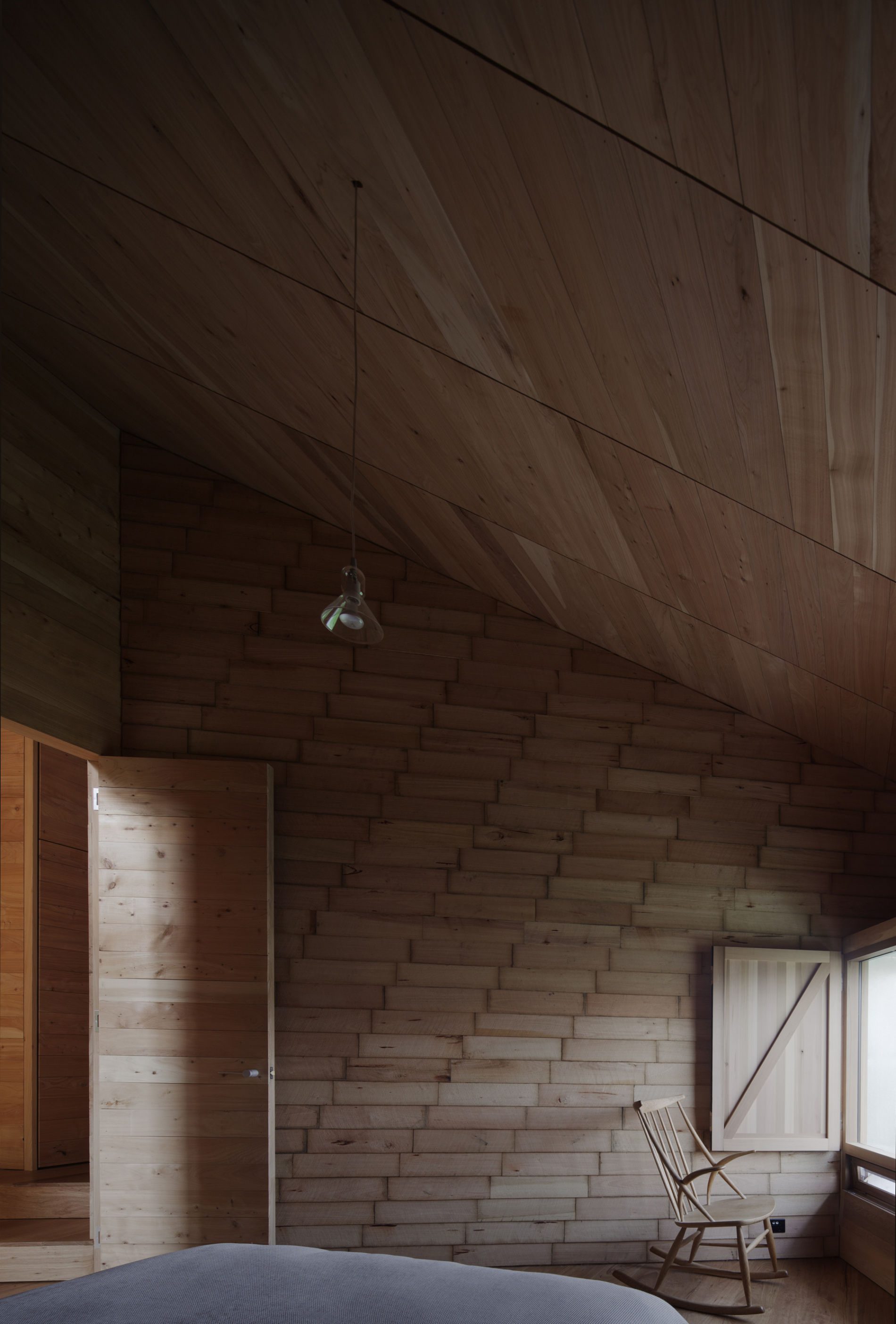 Kształt budynku został dopasowany do naturalnego otoczenia, z nieregularnym układem ścian, który wpływa na unikalną geometrie wnętrza. Tego typu projekt harmonizuje z wiejskim krajobrazem, jednocześnie wprowadzając elementy nowoczesnego stylu w wiejskim wydaniu. Zewnętrzna konstrukcja z blachy dachowej i wnętrze w całości wykonane z drewna sprawiają, że całość wpisuje się w minimalistyczny design. Do wykończenia sypialni użyto starych skrzynek na jabłka, które nadają pomieszczeniom niepowtarzalny charakter i funkcjonalność.