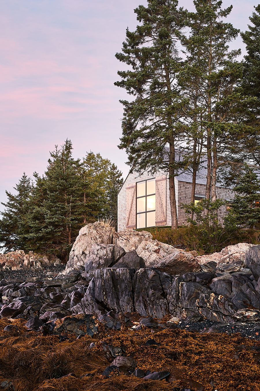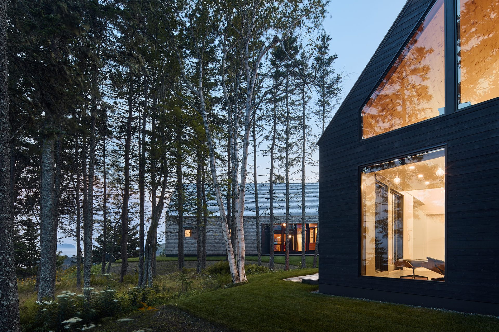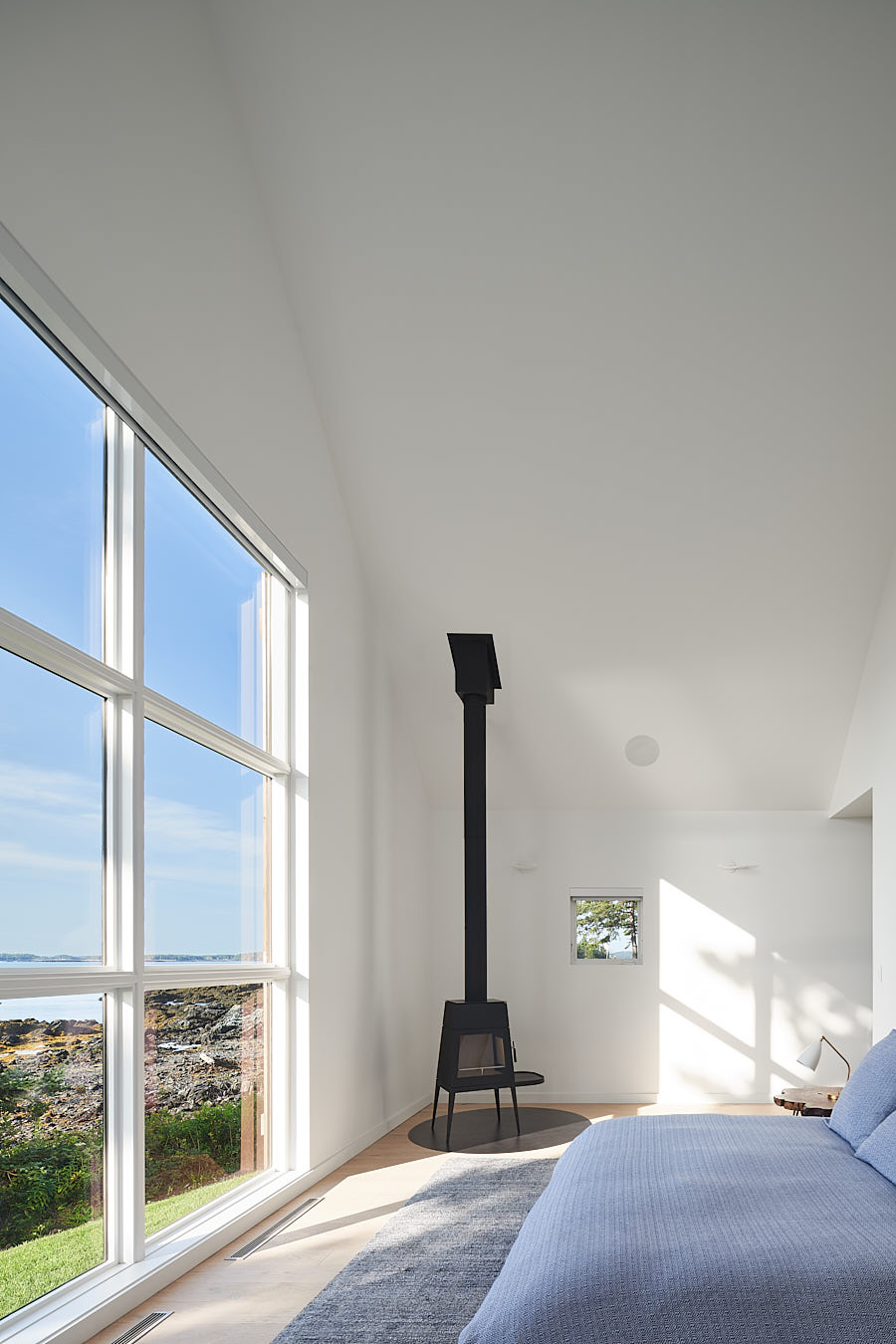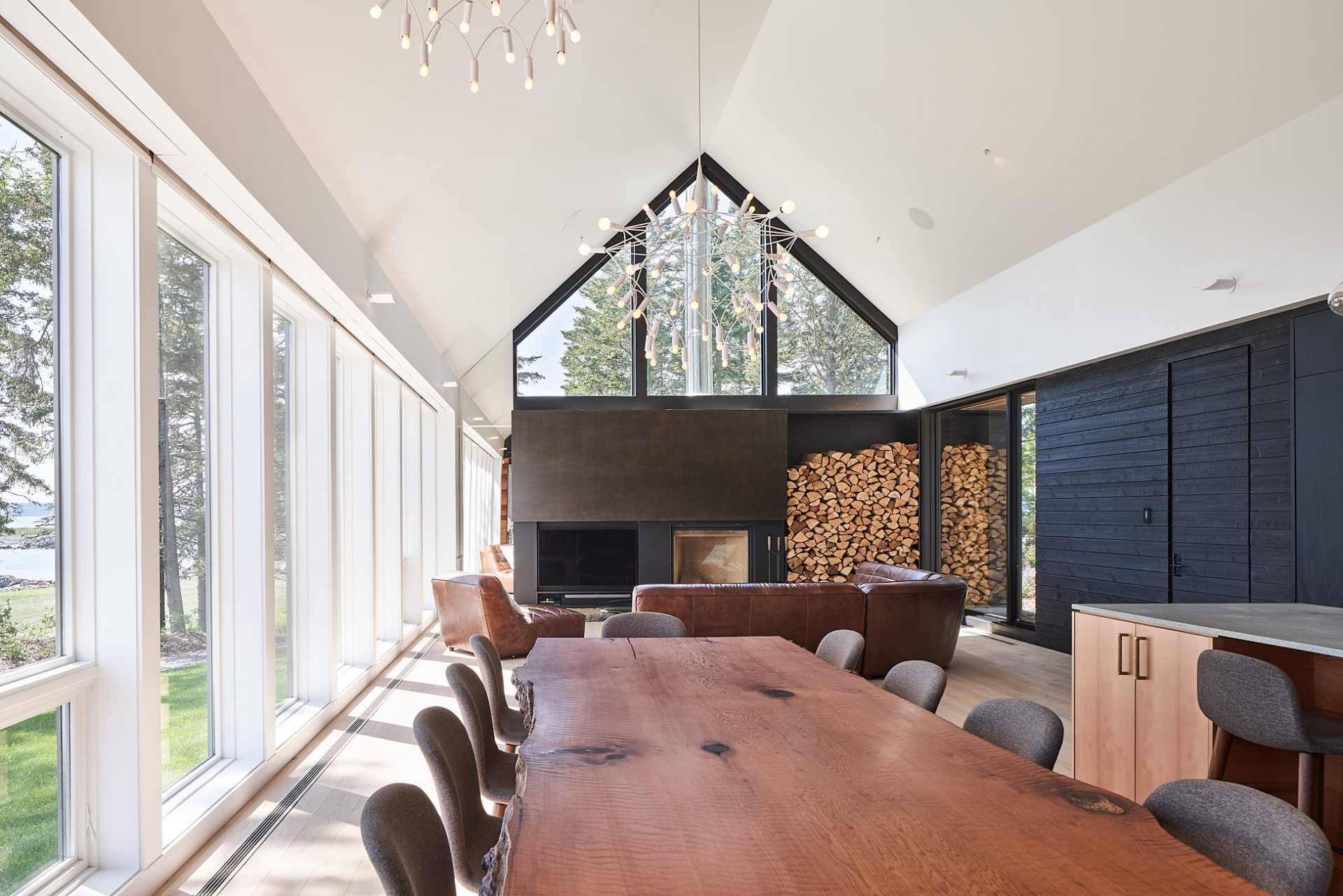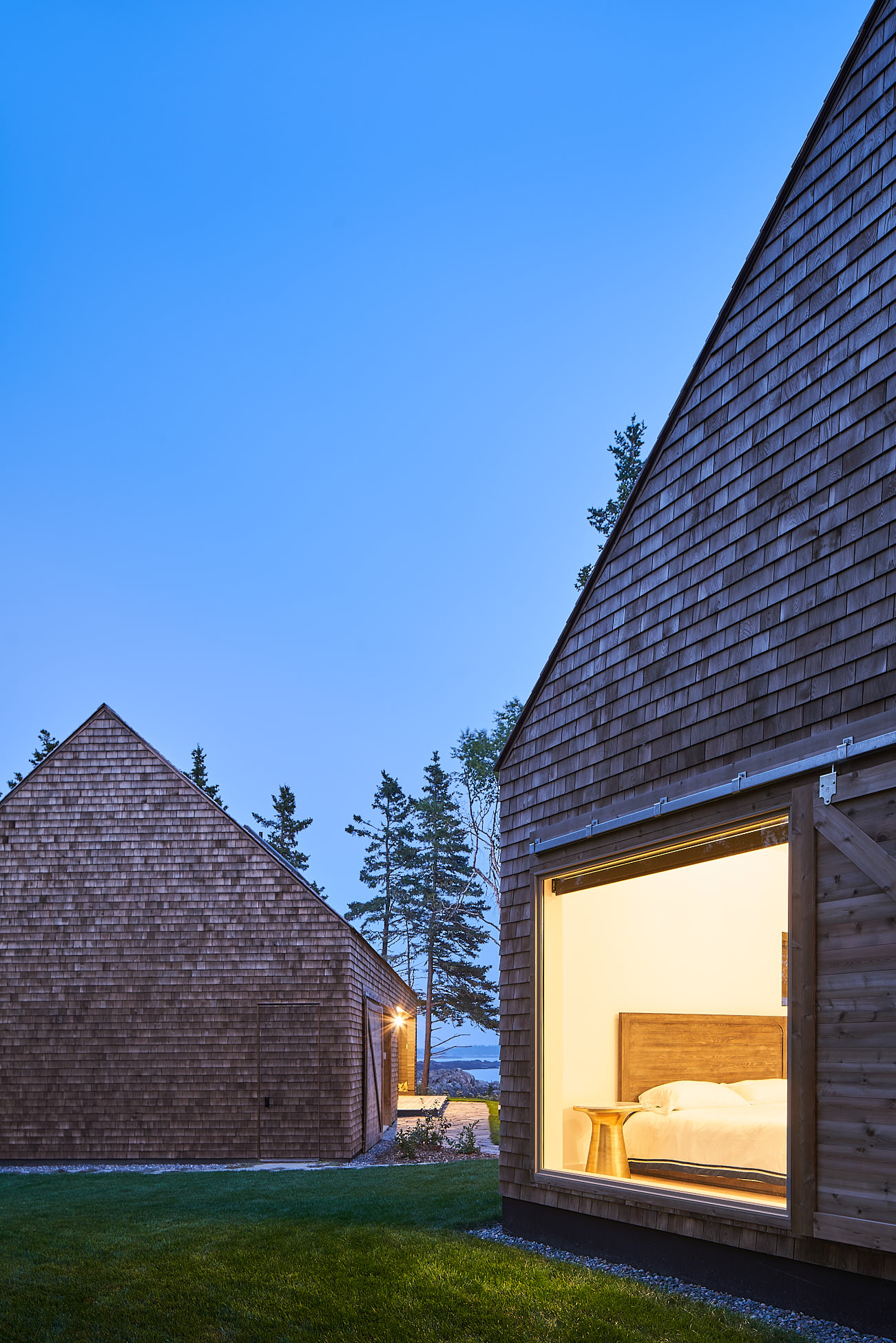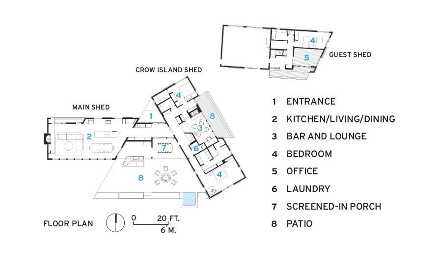 W głównej części budynku, tzw. Stodole, znajduje się otwarty plan z kuchnią, jadalnią i salonem. Wysokie na 6 metrów sufity, bielone dębowe podłogi oraz okna od podłogi do sufitu oferują wspaniały widok na zatokę. Nad kominkiem znajduje się duże trójkątne okno, a zewnętrzna kuchnia na kamiennym patio sprzyja spotkaniom towarzyskim. Przejście łączy główny budynek z Stodołą na Crow Island, której ściany i sufit wykończono cedrem zachodnim. W tej części znajdują się sypialnie, pralnia, bar i salon. Ciemniejsza stolarka i granatowe ściany wewnętrzne nadają przestrzeni przytulny charakter.