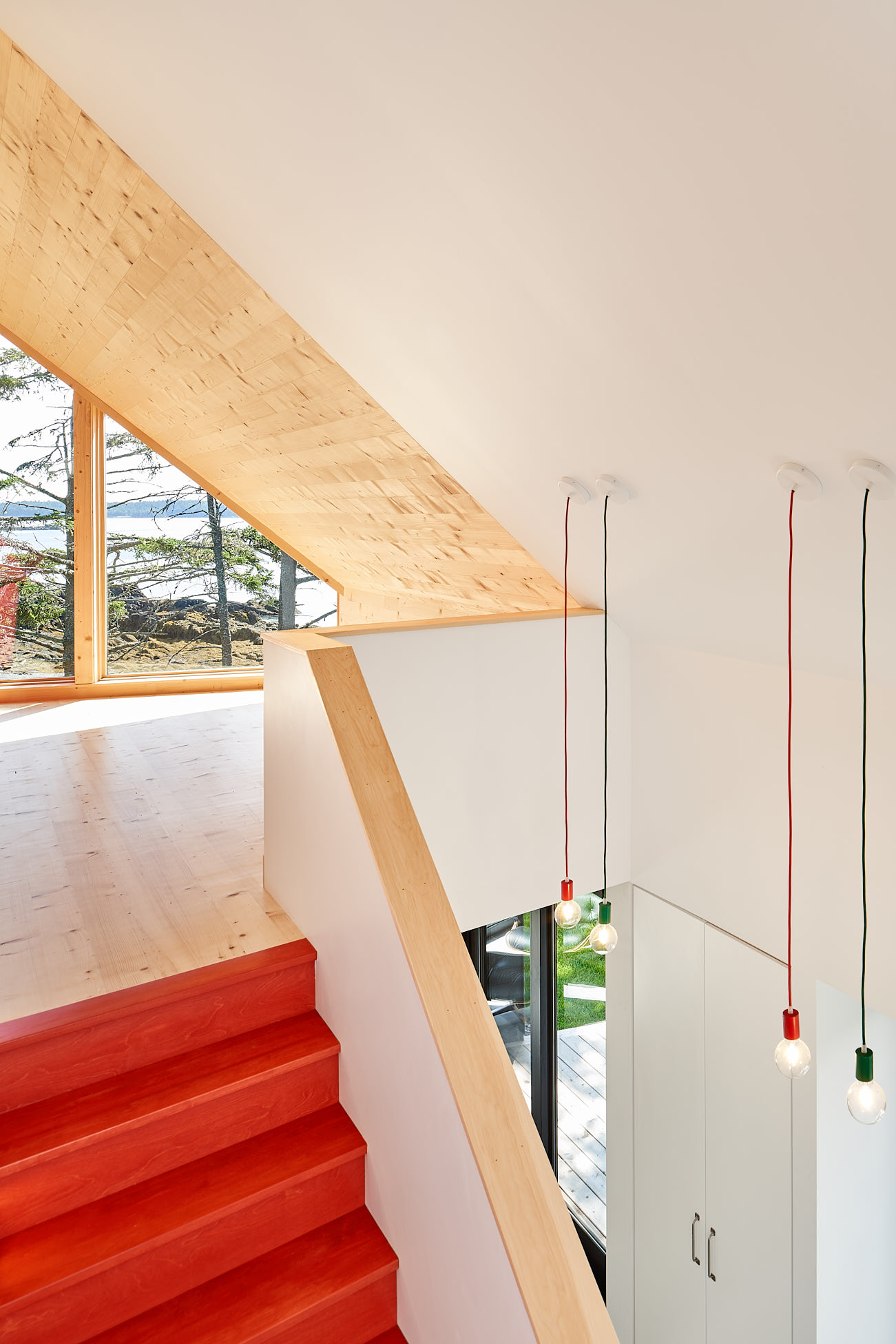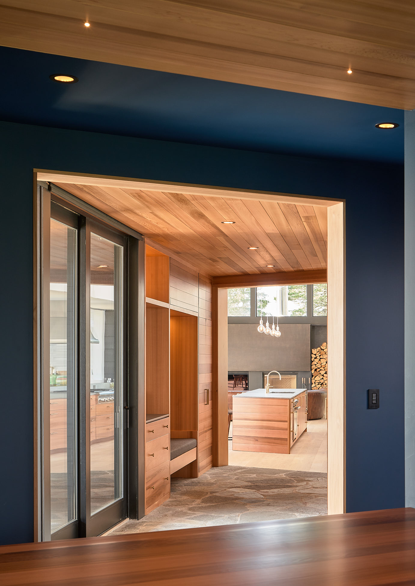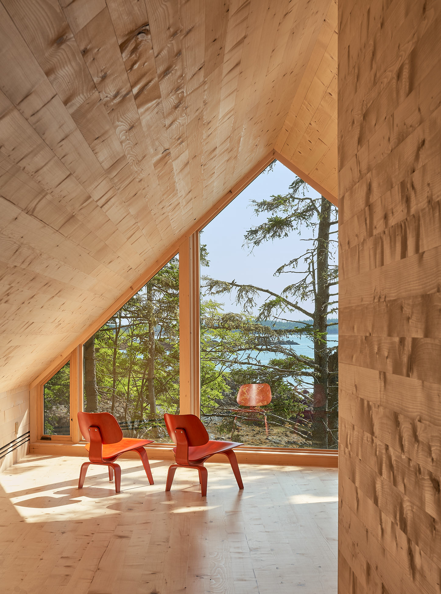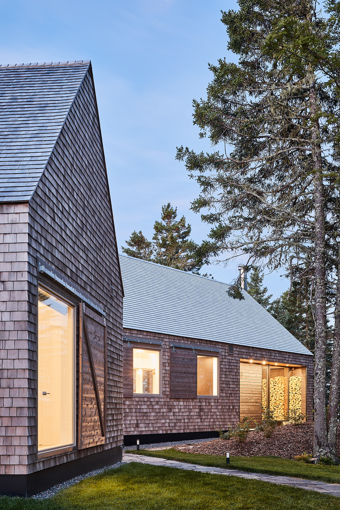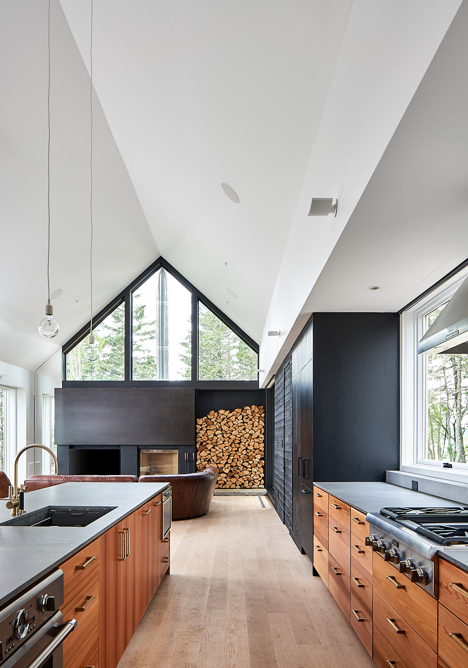 W głównej części budynku, tzw. Stodole, znajduje się otwarty plan z kuchnią, jadalnią i salonem. Wysokie na 6 metrów sufity, bielone dębowe podłogi oraz okna od podłogi do sufitu oferują wspaniały widok na zatokę. Nad kominkiem znajduje się duże trójkątne okno, a zewnętrzna kuchnia na kamiennym patio sprzyja spotkaniom towarzyskim. Przejście łączy główny budynek z Stodołą na Crow Island, której ściany i sufit wykończono cedrem zachodnim. W tej części znajdują się sypialnie, pralnia, bar i salon. Ciemniejsza stolarka i granatowe ściany wewnętrzne nadają przestrzeni przytulny charakter.