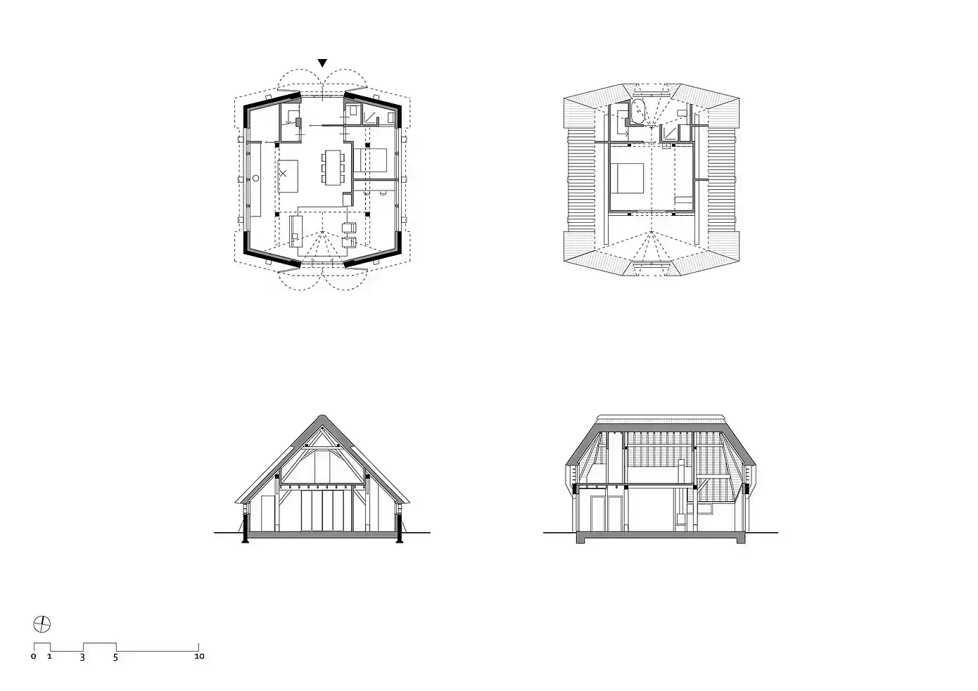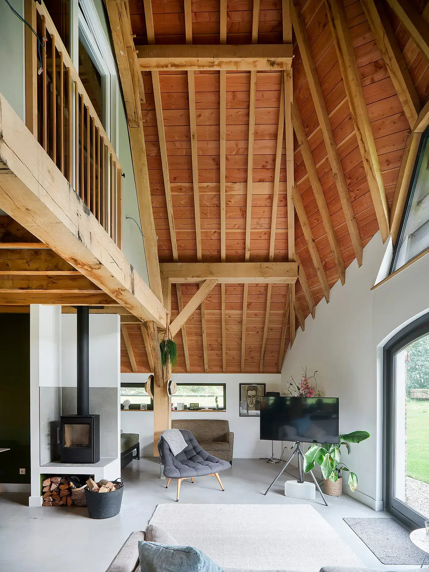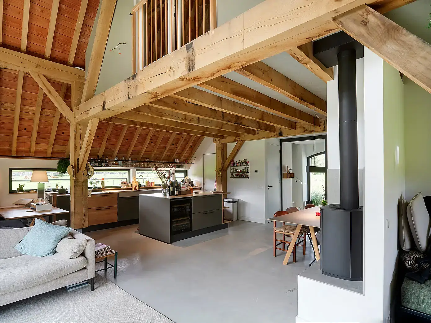 Hilberinkbosch Architecten wykorzystali nowoczesne techniki budowlane, aby przekształcić owczarnię, jednocześnie szanując jej tradycyjny kształt. Wnętrze domu jest teraz pełne światła, dzięki dużym przeszklonym otworom i drewnianym listwom, które zdobią elewację. Dawne drzwi stajni zostały przekształcone w rozległe okna, które harmonijnie łączą przeszłość z nowoczesną estetyką. Wewnątrz rustykalna konstrukcja z drewna nadaje wnętrzu ciepła i otwartości, a starannie zaprojektowane przestrzenie, w tym sypialnia i łazienka, znajdują się między historycznymi kratownicami, co pozwala zachować przestronność oryginalnej owczarni.