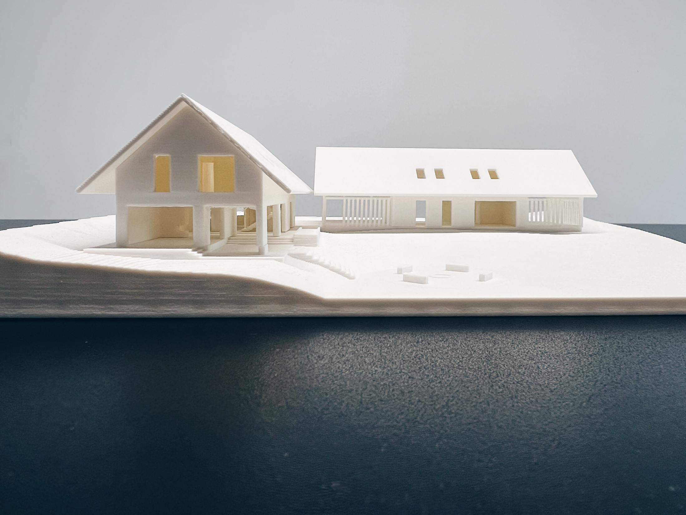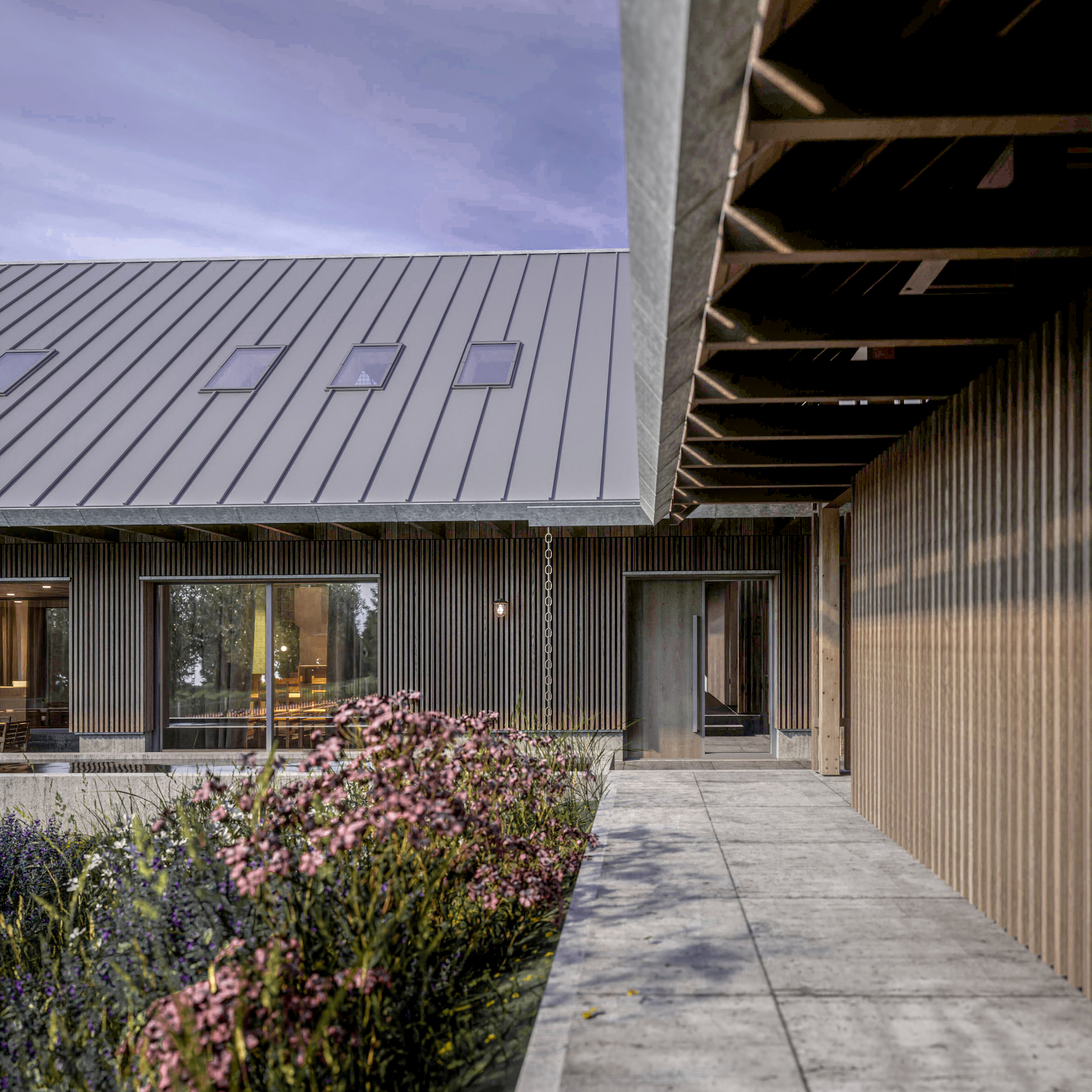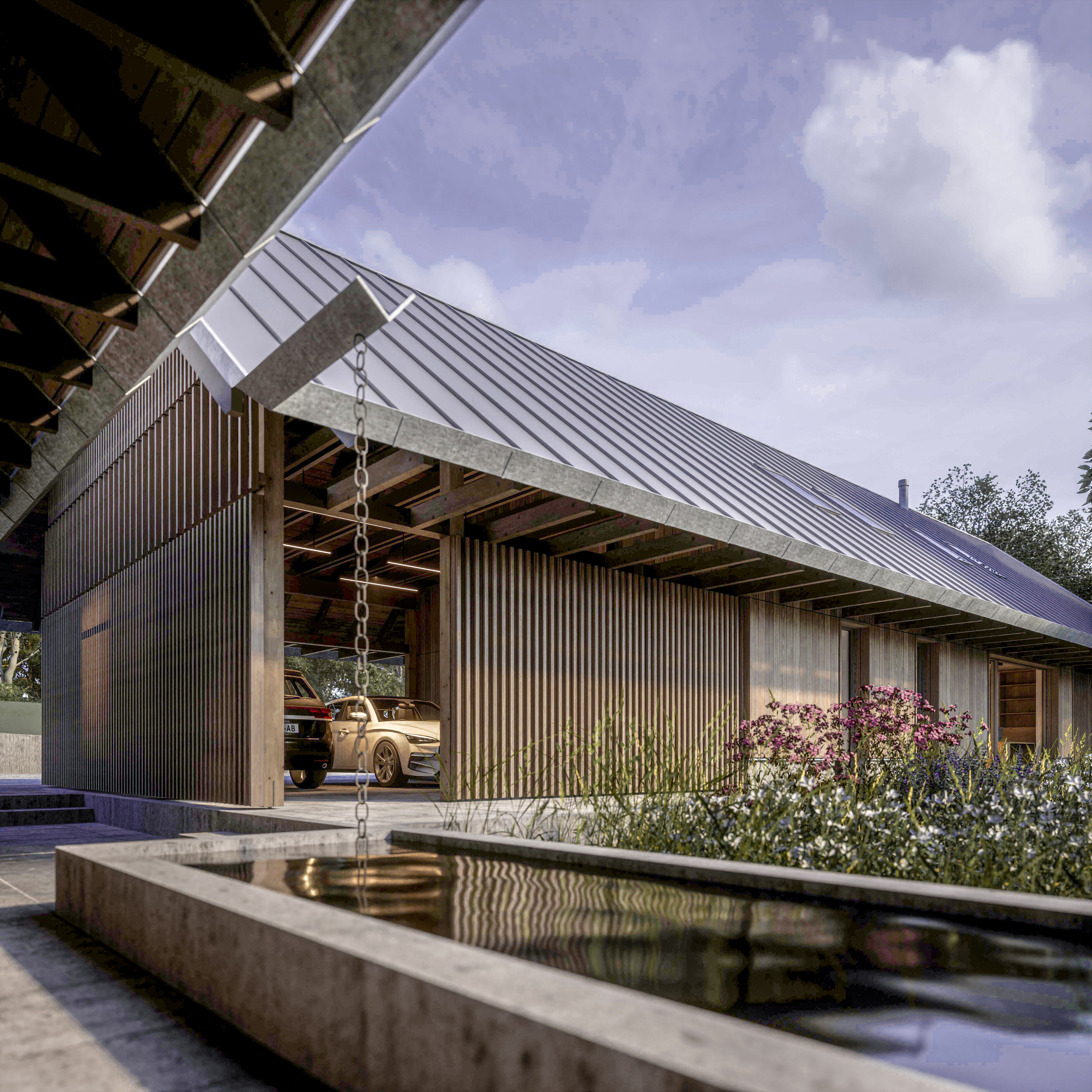 Oba budynki charakteryzują się daleko wysuniętymi okapami dachowymi, które umożliwiają przechodzenie między obiektami oraz wokół nich. Okapy zbierają wody opadowe oraz dystrybuują ją do naziemnego zbiornika otartego w formie sadzawki oraz do podziemnego zbiornika, z którego woda będzie używana na cele gospodarcze na działce do podlewania upraw warzyw i kwiatów.