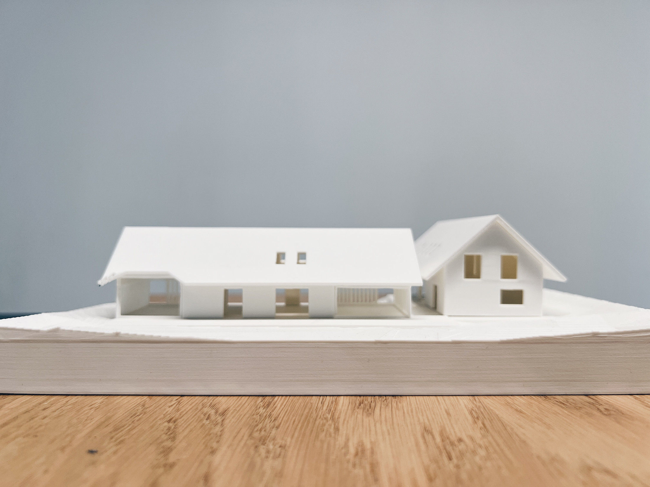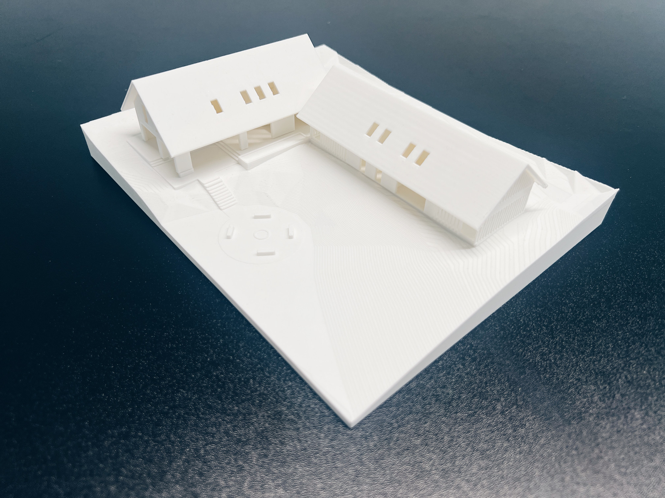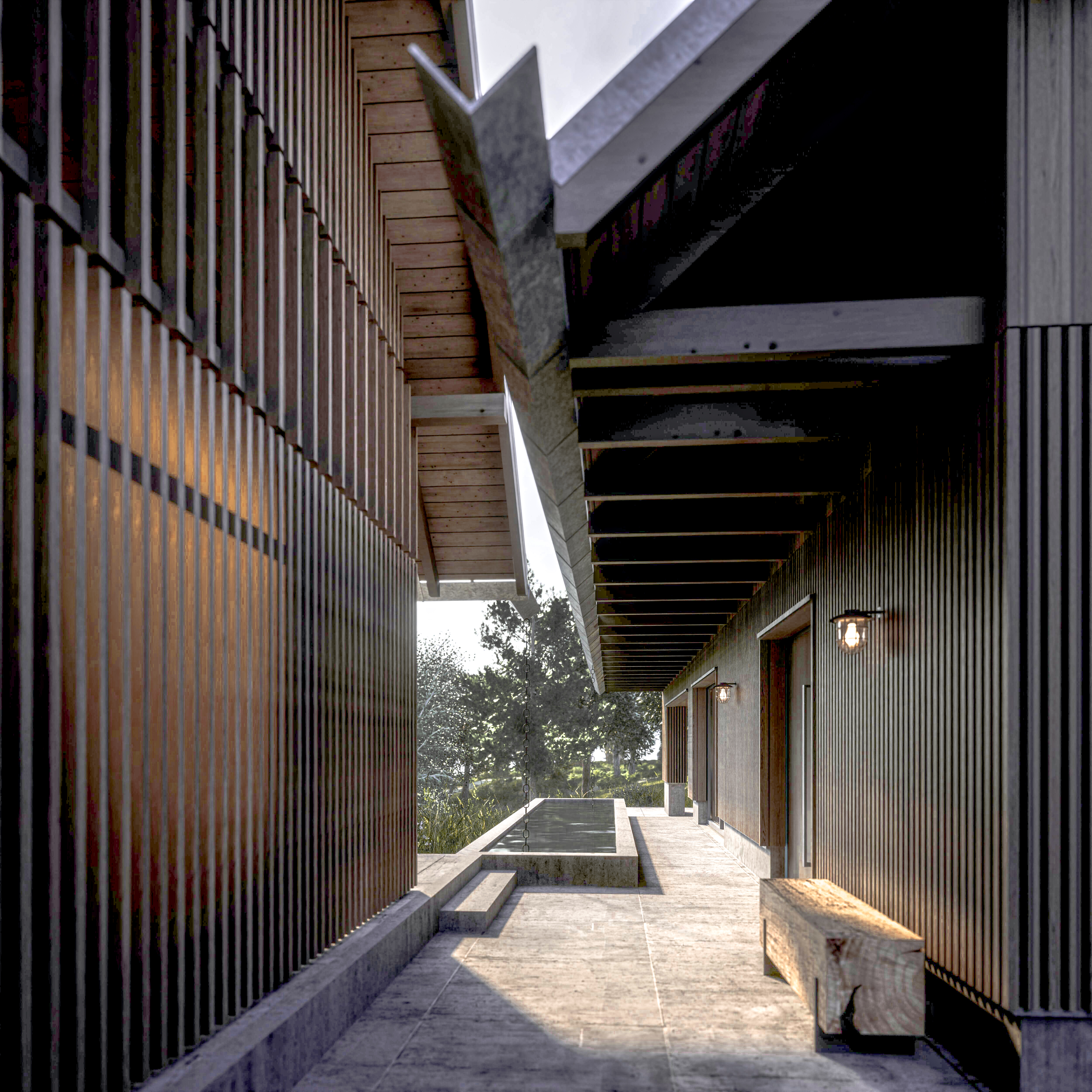 Oba budynki charakteryzują się daleko wysuniętymi okapami dachowymi, które umożliwiają przechodzenie między obiektami oraz wokół nich. Okapy zbierają wody opadowe oraz dystrybuują ją do naziemnego zbiornika otartego w formie sadzawki oraz do podziemnego zbiornika, z którego woda będzie używana na cele gospodarcze na działce do podlewania upraw warzyw i kwiatów.