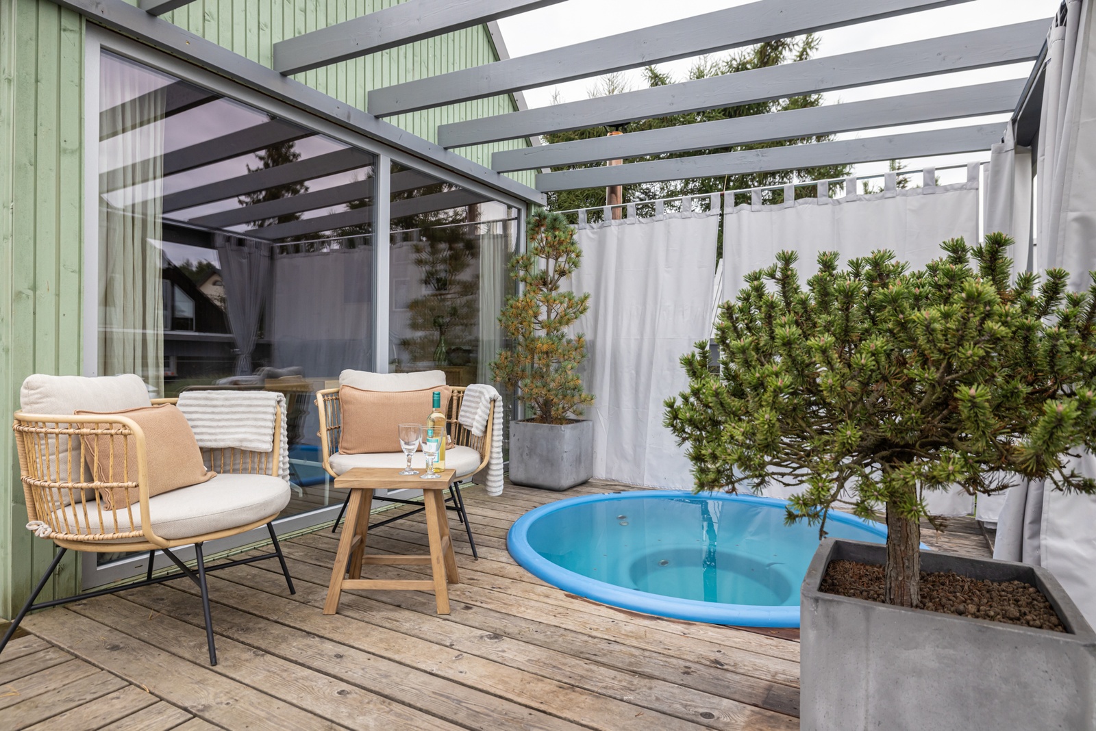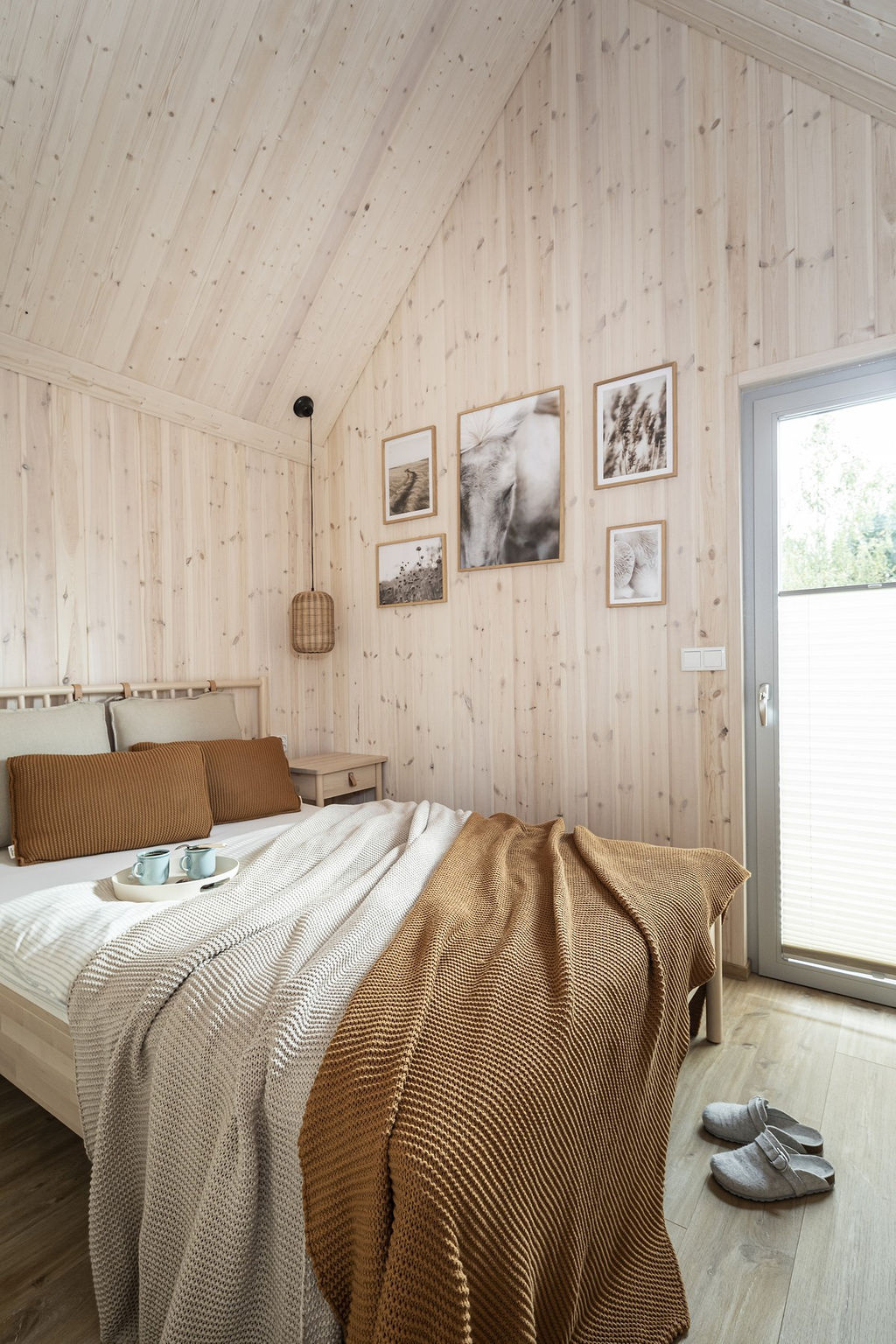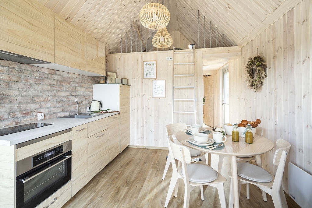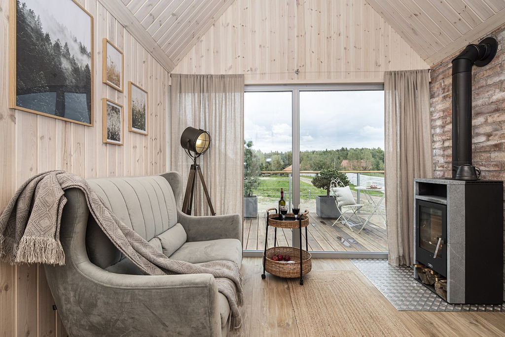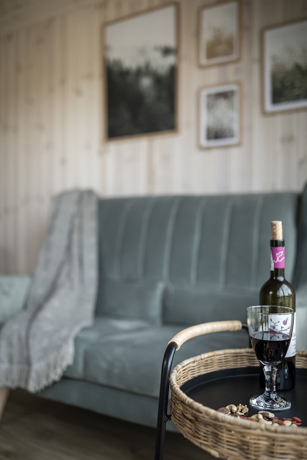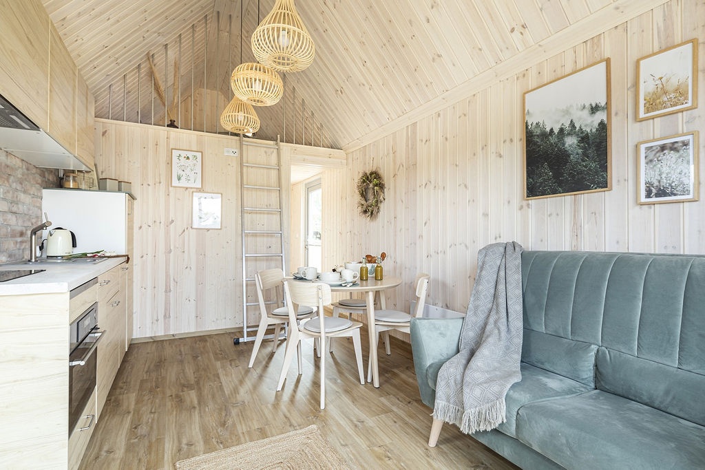 Domek Sielankowo to 35 metrów kwadratowych perfekcyjnie wykorzystanej przestrzeni, która idealnie nadaje się dla dwóch par lub małej rodziny z ukochanym zwierzakiem. Wnętrze urzeka swoją przytulnością, a goście od razu poczują się tam jak w domu. Właściciele, niczym przyjaciele, zapraszają na wspólną lampkę wina o zachodzie słońca, podziwianego z tarasu, który w pełni oddaje klimat tego magicznego miejsca.