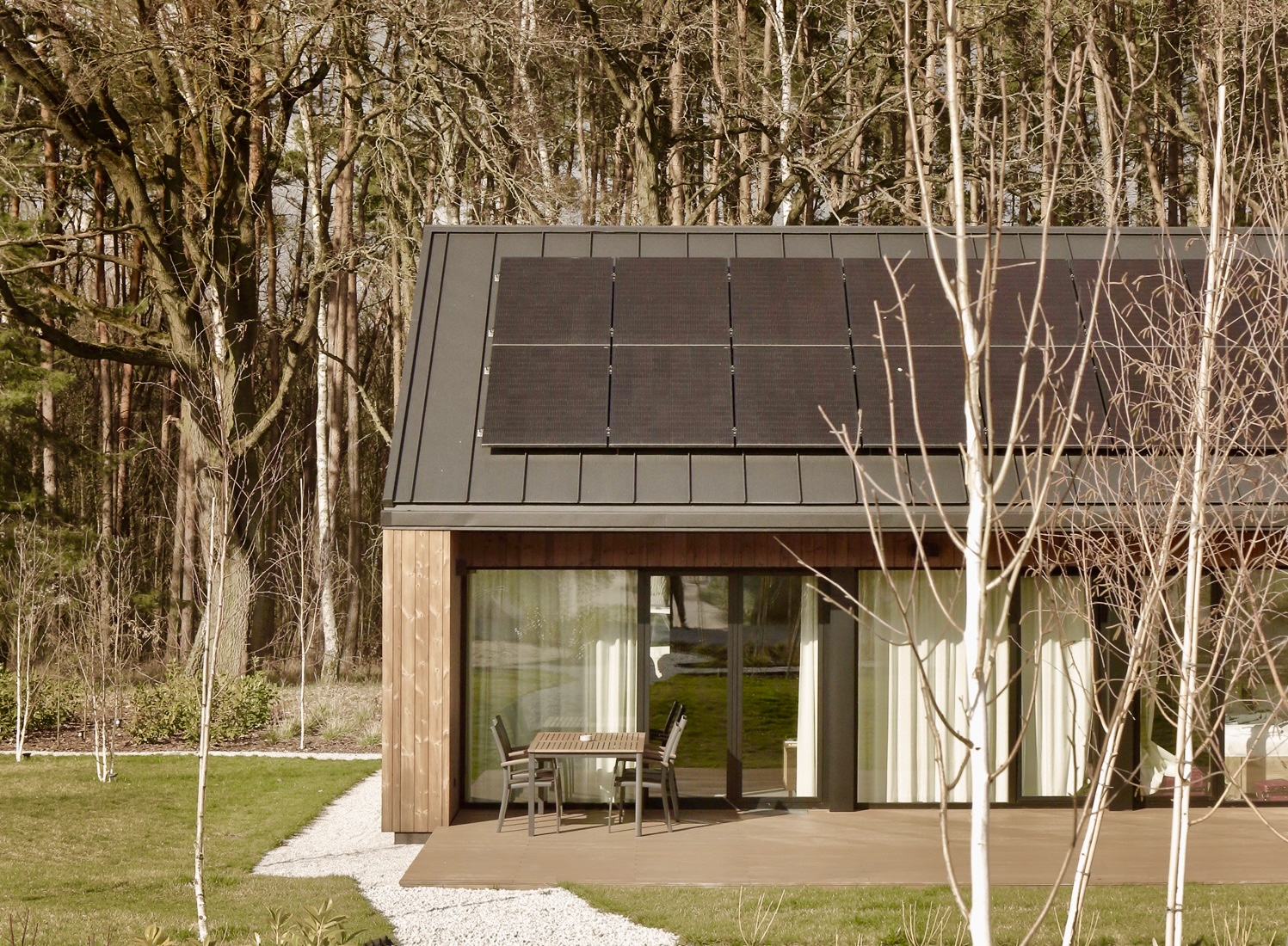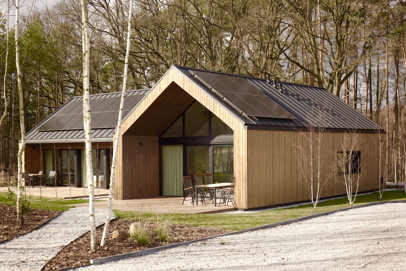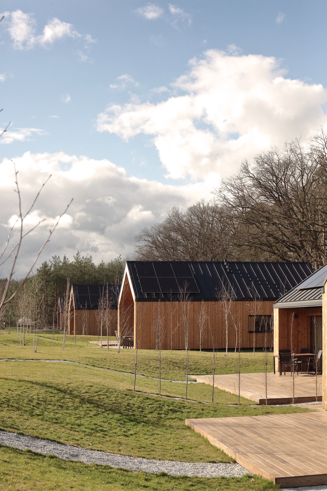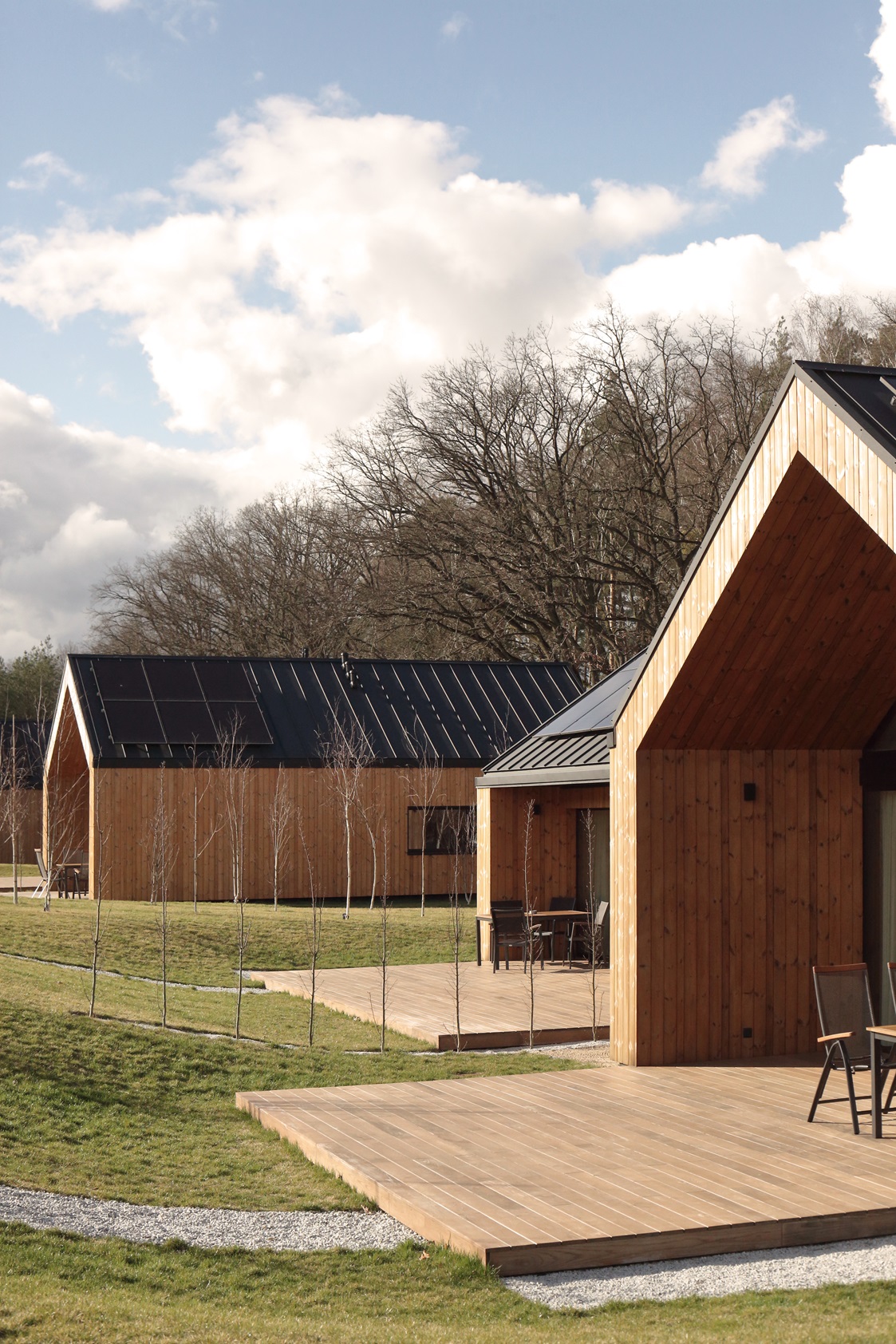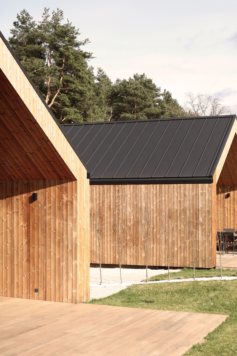 Pośród malowniczych lasów, tuż nad brzegiem jeziora w Sierakowie, powstała wyjątkowa enklawa nowoczesnej architektury harmonijnie wpisanej w otaczającą przyrodę. To kompleks dziesięciu parterowych domów dwulokalowych, zaprojektowanych w układzie litery L i H, które łączą nowoczesny design z bliskością natury. Elewacje budynków wykonano z drewna, co nie tylko podkreśla ich naturalny charakter, ale także wpisuje się w leśny krajobraz. Maksymalna powierzchnia przeszkleń sprawia, że wnętrza domów przenikają się z otoczeniem, oferując mieszkańcom nieustanny kontakt z przyrodą i dostęp do malowniczych widoków.