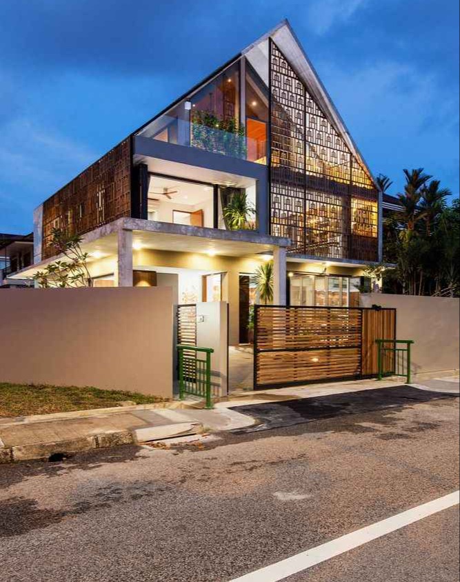 Ten dom, dawniej niewielki parterowy budynek przy przystanku na ruchliwym skrzyżowaniu ulic w Singapurze, przeszedł imponującą transformację. Dziś zachwyca dynamiczną formą oraz starannie dobranymi materiałami, które nadają mu charakter współczesnej architektury, kojarzonej z ideą nowoczesna stodoła. Surowy beton połączono z perfekcyjnie dopasowanymi ekranami z drewna tekowego z Bali, tworząc fasadę, która chroni wnętrze przed miejskim zgiełkiem, jednocześnie zapewniając dostęp naturalnego światła, panoramiczne widoki i efektywną cyrkulację powietrza. Solidne mury graniczne i zaprojektowana roślinność pomagają wyciszyć hałas uliczny, nie odbierając przechodniom możliwości podziwiania intrygującej bryły.