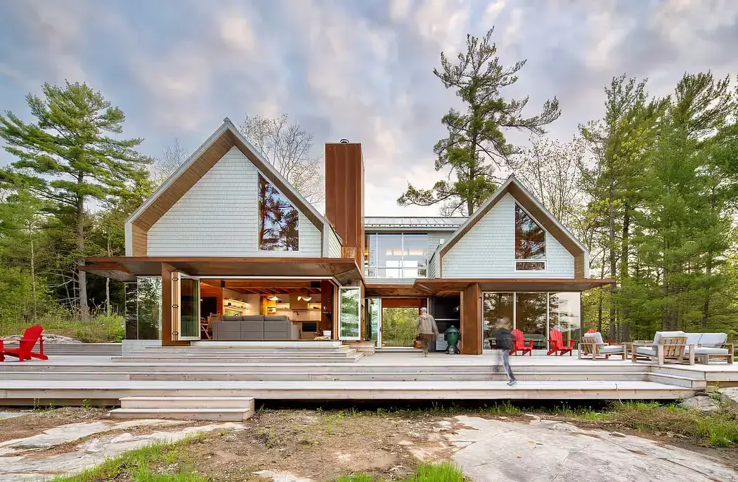 Dom jednorodzinny obejmuje spokojne piękno krajobrazu Georgian Bay, zacierając granicę między środowiskiem zabudowanym a naturalnym otoczeniem. Projekt ma na celu usunięcie wszelkiego poczucia podziału, pozwalając, aby spokój otoczenia nad jeziorem przeniknął do przestrzeni wewnętrznych.