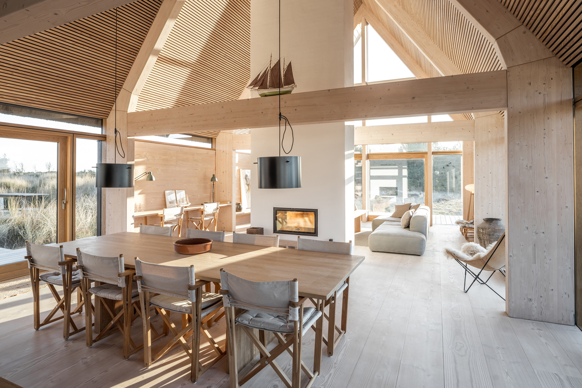 Stonowana paleta kolorystyczna i zapach drewna tworzą naturalną i ciepłą atmosferę. Architekci zastosowali akustyczny sufit, aby poprawić komfort i zredukować hałas w przestrzeniach mieszkalnych. Dzięki tym rozwiązaniom Skagen Klitgård House jest domem wakacyjnym, w którym granica między wnętrzem a zewnętrzem się zaciera.