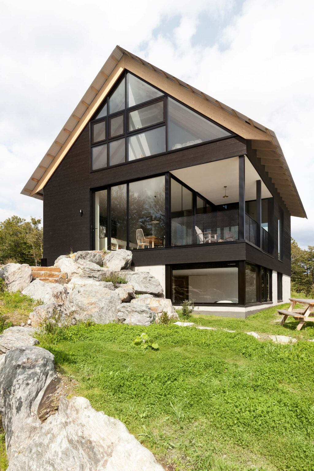 Chalet Paramount to nowoczesna stodoła, która w subtelny sposób reinterpretuję klasyczny alpejski domek. Położony na skalistym przylądku, projekt łączy w sobie tradycyjną drewnianą konstrukcję z współczesnymi rozwiązaniami architektonicznymi. Z daleka, drewniana konstrukcja z niewielkimi oknami i dachem z blachy falistej przypomina tradycyjny domek górski, ale w środku kryje nowoczesne wnętrza, które oferują komfort i wyjątkowy kontakt z naturą.