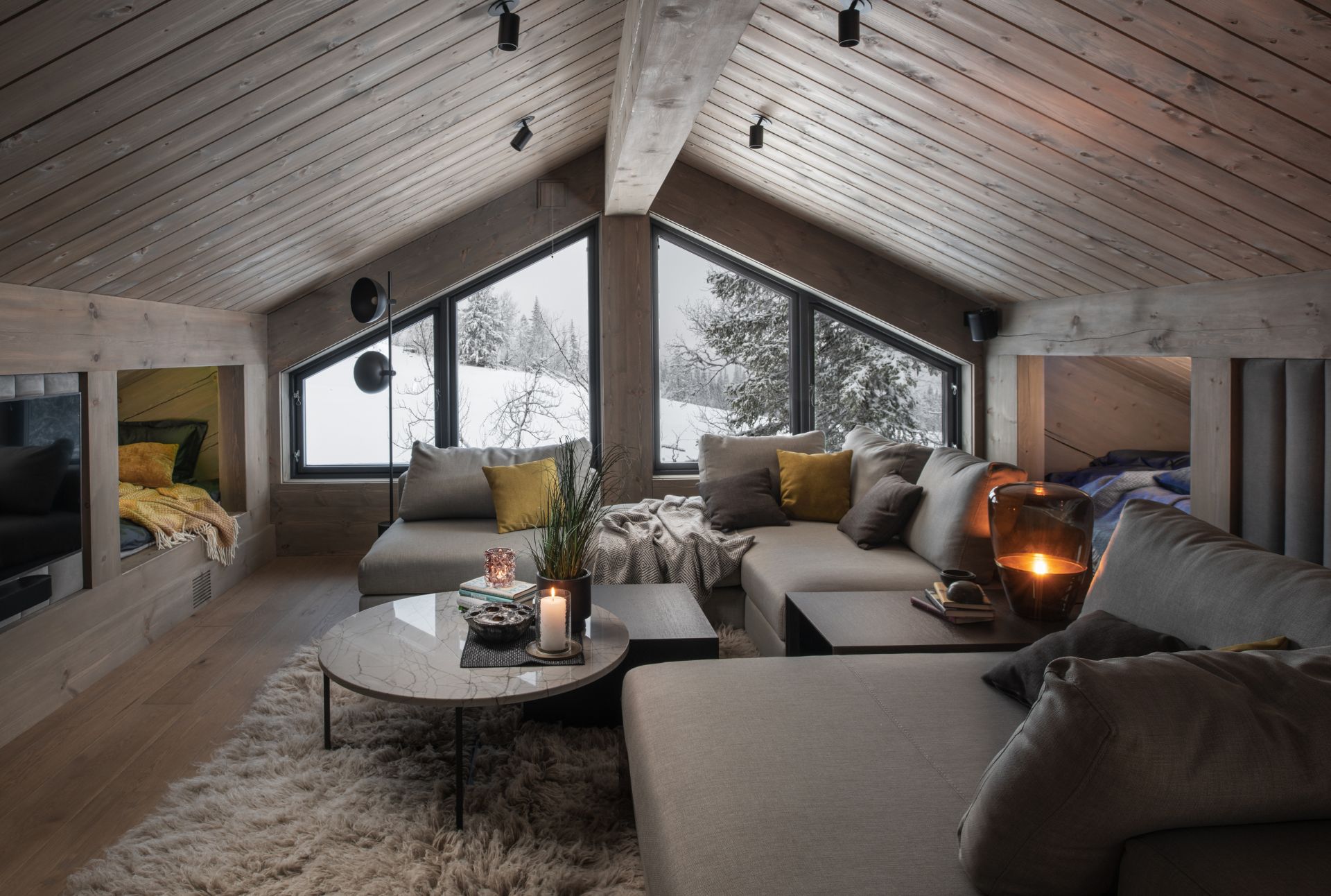 W ostatniej części piętra znajduje się duża sala telewizyjna z wbudowanymi łóżkami, idealna do relaksu. Duże okna oraz przeszklone drzwi w pokoju telewizyjnym sprawiają, że przestrzeń jest pełna światła, a połączenie z hollem dodaje poczucia otwartej przestrzeni. Całość tego pięknego domu, utrzymana w duchu nowoczesnej stodoły, łączy funkcjonalność, elegancję i ciepło, co czyni ją idealnym miejscem do życia.