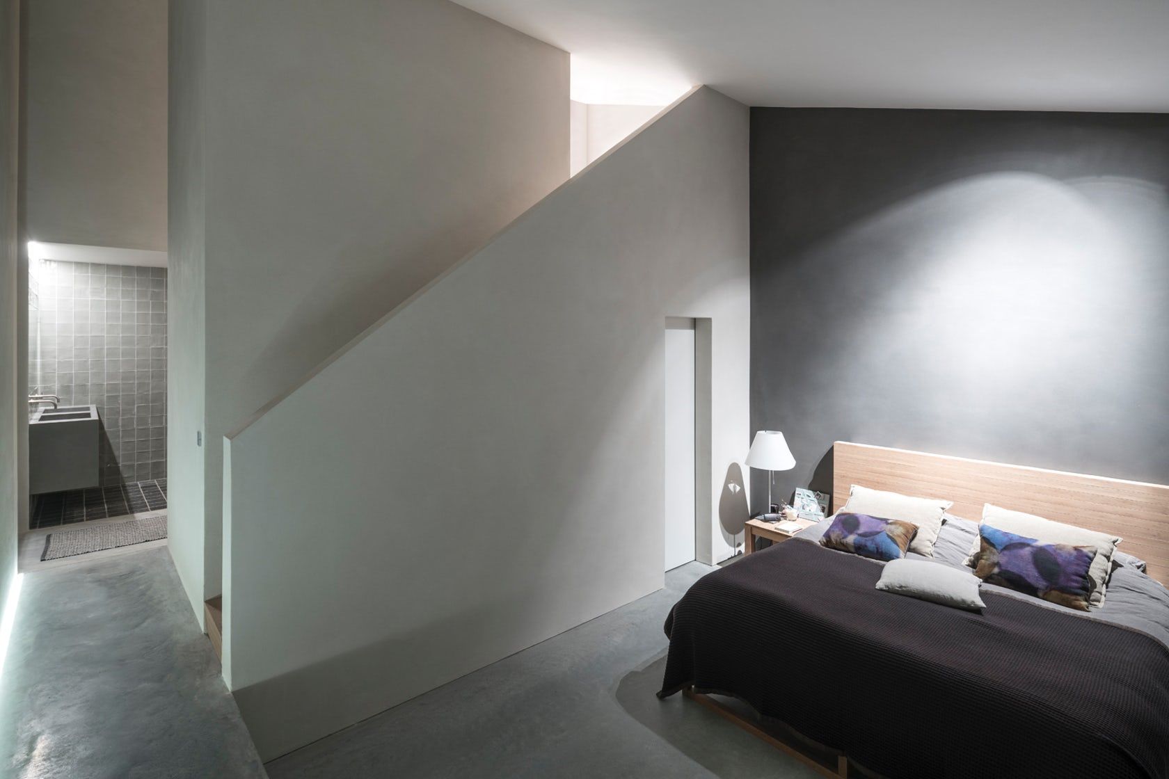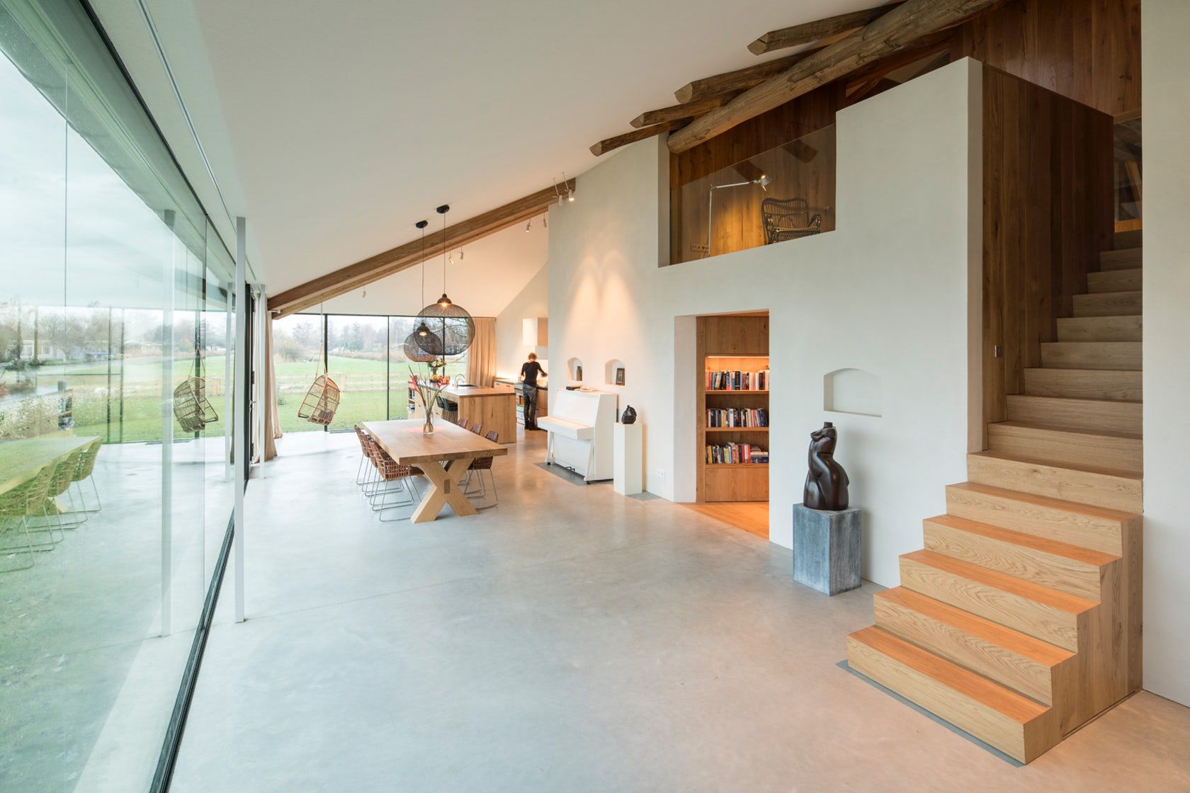 Kluczowym zabiegiem architektonicznym było przedłużenie połaci dachu głównej części budynku poza pierwotną, ceglaną fasadę. Dzięki temu po dwóch stronach powstała nowa strefa o szerokości od 5 do 7 metrów, w której zaprojektowano salon, kuchnię oraz dwie sypialnie. Pozostałe pomieszczenia – dodatkowe sypialnie, gabinet i zaplecze użytkowe – ulokowano w starej części Stolpa. Nowa przestrzeń dzienna wyróżnia się betonową, opadającą posadzką oraz panoramicznymi przeszkleniami o długości 32 metrów, otwierającymi widok na krajobraz Wormer i Jisperveld. Całość przywodzi na myśl ideę, jaką dziś określa się jako nowoczesna stodoła – połączenie prostoty formy, funkcjonalności i silnej relacji z otoczeniem.