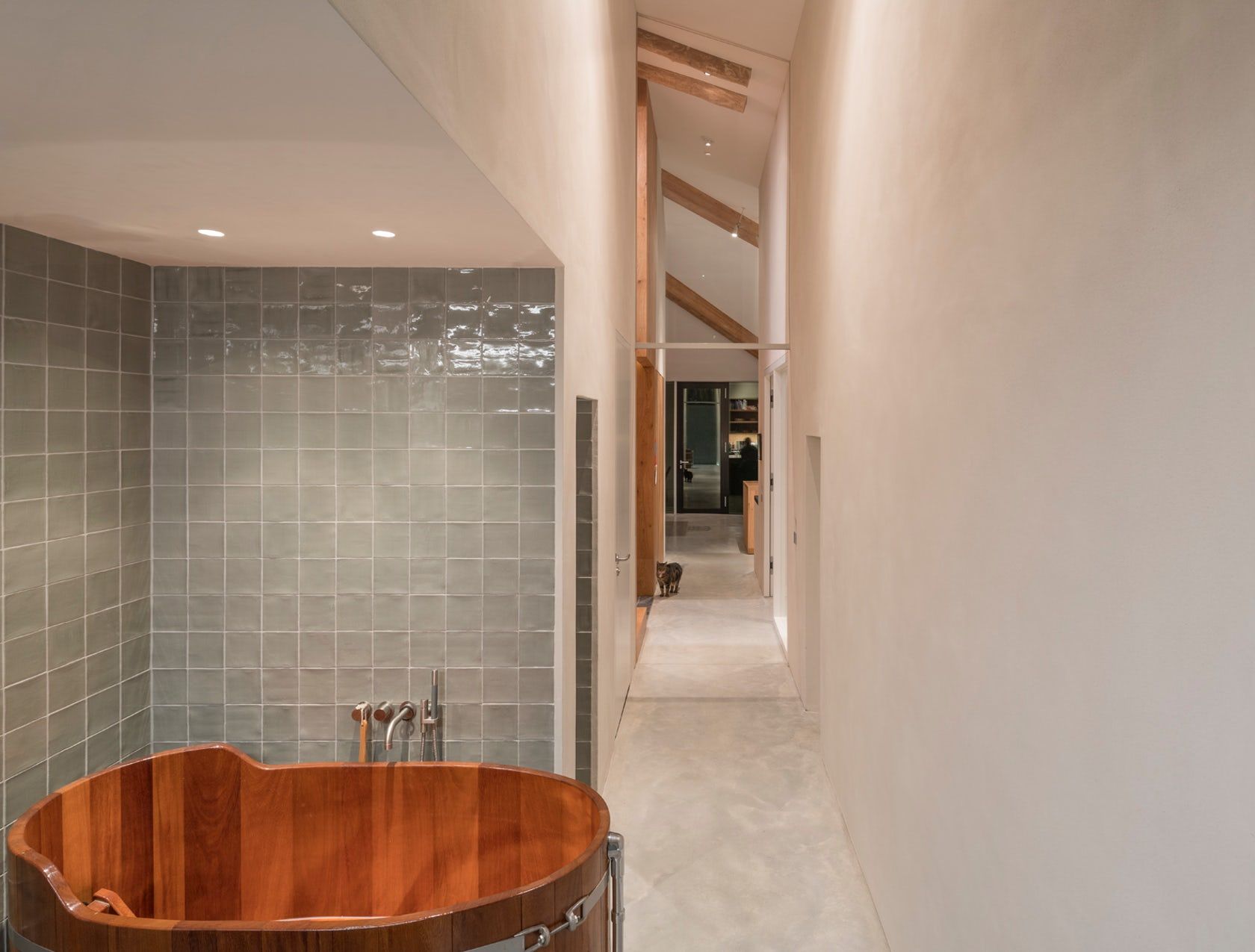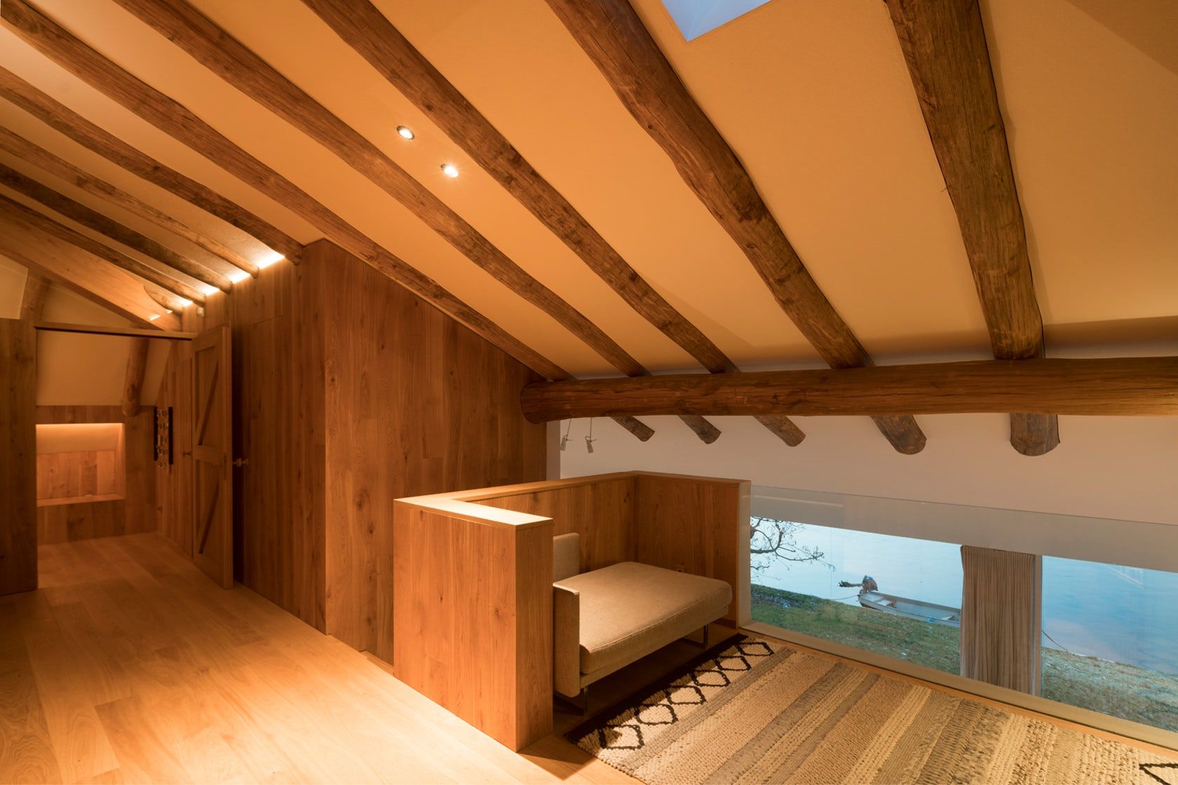 Kontrast między starym a nowym podkreślają również materiały i atmosfera wnętrz. Oryginalna część budynku zachowała bardziej introwertyczny charakter, z dominacją dębowego drewna i przytulnych proporcji. Zniszczona wschodnia elewacja została odtworzona w sposób patchworkowy, z wykorzystaniem różnych gatunków drewna, poddanego tradycyjnej technice opalania, co zwiększa jego trwałość i nadaje elewacji szlachetną fakturę. Projekt jest przykładem współczesnej adaptacji zabytkowej architektury rolniczej, która nie konkuruje z historią, lecz ją twórczo interpretuje.