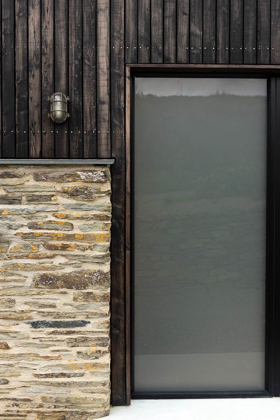 Elewację wykończono opaloną modrzewiową deską, która kontrastuje z surowym kamieniem, tworząc subtelny dialog między dawnym a nowym. Dach o podwójnym spadku rozdziela strefy funkcjonalne – dzienną i nocną – nadając całości rytmiczny, harmonijny charakter.