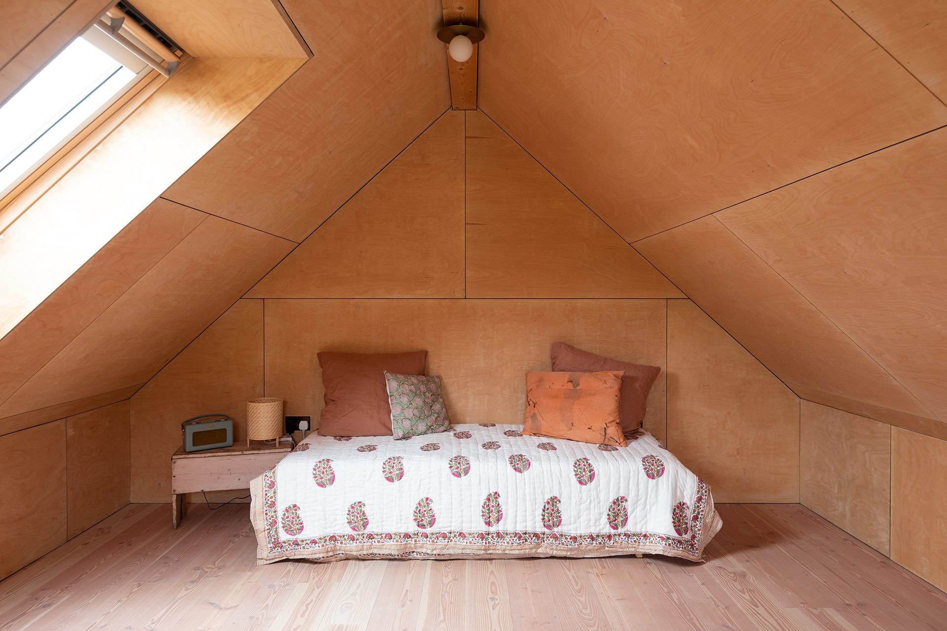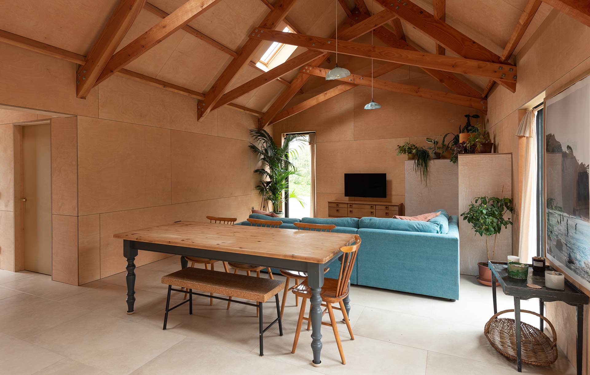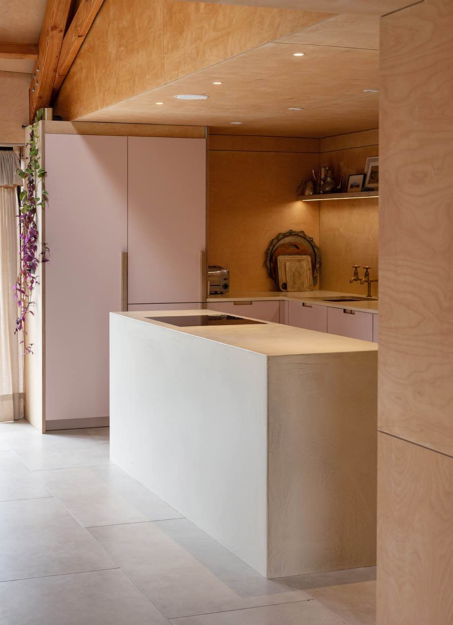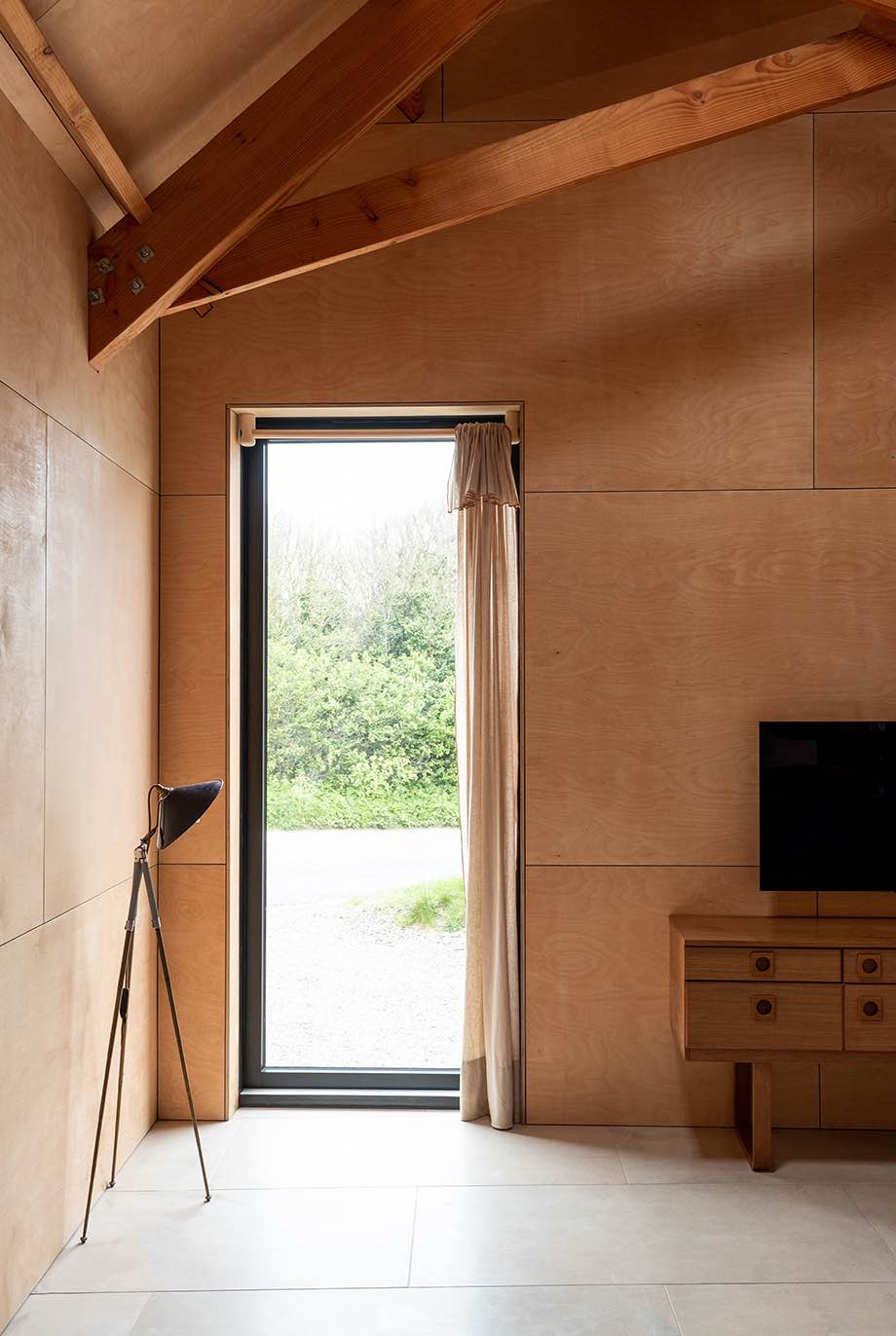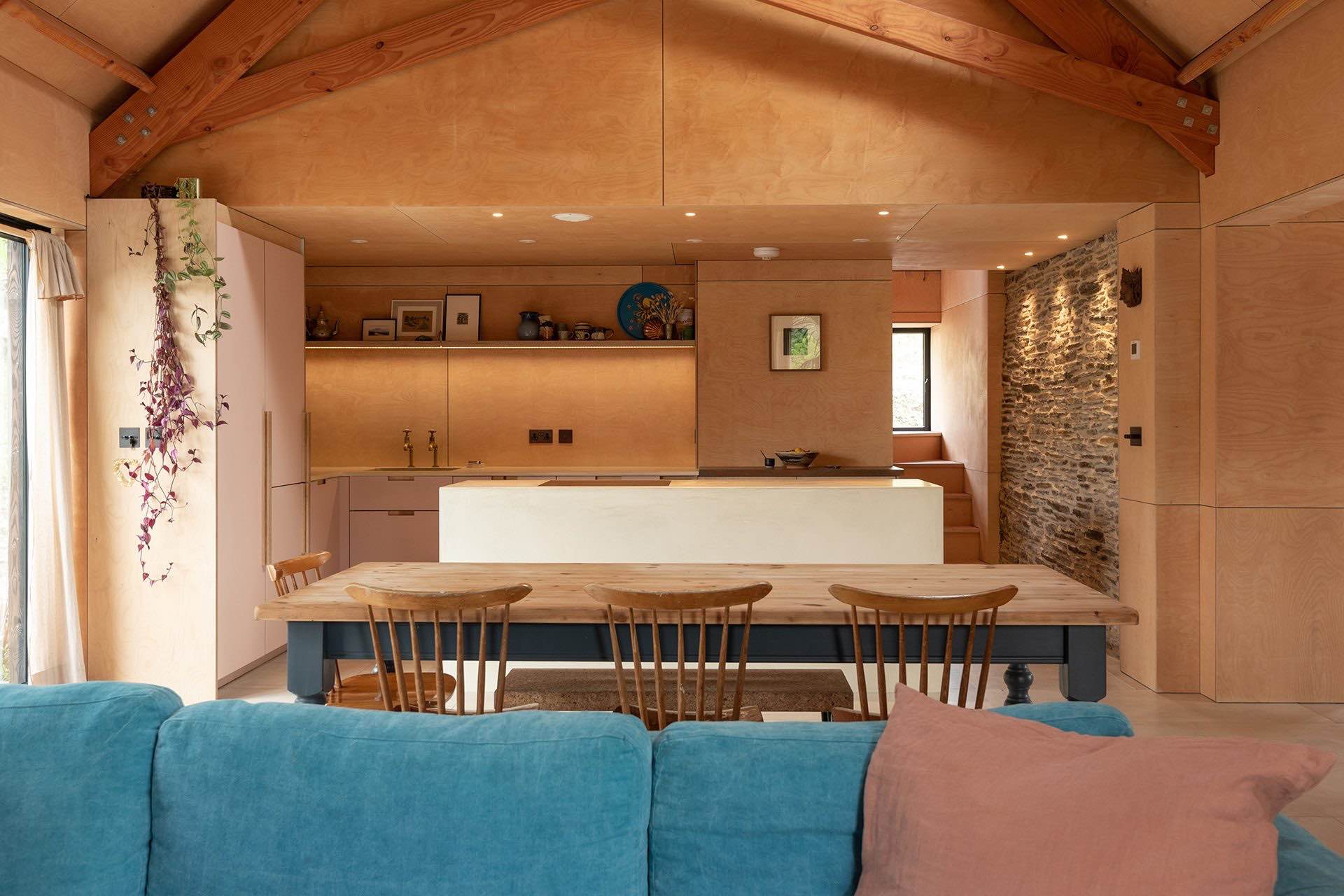 Kontrast materiałów to kluczowy element projektu: surowy kamień i tynk spotykają się z ciepłem jasnego drewna i sklejki, tworząc wnętrze o wyjątkowej taktylności. Podłogi wyłożono porcelanowymi płytkami z ogrzewaniem podłogowym, a cała konstrukcja została starannie ocieplona i uszczelniona, by zapewnić wysoką efektywność energetyczną w wymagającym, nadmorskim klimacie Kornwalii.