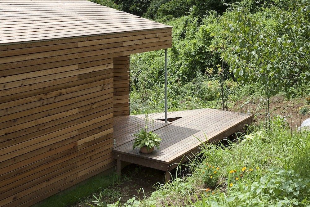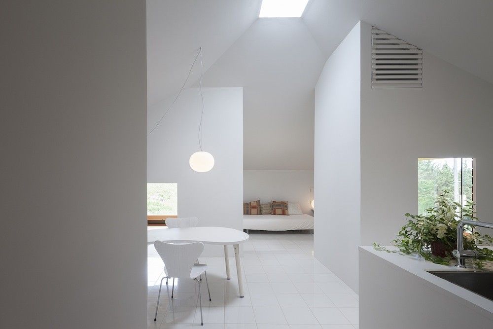 Od początku założono kompaktową bryłę domu na planie kwadratu, co pozwoliło spełnić zarówno założenia budżetowe, jak i funkcjonalne. Każde z niewielkich pomieszczeń otrzymało indywidualny charakter, wynikający z kierunku otwarcia i sposobu doświetlenia. „Soto-no-ma”, czyli pokój zewnętrzny, z niskim, płaskim sufitem, optycznie rozszerza przestrzeń ku krajobrazowi, podkreślając kontakt z naturą. Z kolei „Naka-no-ma” — pokój wewnętrzny — zwieńczony jest sufitem w kształcie piramidy, który wprowadza naturalne światło z góry i buduje wertykalne, kontemplacyjne wnętrze. Taki układ tworzy spójną, funkcjonalną architekturę domu, w której światło, forma i krajobraz współistnieją w równowadze.