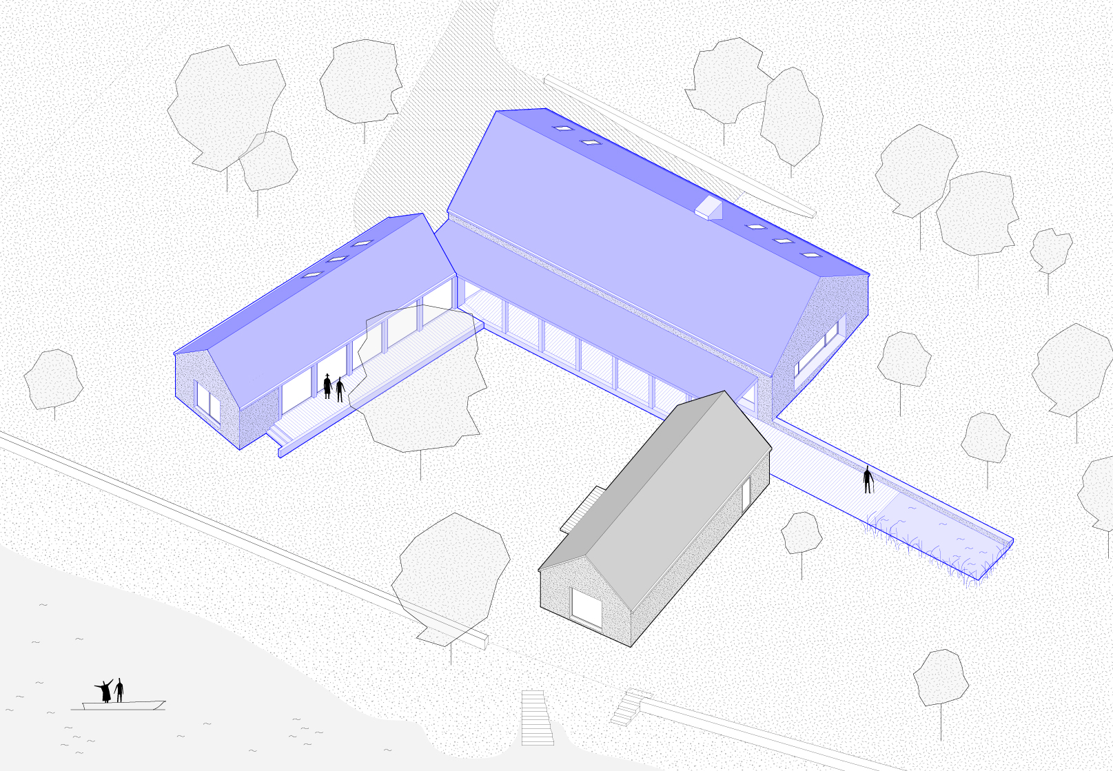 Nowa zagroda składa się z trzech prostych, prostokątnych budynków z dachami dwuspadowymi, których forma nawiązuje do historycznych zabudowań wiejskich. Istniejący dom oraz jego przeciwległy odpowiednik są mniejsze, natomiast centralna bryła – o rozmiarze dawnej stodoły – dominuje w całym założeniu. Wszystkie trzy budynki zostały połączone ciągłym zadaszonym gankiem, biegnącym wzdłuż przeszklonej elewacji głównego obiektu. To rozwiązanie sprzyja integracji wszystkich części i tworzy spójną kompozycję przestrzenną.